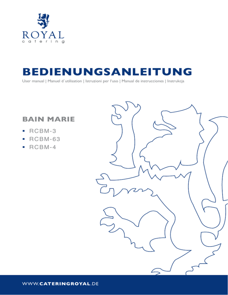 BEDIENUNGSANLEITUNG User manual | Manuel d´utilisation | Istruzioni per l‘uso | Manual de instrucciones | Instrukcja bain marie r c b m - 3 r c b m - 6 3 r c b m - 4 www.cateringroyal.de 1. Einleitung Das Bain Marie von Royal Catering ist ein neuartiger elektrischer Wärmebehälter, welcher durch heißes Wasser beheizt wird. Er besticht durch sein Design und seine Qualität. Für die Herstellung eines Bain Marie werden nur hochwertige Materialien verwendet. Er ist mit einem Thermostat ausgestattet, welches bis zu 80°C erhitzen kann. Die Modelle verfügen zusätzlich über Sicherheitsglas. Alle Modelle sind mit einem Abflusshahn ausgestattet. 2. Montage Inhalt | Contenu | Content | Contenuto | Contenido | Treść Entpacken Sie das Gerät und schrauben Sie die Abdeckung beidseitig an dem Gerät fest. Fügen Sie dazu die Vorderseite in die dafür vorgesehenen Vertiefungen ein und befestigen Sie die erste Querstange, um das Glas in Position zu halten. Befestigen Sie nun die zweite Querstange und fügen Sie die Oberseite der Abdeckung ein. Deutsch 3 English 5 VORSICHT: Ziehen Sie die Schrauben nicht zu fest an, das Glas könnte sonst zerbrechen. Français 8 3. Bedienung Italiano 11 Español 14 Polski 17 1. Stellen Sie vor der Benutzung sicher, dass Sie über einen dafür vorgesehenen Stromanschluss verfügen. 2. Betätigen Sie das Gerät nur auf festem Untergrund. 3. Füllen Sie das Innenelement mit Wasser. 4. Stellen Sie sicher, dass die Temperaturanzeige auf 0 steht. 5. Schalten Sie nun die Stromzufuhr ein. (grünes Lämpchen leuchtet) 6. Stellen Sie nun die Temperaturanzeige auf die gewünschte Temperatur ein. (oranges Lämpchen leuchtet) Die Temperatur passt sich automatisch an, wenn die Wassertemperatur fällt oder steigt. www.cateringroyal.de 3 4. Reinigung 1. Warten Sie, bis das Wasser sich abgekühlt hat. 2. Drehen Sie die Temperatur auf 0 und trennen Sie das Gerät vom Stromnetz. 3. Lassen Sie das Wasser ab. 4. Reiben Sie den Behälter mit einem Tuch sauber und trocken. 5. Achten Sie darauf, dass kein Wasser an das Kontrollpanel kommt. 6. Füllen Sie das Gerät mit Wasser, bevor Sie es das nächste Mal benutzen! Zuwiderhandlungen können zu Schäden am Gerät und zum Verlust der Garantie führen! 4 Modell Spannung Power (kW) Kapazität der Behälter Maße (mm) Gewicht (kg) Hinweise RCBM-3 230V, 50Hz 1.3 3x 1/2 100mm 950x365x330 17 Anti-SpritzSicherheitsglas RCBM-63 230V, 50Hz 1.8 6x 1/3 100mm 1215x365x330 21 Anti-SpritzSicherheitsglas RCBM-4 230V, 50Hz 1.8 4x 1/2 100mm 1215x365x330 21 Anti-SpritzSicherheitsglas user manual Bedienungsanleitung | Manuel d´utilisation | Istruzioni per l‘uso | Manual de instrucciones | Instrukcja BAIN MARIE www.cateringroyal.de 1. Assembly The Bain Marie will need to be unpacked and the sneeze guard fitted using a cross head screw driver. 1. Screw the two side supports onto machine. 2. Place front glass into slots and I cross bar in position to hold the glass in place Model Voltage Power (kW) Capacity containers Dimensions (mm) Weight (kg) Remarks RCBM-3 230V, 50Hz 1.3 3x 1/2 100mm 950x365x330 17 Glass sneeze guard RCBM-63 230V, 50Hz 1.8 6x 1/3 100mm 1215x365x330 21 Glass sneeze guard RCBM-4 230V, 50Hz 1.8 4x 1/2 100mm 1215x365x330 21 Glass sneeze guard 3. Fix second cross bar in place and slide top glass in 4. Please DO NOT tighten nuts too tight as glass may crack 2. Operation 1. Best use check correct electrical supply 2. Place on a strong level surface 3. If with water well above the internal element 4. Make sure temperature is a 0 5. Plug into power supply ( green light on) 6. Turn to required temperature (orange light on) The temperature will automatically cut in and out as the temperature of the water falls and rises. 3. Cleaning 1. Allow machines water to cool down first 2. Turn temperature to 0 and unplug the machine from the power 3. Drain water into container 4. Wipe clean with cloth 5. Please ensure no access water near controls 6. FILL MACHINE WITH WATER BEFORE NEXT OPERATION Failure to do this will burn out the element and void warranty. 6 7 1. Introduction Le Bain Marie de Catering Royal est un récipient thermique tout nouveau. Il est chauffé par de l´eau. Il se distingue par son design moderne et par sa qualité. Le bain marie est produit des matériaux de qualité supérieure. Il possède un thermostat qui va jusqu´à 80°C. De plus, nos bains maries sont équipés des couvercles de sécurité vitrés et un robinet de vidange. Mode d´emploi 2. Montage Bedienungsanleitung | Manuel d´utilisation | Istruzioni per l‘uso | Manual de instrucciones | Instrukcja Déballez l´appareil et montez le couvercle de protection vitré. D´abord, encastrez la face aux empreintes y correspondantes et fixez la première traverse afin de tenir le vitre à sa position. Fixez ensuite la deuxième traverse et encastrez le haut du couvercle de protection. bAIN MARIE ATTENTION: Ne vissez pas les vis trop fort, sinon la vitre pourrait craquer. 3. Utilisation 1. Avant de mettre l´appareil en marche, vérifiez que vous avez un raccordement électrique y correspondant. 2. N´utilisez l´appareil que sur un sol stable. 3.Versez de l´eau dans le réservoir. 4.Vérifiez que le thermostat est à 0. 5. Branchez maintenant l´appareil. (Lampe verte est allumée) 6. Ajustez maintenant le thermostat à la température désirée. (Lampe orange est allumée) Le thermostat s´ajuste automatiquement lorsque la température de l´eau change (baisse ou augmente). www.cateringroyal.de 9 4. Nettoyage 1. Attendez jusqu´à l´eau a refroidi 2. Mettez le thermostat à 0 et débranchez l´appareil du réseau électrique. 3. Faites couler l´eau. 4. Nettoyez et frottez le réservoir avec un torchon. 5. Faites attention que l´eau ne touche pas au panel front. Manuale di Istruzioni 6. Remplissez le réservoir d´eau avant de l´utiliser de nouveau! Bedienungsanleitung | Manuel d´utilisation | Istruzioni per l‘uso | Manual de instrucciones | Instrukcja Des infractions