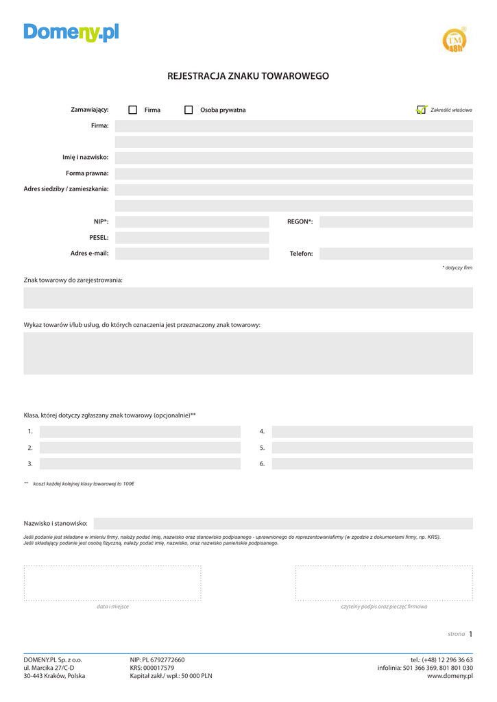 REJESTRACJA ZNAKU TOWAROWEGO Zamawiający: Firma Osoba prywatna Zakreślić właściwe Firma: Imię i nazwisko: Forma prawna: Adres siedziby / zamieszkania: REGON*: NIP*: PESEL: Adres e-mail: Telefon: * dotyczy firm Znak towarowy do zarejestrowania: Wykaz towarów i/lub usług, do których oznaczenia jest przeznaczony znak towarowy: Klasa, której dotyczy zgłaszany znak towarowy (opcjonalnie)** ** 1. 4. 2. 5. 3. 6. koszt każdej kolejnej klasy towarowej to 100€ Nazwisko i stanowisko: Jeśli podanie jest składane w imieniu firmy, należy podać imię, nazwisko oraz stanowisko podpisanego - uprawnionego do reprezentowaniafirmy (w zgodzie z dokumentami firmy, np. KRS). Jeśli składający podanie jest osobą fizyczną, należy podać imię, nazwisko, oraz nazwisko panieńskie podpisanego. data i miejsce czytelny podpis oraz pieczęć firmowa strona DOMENY.PL Sp. z o.o. ul. Marcika 27/C-D 30-443 Kraków, Polska NIP: PL 6792772660 KRS: 000017579 Kapitał zakł./ wpł.: 50 000 PLN 1 tel.: (+48) 12 296 36 63 infolinia: 501 366 369, 801 801 030 www.domeny.pl PEŁNOMOCNICTWO Składający podanie / Le déposant: Firma Osoba prywatna Zakreślić właściwe Firma: Imię i nazwisko: Forma prawna: Adres siedziby / zamieszkania: wyznacza jako swojego przedstawiciela / constitue(nt) pour mandataire DOMENY.PL Sp. z o. o. w procesie zgłaszania podań o znaki towarowe Benelux oraz podejmowaniu wszelakich działań związanych z biurem Benelux Trade Mark Office. / aux fins de déposer des marques Benelux et d'accomplir toutes prestations auprès du Bureau Benelux des Marques. Niżej podpisany wskazuje adres przedstawiciela, do którego będzie kierowana korespondencja. L soussigné(e)(s) élit(sent) domicile auprès de son (leur) mandataire, à qui toute correspondance doit être adressée. Nazwisko i stanowisko / Nom et qualité: Jeśli podanie jest składane w imieniu firmy, należy podać imię, nazwisko oraz stanowisko podpisanego - uprawnionego do reprezentowaniafirmy (w zgodzie z dokumentami firmy, np. KRS). Jeśli składający podanie jest osobą fizyczną, należy podać imię, nazwisko, oraz nazwisko panieńskie podpisanego. data / date miejsce / Lieu podpis(y) / Signature strona DOMENY.PL Sp. z o.o. ul. Marcika 27/C-D 30-443 Kraków, Polska NIP: PL 6792772660 KRS: 000017579 Kapitał zakł./ wpł.: 50 000 PLN 2 tel.: (+48) 12 296 36 63 infolinia: 501 366 369, 801 801 030 www.domeny.pl