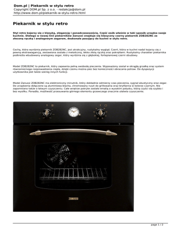 Dom.pl | Piekarnik w stylu retro Copyright DOM.pl Sp. z o.o. - [email protected] http://www.dom.pl/piekarnik-w-stylu-retro.html Piekarnik w stylu retro Styl retro kojarzy się z klasyką, elegancją i ponadczasowością. Część osób właśnie w taki sposób urządza swoje kuchnie. Dlatego w nowej linii piekarników Zanussi znajduje się klasyczny czarny piekarnik ZOB282NC ze złoconą rączką i analogowym zegarem, doskonale pasujący do kuchni w stylu retro. Cechą, która wyróżnia piekarnik ZOB282NC, jest atrakcyjny, rustykalny wygląd. Czerń, która w kuchni nadal kojarzy się z pewną ekstrawagancją, zestawiona została z metaliczną, lekko złotą rączką oraz pokrętłami. Rustykalny charakter piekarnika podkreśla wbudowany analogowy zegar, który wyróżnia się z głębokiej, fortepianowej czerni obudowy. Model ZOB282NC to piekarnik, który zapewnia pełną swobodę pieczenia. Wyposażony został w okrągłą grzałkę oraz system równomiernego rozprowadzania ciepła, dzięki czemu można piec bez konieczności obracania potraw. Do dyspozycji użytkownika jest także szereg innych funkcji. Model Zanussi ZOB282NC ma elektroniczny minutnik, który dokładnie odmierzy czas pieczenia, sygnał akustyczny oraz zegar. Do urządzenia dołączone są aluminiowa blacha, chromowany ruszt do grillowania oraz brytfanna w kolorze czarnym. Nie zapomniano także o łatwym czyszczeniu. Całe wnętrze pokryte zostało emalią o wysokim połysku, którą czyści się szybko i bez wysiłku. Ponadto, możliwość przesuwania górnego elementu grzewczego znacznie ułatwia czyszczenie. page 1 / 2 Dom.pl | Piekarnik w stylu retro Copyright DOM.pl Sp. z o.o. - [email protected] http://www.dom.pl/piekarnik-w-stylu-retro.html Piekarnik Zanussi ZOB282NC: - szerokość: 60 cm - pojemność 57 l - 4 poziomy pieczenia - funkcje piekarnika: ogrzewanie dolne | dwuobwodowy grill | nawiew powietrza + grill | nawiew powietrza + grill + ogrzewanie górne + ogrzewanie dolne | grill | grill + rożen |ogrzewanie górne + dolne - funkcje elektroniczne piekarnika: sygnał akustyczny | zegar | minutnik | stop - klasa energetyczna: A - analogowy zegar - wnętrze pokryte łatwą w czyszczeniu emalią - wentylator chłodzący - obrotowy rożen - dołączona brytfanna oraz blacha aluminiowa - chromowany ruszt do grillowania - kolor: czarny - Sugerowana cena brutto: 1 899 PLN page 2 / 2
