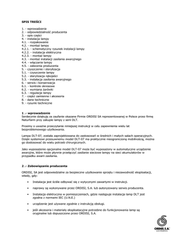 SPIS TREŚCI 1. - wprowadzenie 2. - odpowiedzialność producenta 3. - opis części 4. - instalacja lampy 4.1. - rozpakowanie 4.2. - montaż lampy 4.2.1. - schematyczny rysunek instalacji lampy 4.2.2. - instalacja elektryczna 4.2.3. - montaż lampy 4.3. - montaż instalacji zasilania awaryjnego 4.4. - włączanie lampy 4.5. - zalecenia producenta 5. - czyszczenie i sterylizacja 5.1. - czyszczenie lampy 5.2. - sterylizacja rękojeści 5.3. - instalacja zasilania awaryjnego 6. - serwis i konserwacja 6.1. - kontrole okresowe 6.2. - wymiana żarówki 6.3. - regulacja lampy 7. - części zamienne i akcesoria 8. - dane techniczne 9. - rysunki techniczne 1 .- wprowadzenie Serdecznie dziękuję za zaufanie okazane Firmie ORDISI SA reprezentowanej w Polsce przez firmę Naturfarm przy zakupie lampy z serii DLT. Prosimy o uważne przeczytanie niniejszej instrukcji w celu zapewnienia wielu lat bezproblemowego użytkowania. Lampa DLT-07, została zaprojektowana do zastosowań w średnich i małych salach operacyjnych. Dzięki systemowi przesuwnemu model DLT-07 ma praktycznie nieograniczoną mobilnością, można go dostosować do wielu potrzeb chirurgicznych. Jako wyposażenie opcjonalne model DLT-07 może być wyposażony w automatyczne urządzenie awaryjne, które może płynnie przełączyć zasilanie sieciowe lampy na sieci akumulatorów w przypadku awarii zasilania. 2 .- Zobowiązanie producenta ORDISI, SA jest odpowiedzialne za bezpieczne użytkowanie sprzętu i niezawodność eksploatacji, wtedy, gdy: • Instalacja jest ściśle odbywać się z wytycznymi zawartymi w instrukcji. • naprawy są wykonywane przez ORDISI, S.A. lub autoryzowany serwis producenta. • Instalacja elektryczna w pomieszczeniach, gdzie następuje instalacja lamp DLT jest zgodna z normami IEC (U.N.E.) • urządzenie jest używane zgodnie z instrukcją obsługi. • jeśli akcesoria i materiały eksploatacyjne potrzebne do funkcjonowania lamp są oryginalne lub dopuszczone przez ORDISI, S.A. 3 .- Opis części 1 .- uchwyt sterylizowalny, regulator wielkości plamy świetlej, 2 .- otwieranie obudowy celem wymiany żarówki halogenowej, 3 .- mocowanie sterylizowalnego uchwytu 4 .- ekran tylny kopuły 5 .- czasza skupiająca 6 .- regulator wielkości plamy świetlnej 7 .- jarzmo 8 .- kopuła lampy 9 .- pionowe ramię 10 .- poziome ramię 11 .- ramie uchylne 12. - ramie krótkie 13a .- regulacja śrubowa potrzebna do pionowego ustawiania lampy 13b.-regulacja śrubowa potrzebna do poziomego ustawiania lampy 14 .- zawias powalający na obniżanie i podnoszenie lampy 15.- ochronny kapturek na śrubę 16 .- zawias pozwalający na pionowe położenie jarzma 17 .- Osłona części montowanej na stropie. 3 .- Instalacja 4.1 .- rozpakowywanie Po otrzymaniu sprzętu, należy sprawdzić czy produkt nie ma jakichkolwiek uszkodzeń wynikłych z transportu. W przypadku zauważenia uszkodzeń należy zwrócić się do autoryzowanego serwisu technicznego producenta. 4.2. - Montaż 4.2.1. - Instalacja urządzenia Lampa może być zainstalowana na suficie na różne sposoby. Przed rozpoczęciem jakichkolwiek prac instalacyjnych należy sprawdzić: 1. Wysokość stropu lub sufitu podwieszanego: 3 i 3,5 m, mierząc od podłoża. Sufit podwieszany może być oddalony od belki stropowej od 10 do 30 cm. Optymalna wysokość dla sufitu podwieszanego jest 3,00 m. Jeśli powyższe warunki nie są spełnione, skontaktuj się z dystrybutorem ORDISI przed rozpoczęciem instalacji. Instalacja na betonowym stropie: (Rys. 2 i Rys. 3) Umieść 4 śruby (28) z gwintem, minimum 15 cm głębokości w stropie. Zainstaluj (32) płytę mocującą urządzenie na stabilnej podstawie dystansującej (surowce: drewno, metal, pcv). Przykręć podstawę lampy (32) do belki nośnej stropu poprzez podstawę dystansującą (pamiętaj o podkładkach). Jej dolna część (32) musi pozostać na tym samym poziomie co widoczna część sufitu podwieszanego. Instalacja bezpośrednio w stropie: (Rys. 2 i Rys. 4..). Się Przykręć podstawę lampy (32) do belki nośnej stropu poprzez 4 śruby - minimum 15 cm głębokości w stropie. Patrz rys 5. Zamocuj podstawę śrubami pamiętając o podkładkach. Niezależnie od wybranego systemu montażu należy pamiętać że: 1. Osoba wykonująca montaż musi zapewnić, iż zawieszenie zdolne jest udźwignąć maksymalne obciążenie do 350 kg. 2. Płyta mocująca lampę (32) przymocowana jest idealnie równo do podstawy a po przykręceniu lampy, nie ma luzów montażowych. 4.2.2. - instalacja elektryczna Instalacja elektryczna w pomieszczeniu, w którym zamierzasz używać urządzenie powinna być zgodna z zasadami UNE (CIS). Jak również z wytycznymi dotyczącymi układów niskonapięciowych. Układ elektryczny do którego podłączasz lampę musi być wyposażony w wyłącznik ścienny. Lampa musi pracować w uziemionym układzie elektrycznym. 4.2.3. - montaż lampy Lampa dostarczana jest demontowane na trzy części (Rys. 7): Część "A": pionowe ramię, lampa z płytką mocującą i maskownicą. Część "B": poziome ramię, ramie uchylne, ramie krótkie. Część "C": kotwę do łączenia z ramieniem krótkim, jarzmo do mocowania lampy i kopuły. Część "B" W celu zabezpieczenia lampy w transporcie ramiona części "B" nie rozwierają się w pionie. Nie należy na siłę rozwierać ramion system. Aby zamontować lampę uprzednio zamontuj płytę mocującą na belce stropowej (32). Montaż części "A": 1. przykręć płytę mocującą (32) do przygotowanego podłoża używając podkładek (35) i śrub z łbami sześciokątnymi (36). Dokręcić śruby. Podłączyć lampę do sieci elektrycznej (patrz punkt 4.2.2.) upewniając się uprzednio, że przełącznik jest w pozycji OFF. Poprzez części dystansujące (37) dokręć osłonę sufitową. Montaż części "B": Na śrubę na końcu części "A" należy zamontować ramie poziomie (22). Zamontuj obydwa ramiona zanim przejdziesz do następnego kroku. Montaż części "C": Zdejm