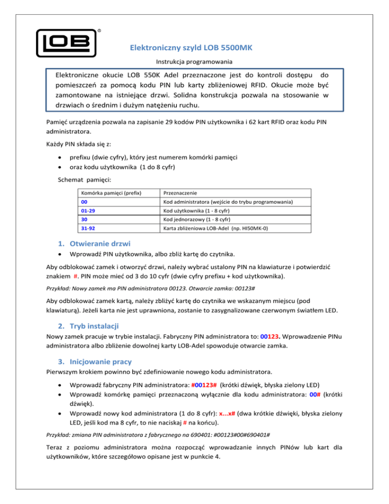 Elektroniczny szyld LOB 5500MK Instrukcja programowania Elektroniczne okucie LOB 550K Adel przeznaczone jest do kontroli dostępu do pomieszczeń za pomocą kodu PIN lub karty zbliżeniowej RFID. Okucie może być zamontowane na istniejące drzwi. Solidna konstrukcja pozwala na stosowanie w drzwiach o średnim i dużym natężeniu ruchu. Pamięć urządzenia pozwala na zapisanie 29 kodów PIN użytkownika i 62 kart RFID oraz kodu PIN administratora. Każdy PIN składa się z: prefixu (dwie cyfry), który jest numerem komórki pamięci oraz kodu użytkownika (1 do 8 cyfr) Schemat pamięci: Komórka pamięci (prefix) Przeznaczenie 00 Kod administratora (wejście do trybu programowania) 01‐29 Kod użytkownika (1 ‐ 8 cyfr) 30 Kod jednorazowy (1 ‐ 8 cyfr) 31‐92 Karta zbliżeniowa LOB‐Adel (np. HI50MK‐0) 1. Otwieranie drzwi Wprowadź PIN użytkownika, albo zbliż kartę do czytnika. Aby odblokować zamek i otworzyć drzwi, należy wybrać ustalony PIN na klawiaturze i potwierdzić znakiem #. PIN może mieć od 3 do 10 cyfr (dwie cyfry prefixu + kod użytkownika). Przykład: Nowy zamek ma PIN administratora 00123. Otwarcie zamka: 00123# Aby odblokować zamek kartą, należy zbliżyć kartę do czytnika we wskazanym miejscu (pod klawiaturą). Jeżeli karta nie jest uprawniona, zostanie to zasygnalizowane czerwonym światłem LED. 2. Tryb instalacji Nowy zamek pracuje w trybie instalacji. Fabryczny PIN administratora to: 00123. Wprowadzenie PINu administratora albo zbliżenie dowolnej karty LOB‐Adel spowoduje otwarcie zamka. 3. Inicjowanie pracy Pierwszym krokiem powinno być zdefiniowanie nowego kodu administratora. Wprowadź fabryczny PIN administratora: #00123# (krótki dźwięk, błyska zielony LED) Wprowadź komórkę pamięci przeznaczoną wyłącznie dla kodu administratora: 00# (krótki dźwięk). Wprowadź nowy kod administratora (1 do 8 cyfr): x...x# (dwa krótkie dźwięki, błyska zielony LED, jeśli kod ma 8 cyfr, to nie naciskaj # na końcu). Przykład: zmiana PIN administratora z fabrycznego na 690401: #00123#00#690401# Teraz z poziomu administratora można rozpocząć wprowadzanie innych PINów lub kart dla użytkowników, które szczegółowo opisane jest w punkcie 4. Jeśli nie będą wprowadzane inne kody PIN lub karty, należy nacisnąć *** (trzy razy gwiazdkę), by wyjść z trybu programowania. Po wykonaniu wyżej opisanej zmiany kodu administratora z fabrycznego na docelowy, fabryczny kod przestaje otwierać zamek. W celu otwarcia zamka należy zaprogramować PINy użytkowników lub karty według procedury opisanej w dalszej części instrukcji. 4. Programowanie kodów PIN użytkownika Wprowadź PIN administratora: #PIN_administratora# (krótki dźwięk, błyska zielony LED) Wprowadź komórkę pamięci właściwą dla użytkowników (01‐29): xx# (krótki dźwięk) Wprowadź kod użytkownika (1 do 8 cyfr): x..x# (dwa krótkie dźwięki, błyska zielony LED, jeśli kod ma 8 cyfr, to nie naciskaj # na końcu). Przykład zaprogramowania PIN 1203 w komórce pamięci 03: #690401#03#1203#. Wyjście z trybu programowania ***. Sprawdzenie działania PIN: 031203# Teraz można rozpocząć wprowadzanie innych kodów lub kart rozpoczynając od kolejnego numeru komórki pamięci. Jeśli nie będą wprowadzane żadne inne kody, należy nacisnąć ***, by wyjść z trybu programowania. W komórce pamięci 30 można zaprogramować kod jednorazowy. Po użyciu, kod ten traci ważność i po raz drugi nie otworzy zamka. 5. Programowanie kart/breloków użytkownika Do otwierania zamka można użyć kart LOB‐Adel (np. HI50MK‐0). Wprowadź PIN administratora: #PIN_administratora# (krótkie dźwięki, zapala się zielony LED) Wprowadź komórkę pamięci użytkownika (31‐92): xx# (krótki dźwięk, świeci się zielony LED a w tle miga czerwony LED ) Zbliż kartę do czytnika (dwa krótkie dźwięki, błyska zielony LED). Teraz można kontynuować wprowadzanie innych kart rozpoczynając od numeru komórki pamięci właściwego dla kart (31‐92). Jeśli nie będą wprowadzane żadne inne karty, należy nacisnąć ***, by wyjść z trybu programowania. Jeśli karta RFID nie jest kartą LOB‐Adel , albo jest już zapamiętana w innej komórce pamięci, to zamek wyda dźwięk i błyśnie czerwony LED. Jeśli numer komórki pamięci jest już zajęty, to zamek wyda podwójny dźwięk i błyśnie czerwony LED. Zamek wróci do trybu programowania. Wprowadź wolną komórkę pamięci, aby kontynuować. 6. Kasowanie kodu PIN/karty użytkownika Wprowadź PIN administratora: #PIN_administratora# (krótki dźwięk, błyska zielony LED) Wprowadź komórkę pamięci właściwą dla kodu użytkownika lub karty/breloka (01‐92): xx* (zamek wyda dźwięk gwizdnięcia). Teraz można kontynuować kasowanie innych kodów lub kart rozpoczynając od numeru komórki pamięci, albo nacisnąć ***, by wyjść z trybu programowania. ! Jeśli zostanie skasowany kod administratora (komórka pamięci 00), to stracą ważność wszystkie zaprogramowane karty/Kody PIN, a zamek wejdzie do trybu instalacji opisanego wcześniej. 7. Tryb swobodnego przejścia Jeśli w ciągu 5 sekund od prawidłowego otwarcia drzwi (czyli po wprowadzeniu ważnego kodu PIN użytkownika lub karty) zostanie wciśnięty klawisz 0, to zamek włączy tryb swobodnego przejścia. W tym trybie do otwarcia drzwi nie trzeba wprowadzać żadnego kodu. Wystarczy jedynie nacisnąć klamkę. Tryb swobodnego przejścia jest sygnalizowany cyklicznym błyskaniem zielonej diody LED. Ponowne wprowadzenie ważnego kodu PIN lub karty kończy tryb swobodnego przejścia (blokuje zamek). 8. Przywrócenie trybu instalacji/pracy w trybie fabrycznym (powrót do PINu 00123#) Przywrócenie stanu fabrycznego możliwe jest na dwa sposoby: 1. Znany jest PIN administratora Wprowadź: #PIN_administratora# oraz 00* (zero‐zero‐gwiazdka) Będzie słyszalny sygnał (trzy gwizdnięcia) potwierdzający skasowanie poprzednich ustawień zamka i przywrócenie t