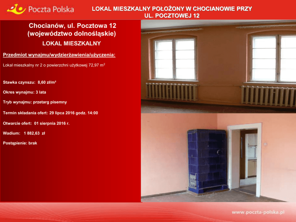 LOKAL MIESZKALNY POŁOŻONY W CHOCIANOWIE PRZY UL. POCZTOWEJ 12 Chocianów, ul. -Pocztowa 12 (województwo dolnośląskie) LOKAL MIESZKALNY Przedmiot wynajmu/wydzierżawienia/użyczenia: Lokal mieszkalny nr 2 o powierzchni użytkowej 72,97 m 2 Stawka czynszu: 8,60 zł/m² Okres wynajmu: 3 lata Tryb wynajmu: przetarg pisemny Termin składania ofert: 29 lipca 2016 godz. 14:00 Otwarcie ofert: 01 sierpnia 2016 r. Wadium: 1 882,63 zł Postąpienie: brak • Zdjęcie przedmiotu wynajmu Kliknij i zlokalizuj na mapie Opis przedmiotu wynajmu: Lokal mieszkalny Nr 2 usytuowany na I piętrze budynku Poczty Polskiej S.A w miejscowości Chocianów przy ul. Pocztowej 12, powierzchni użytkowej 72,97 m². Składający się z kuchni, 3 pokoi, przedpokoju, łazienki z wc. Wyposażony jest w instalację wodno– kanalizacyjną, elektryczną oraz centralnego ogrzewania. Niezależnie od czynszu Najemca będzie ponosił opłaty za wodę, nieczystości płynne, gospodarowanie odpadami komunalnymi oraz centralnego ogrzewania. Opis nieruchomości: Miejscowość Chocianów Ulica, nr budynku Pocztowa 12 Powierzchnia budynku, w którym zlokalizowany jest przedmiot wynajmu 623,61 m² Nr działki ewidencyjnej, obręb 132, obręb 0003 Księga wieczysta, Sąd Rejonowy, Nr Wydziału LE1U/00004416/1 Stan prawny gruntu Własność Skarbu Państwa w użytkowaniu wieczystym Poczty Polskiej S.A. do dnia 5 grudnia 2089 r. Lokalizacja i dostępność komunikacyjna: Nieruchomość położona jest w miejscowości Chocianów przy ul. Pocztowej 12. Miasto położone w województwie dolnośląskim, powiecie polkowickim, gminie Chocianów. Chocianów położony jest w pobliżu Parku Krajobrazowego w otoczeniu lasów. Miejscowość jest także, znana jako miejsce sezonowego zbierania runa leśnego (jagody, borówki, grzyby). Chocianów leży przy drogach wojewódzkich Nr 328 oraz 331. Miejscowość jest siedzibą gminy. • Mapa sytuacyjna miejscowości Opis nieruchomości: Nieruchomość ewidencyjnie oznaczona nr 132 o powierzchni 1047 m2 obręb 0003, dla której Sąd Rejonowy w Lubinie, V Wydział Ksiąg Wieczystych prowadzi księgę wieczystą nr LE1U/00004416/1. Przedmiotowa nieruchomość gruntowa jest własnością Skarbu Państwa w użytkowaniu wieczystym Poczty Polskiej S.A. do 5 grudnia 2089 r. • Zdjęcia budynków • Zdjęcia nieruchomości OBWIESZCZENIE O PRZETARGU PISEMNYM NA NAJEM LOKALU MIESZKALNEGO Wynajmujący: Poczta Polska S.A. z siedzibą w Warszawie, 00-940 Warszawa, ul. Rodziny Hiszpańskich 8. Prowadzący przetarg: Poczta Polska S.A., Pion Infrastruktury Obszar Operacyjny ds. Nieruchomości we Wrocławiu, ul. Awicenny 21, 50 -900 Wrocław. Miejsce przetargu: Poczta Polska S.A., Pion Infrastruktury Obszar Operacyjny ds. Nieruchomości we Wrocławiu ul. Awicenny 21, 50 -900 Wrocław– pokój Nr 202, II piętro. Okres trwania umowy– 3 lata. Przedmiot najmu: Lokal mieszkalny Nr 2 usytuowany na I piętrze budynku Poczty Polskiej S.A w miejscowości Chocianów przy ul. Pocztowej 12, powierzchni użytkowej 72,97 m². Składający się z kuchni, 3 pokoi, przedpokoju, łazienki z wc. Wyposażony jest w instalację wodno– kanalizacyjną, elektryczną oraz centralnego ogrzewania. Wywoławcza stawka czynszu – 8,60 zł/m² Stawka wywoławcza czynszu najmu nie obejmuje opłat eksploatacyjnych za energię elektryczną, kosztów ogrzewania, zużycia wody oraz opłat za wywóz nieczystości stałych i odprowadzenia nieczystości płynnych. Wadium – 1 882,63 zł (słownie jeden tysiąc osiemset osiemdziesiąt dwa zł 63/100). Wadium należy wnieść w gotówce, przelewem na konto w Banku Pocztowym S.A. w Bydgoszczy, Nr konta: 85 1320 0019 0099 0718 2000 0025 tytułem: PI we Wrocławiu– przetarg na wynajem lokalu mieszkalnego w miejscowości Chocianów – lok. 2, nie później niż do 28 lipca 2016 roku, przy czym jako termin wpłaty rozumiany jest termin uznania rachunku Poczty Polskiej S.A. Szczegółowe informacje na temat przetargu i warunków najmu zawarte w projekcie umowy najmu, z którymi można się zapoznać w siedzibie Pionu Infrastruktury Obszar Operacyjny ds. Nieruchomości we Wrocławiu, ul. Ibn Siny Awicenny 21, 50 -900 Wrocław, pokój Nr 206, II piętro, tel. 71 360-39-70, w dni powszednie w godzinach od 7.00-15.00. Miejsce, termin i tryb składania ofert: Oferty dotyczące przetargu pisemnego należy składać w zamkniętych kopertach w siedzibie prowadzącego przetarg sekretariacie (pokój 102) do dnia 29 lipca 2016 roku do godz. 14ºº z dopiskiem: „Oferta na najem lokalu mieszkalnego w miejscowości Chocianów, ul. Pocztowa 12 termin 28.07.2016 r. Otwarcie ofert nastąpi w następnym dniu roboczym po upływie terminu składania ofert określonego w ogłoszeniu, w siedzibie prowadzącego procedurę pok. 202 godz. 10ºº. Warunkiem przystąpienia do przetargu jest: Wniesienie wadium przelewem na rachunek bankowy w Banku Pocztowym S. A. w Bydgoszczy nr konta: 85 1320 0019 0099 0718 2000 0025 w terminie do dnia 28 lipca 2016 r., przy czym jako termin wpłaty rozumiany jest termin uznania wpłaty na rachunek Poczty Polskiej S.A. Złożenie przez Oferenta oświadczenia o zapoznaniu się z treścią obwieszczenia o przetargu oraz ze stanem technicznym lokalu przeznaczonego do wynajmu, a także z treścią projektu umowy najmu i przyjęciu ich bez zastrzeżeń. Do oświadczenia należy przedłożyć kserokopię dowodu osobistego. W przypadku przystąpienia do przetargu przez jednego z małżonków, konieczne jest przedłożenie pisemnego wyrażenia zgody współmałżonka na przystąpienie do przetargu z zamiarem najmu lokalu mieszkalnego będącego przedmiotem przetargu, ze środków pochodzących z majątku wspólnego, za cenę ustaloną w przetargu. W przypadku osób prawnych i jednostek organizacyjnych nieposiadających osobowości prawnej, osoba reprezentująca biorąca udział w przetargu zobowiązana jest do okazania dowodu osobistego oraz odpowiednich dokumentów potwierdzających uprawnienie 