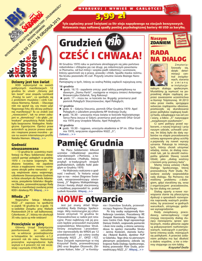 „S OL ID AR 20 NO 15 ŚC I” KOD wykorzystał na swoich politycznych manifestacjach 12 grudnia br. utwór „Dziwny jest ten świat” oraz zespołu Lombard „Przeżyj to sam”, co spotkało się z protestem muzyków i córki Czesława Niemena, Natalii. – Dlaczego nikt nie spytał się, czy może użyć flagowego hitu dla okrasy politycznej manifestacji? To co zrobili owi „nowocześni”, tak na amen zabujani w „demokracji” i do głębi „zatroskani” przyszłością Polski ludzie było bezprawne. Nielegalne. Nielogiczne. Egoistyczne. Oprócz praw autorskich są jeszcze prawa osobiste i niepisane prawo moralne – pisze na swoim internetowym profilu Natalia Niemen. Więcej...>> Godność nieuszanowana – 13 grudnia br. uczestnicy manifestacji na Placu Solidarności zbeszcześcili pamięć poległych w grudniu 1970 r. i w stanie wojennym. Nie złożono kwiatów, nie zapalono znicza a wygłaszano mowy i wznoszono okrzyki pełne nienawiści – piszą więźniowie stanu wojennego, członkowie Stowarzyszenia Godność w liście otwartym do Pawła Adamowicza, prezydenta Gdańska i Bogdana Oleszka, przewodniczącego Rady Miasta o manifestacji zwołanej przez KOD i działaczy PO. Więcej…>> Młoda „S” Regionalna Sekcja Młodych NSZZ „S” zaprasza na spotkanie w piątek 18 grudnia br. o godz. 15 w siedzibie Związku przy Wałach Piastowskich 24 w sali balkonowej. Członkowie „S”, którzy nie ukończyli 35 roku życia są mile widziani! Przeciętnie w górę Główny Urząd Statystyczny poinformował, że zatrudnienie w sektorze przedsiębiorstw w listopadzie br. wzrosło o 1,2 procent rok do roku. Natomiast przeciętne wynagrodzenie było wyższe o 4 procent niż rok wcześniej i wyniosło 4163,98 zł. 3,99 zł Tyle zapłacimy przed Świętami za litr oleju napędowego na stacjach benzynowych. Notowania ropy naftowej spadły poniżej psychologicznej bariery 40 USD za baryłkę. Naszym ZDANIEM Grudzień CZEŚĆ I CHWAŁA! RADA NA DIALOG W Grudniu 1970 roku w państwie określającym się jako państwo robotników i chłopów po raz drugi, po robotniczym powstaniu w Poznaniu, od kul milicji i wojska padli robotnicy i uczniowie, którzy upomnieli się o pracę, prawdę i chleb. Spadła maska reżimu. Na bruku pozostało 45 ciał. Przyszły smutne świata Bożego Narodzenia. Pamiętajmy o tych, którzy za wolną Polskę zapłacili najwyższą cenę. 16 grudnia godz. 16.15 –zapalenie zniczy: pod tablicą pamiątkową na dawnym „Domu Partii”, następnie w miejscu śmierci Antoniego Browarczyka (Gdańsk, Targ Rakowy) godz. 17 – msza św. w kościele św. Brygidy; przemarsz pod pomnik Poległych Stoczniowców; Apel Poległych; 17 grudnia godz. 6 – Gdynia Stocznia, pomnik Ofiar Grudnia 1970: Apel Poległych z udziałem prezydenta RP Andrzeja Dudy; godz. 16.30 – uroczysta msza święta w kościele Najświętszego Serca Pana Jezusa w Gdyni; przemarsz pod pomnik Ofiar Grudnia 1970 przy Urzędzie Miasta; Apel Poległych; 18 grudnia godz. 10.30 – Łęgowo, uroczysta akademia w SP im. Ofiar Grudnia 1970, wręczenie stypendiów NSZZ „S”; Zobacz…>> Pamięć Grudnia Na Placu Solidarności kilkuset uczniów i kilkadziesiąt pocztów sztandarowych z Pomorza, a nawet z Krakowa i Podhala, którzy przybyli w tradycyjnych strojach podhalańskich, oddało hołd poległym w Grudniu 1970. – Na Wybrzeżu walczono o godność i wolność. Ta historia wciąż żyje w nas – mówi Zbigniew Świerczek, wiceprzewodniczący oświatowej „S” Regionu Małopolskiego. Znicze i kwiaty złożyli stoczniowcy, a modlitwę poprowadził ks. prałat Ludwik Kowalski. Więcej...>> FOT. PAWEŁ GLANERRT DN IA BI NS UL ZZ ET YN RE GI INF ON O R GD MA GR AŃS CYJN U KI Y iB iS sk. skr. NR skrót. 50 skróte. (249 skrótem ) 16 IN TE RN ET OW Y Dziwny jest ten świat WYDRUKUJ I WYWIEŚ W GABLOTCE! NOWE otwarcie Jest już znany skład Wojewódzkiej Rady Dialogu Społecznego. Akty nominacyjne jej członkowie otrzymali 14 grudnia br. Przewodnictwo w radzie jest rotacyjne. Przez najbliższy rok jej pracom będzie przewodził marszałek województwa Mieczysław Struk. Strony związkowa i pracodawców wprowadziły do WRDS po 12 przedstawicieli – po cztery osoby wskazały NSZZ „S”, OPZZ i FZZ. Nasz Związek reprezentuje w niej Krzysztof Dośla, przewodniczący ZRG oraz Bogdan Olszewski, Zbigniew Koban, lider „S” w Kwidzy- nie i Stanisław Szukała, przewodniczący Regionu Słupskiego. Po trzy osoby wytypowały Konfederacja Lewiatan, Pracodawcy RP, Związek Rzemiosła Polskiego i Business Centre Club. Rząd reprezentuje Dariusz Drelich, wojewoda pomorski i dwie inne osoby, a strona samorządowa to oprócz marszałka Struka – Janina Kwiecień, starosta kartuska i Roland Budnik, dyrektor PUP w Gdańsku. Tego dnia na pierwszym plenarnym posiedzeniu zebrała się krajowa Rada Dialogu Społecznego, której przewodzi Piotr Duda, przewodniczący NSZZ „S”. Więcej...>> Zmaterializowały się, dzięki determinacji central związkowych, starania o zmianę w instytucjonalnym dialogu społecznym. Musieliśmy ją wymusić na poprzedniej ekipie rządzącej poprzez zawieszenie uczestnictwa w Komisji Trójstronnej. W 2013 roku przez media, sprzyjające wówczas rządzącemu obozowi, przetoczyło się skandowanie przez polityków rządzącej koalicji hasła, odsądzające nas od czci i wiary, a lidera „S” nazywające „związkowym oszołomem”. Ci sami politycy przed wyborami, z naszej inspiracji i przy naszym udziale, uchwalili ustawę. Im bliżej było do daty wyborów na etapie procedowania ustawy agresywne głosy ucichły a pojawiały się nawet wyrazy uznania. Pokazuje to intencje, tych, którzy chcieli utrzymać władzę, mimo, że dialog rozumieli tak, jak to określił metropolita gdański Sławoj Leszek Głódź, jako „dialog woźnicy z koniem przy pomocy bata”. Mamy nową ustawę i Radę Dialogu Społecznego, której przewodniczy Piotr Duda. Powołane zostały wojewódzkie rady dia