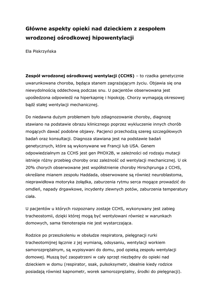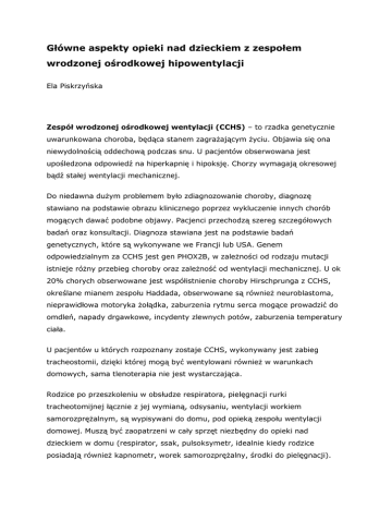 Główne aspekty opieki nad dzieckiem z zespołem wrodzonej ośrodkowej hipowentylacji Ela Piskrzyńska Zespół wrodzonej ośrodkowej wentylacji (CCHS) – to rzadka genetycznie uwarunkowana choroba, będąca stanem zagrażającym życiu. Objawia się ona niewydolnością oddechową podczas snu. U pacjentów obserwowana jest upośledzona odpowiedź na hiperkapnię i hipoksję. Chorzy wymagają okresowej bądź stałej wentylacji mechanicznej. Do niedawna dużym problemem było zdiagnozowanie choroby, diagnozę stawiano na podstawie obrazu klinicznego poprzez wykluczenie innych chorób mogących dawać podobne objawy. Pacjenci przechodzą szereg szczegółowych badań oraz konsultacji. Diagnoza stawiana jest na podstawie badań genetycznych, które są wykonywane we Francji lub USA. Genem odpowiedzialnym za CCHS jest gen PHOX2B, w zależności od rodzaju mutacji istnieje różny przebieg choroby oraz zależność od wentylacji mechanicznej. U ok 20% chorych obserwowane jest współistnienie choroby Hirschprunga z CCHS, określane mianem zespołu Haddada, obserwowane są również neuroblastoma, nieprawidłowa motoryka żołądka, zaburzenia rytmu serca mogące prowadzić do omdleń, napady drgawkowe, incydenty zlewnych potów, zaburzenia temperatury ciała. U pacjentów u których rozpoznany zostaje CCHS, wykonywany jest zabieg tracheostomii, dzięki której mogą być wentylowani również w warunkach domowych, sama tlenoterapia nie jest wystarczająca. Rodzice po przeszkoleniu w obsłudze respiratora, pielęgnacji rurki tracheotomijnej łącznie z jej wymianą, odsysaniu, wentylacji workiem samorozprężalnym, są wypisywani do domu, pod opieką zespołu wentylacji domowej. Muszą być zaopatrzeni w cały sprzęt niezbędny do opieki nad dzieckiem w domu (respirator, ssak, pulsoksymetr, idealnie kiedy rodzice posiadają również kapnometr, worek samorozprężalny, środki do pielęgnacji). Niestety jest to bardzo ciężka choroba, a chorzy wymagają stałej opieki, często jeden z opiekunów musi zrezygnować z pracy, aby zająć się chorym dzieckiem. Rozwój medycyny nie daje szans na wyzdrowienie ale na ułatwienie życia chorym z CCHS, jedną z opcji jest wszczepienie stymulatora nerwów przeponowych, niestety jest to zabieg dość drogi i na dzień dzisiejszy nie wykonywany w Polsce. Trwają również badania nad lekiem na CCHS jest to jednak wciąż kwestia otwarta.