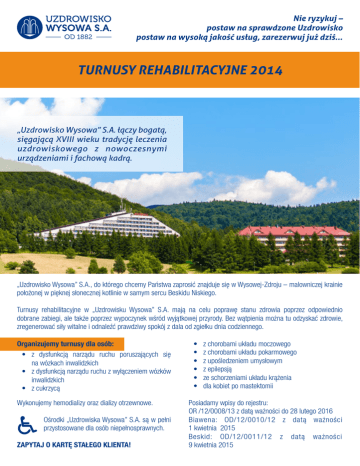 Nie ryzykuj – postaw na sprawdzone Uzdrowisko postaw na wysoką jakość usług, zarezerwuj już dziś... TURNUSY REHABILITACYJNE 2014 „Uzdrowisko Wysowa” S.A. łączy bogatą, sięgającą XVIII wieku tradycję leczenia uzdrowiskowego z nowoczesnymi urządzeniami i fachową kadrą. „Uzdrowisko Wysowa” S.A., do którego chcemy Państwa zaprosić znajduje się w Wysowej-Zdroju – malowniczej krainie położonej w pięknej słonecznej kotlinie w samym sercu Beskidu Niskiego. Turnusy rehabilitacyjne w „Uzdrowisku Wysowa” S.A. mają na celu poprawę stanu zdrowia poprzez odpowiednio dobrane zabiegi, ale także poprzez wypoczynek wśród wyjątkowej przyrody. Bez wątpienia można tu odzyskać zdrowie, zregenerować siły witalne i odnaleźć prawdziwy spokój z dala od zgiełku dnia codziennego. Organizujemy turnusy dla osób: • z dysfunkcją narządu ruchu poruszających się na wózkach inwalidzkich • z dysfunkcją narządu ruchu z wyłączeniem wózków inwalidzkich • z cukrzycą Wykonujemy hemodializy oraz dializy otrzewnowe. Ośrodki „Uzdrowiska Wysowa” S.A. są w pełni przystosowane dla osób niepełnosprawnych. ZAPYTAJ O KARTĘ STAŁEGO KLIENTA! • • • • • • z chorobami układu moczowego z chorobami układu pokarmowego z upośledzeniem umysłowym z epilepsją ze schorzeniami układu krążenia dla kobiet po mastektomii Posiadamy wpisy do rejestru: OR /12/0008/13 z datą ważności do 28 lutego 2016 Biawena: OD/12/0010/12 z datą ważności 1 kwietnia 2015 Beskid: OD/12/0011/12 z datą ważności 9 kwietnia 2015 TURNUSY REHABILITACYJNE 14-DNIOWE* FULL Cena turnusu w PLN Pokój/termin 01.01-30.04 i 01.10-31.12 1.05-30.06 i 1.09-30.09 1.07-31.08 1 211 zł 1 327 zł 1 442 zł W pokoju 3- i 4-osobowym W pokoju studio 2+2 1 295 zł 1 411 zł 1 505 zł W pokoju 2-osobowym 1 474 zł 1 588 zł 1 693 zł W pokoju studio 1+1 1 621 zł 1 736 zł 1 841 zł za 1 osobę za 2 osoby 2 513 zł 3 637 zł 2 712 zł 4 057 zł 2 902 zł 4 204 zł za 3 osoby 4 792 zł 5 180 zł 5 516 zł Apartament ** 13 noclegów Cena turnusu obejmuje: • noclegi (w każdym pokoju m.in. łazienka, balkon, TV, radio, czajnik) • wyżywienie (3 posiłki dziennie) z możliwością doboru diety według wskazań lekarza • naturalną wodę mineralną Wysowianka-Zdrój w pokoju • całodobową opiekę medyczną lekarską i pielęgniarską • 36 szt. zabiegów fizjoterapeutycznych w turnusie według ordynacji lekarskiej (z wyjątkiem niedziel) - w tym obligatoryjnie codziennie jeden zabieg z kinezyterapii GRATIS – 2 wejścia na basen rehabilitacyjny z hydromasażami, codziennie (w dni zabiegowe) kuracja pitna wodami leczniczymi, program zajęć kulturalno-oświatowych, parking. Turnus rozpoczyna się śniadaniem i kończy kolacją (w pierwszym dniu śniadanie do godz. 11:00). Doba hotelowa od 7.30 do 19.00. Cena pobytu opiekuna jest niższa o 50 zł od cen podanych w ofercie „Turnusy rehabilitacyjne 14 dniowe light” i nie obejmuje zabiegów. Zapewniamy płatny dostęp do internetu. TURNUSY REHABILITACYJNE 14-DNIOWE* LIGHT Cena turnusu w PLN Pokój/termin 01.01-30.04 i 01.10-31.12 1.05-30.06 i 1.09-30.09 1.07-31.08 966 zł 1 082 zł 1 197 zł W pokoju 3- i 4-osobowym W pokoju studio 2+2 1 050 zł 1 166 zł 1 260 zł W pokoju 2-osobowym 1 229 zł 1 343 zł 1 448 zł W pokoju studio 1+1 Apartament 1 376 zł 1 491 zł 1 596 zł za 1 osobę za 2 osoby 2 268 zł 3 147 zł 2 467 zł 3 567 zł 2 657 zł 3 714 zł za 3 osoby 4 057 zł 4 445 zł 4 781 zł ** 13 noclegów Cena turnusu obejmuje: • noclegi (w każdym pokoju m.in. łazienka, balkon, TV, radio, czajnik) pas wibracyjny, masaż Vita Relax, lampa Sollux, lampa Bioptron, hydromasaże w basenie (wirowy, perełkowy, przeciwprąd wodny) • wyżywienie (3 posiłki dziennie) z możliwością doboru diety według wskazań lekarza • 10 zajęć z terenoterapii • naturalną wodę mineralną Wysowianka-Zdrój w pokoju • codziennie (w dni zabiegowe) kuracja pitna wodami leczniczymi • całodobową opiekę medyczną lekarską i pielęgniarską • 3 edukacje zdrowotne • 10 szt. zabiegów z grupy zabiegów: gimnastyka w basenie, gimnastyka usprawniająca, gimnastyka oddechowa, ergometr, bieżnia, orbitrek • ognisko • wycieczki piesze po okolicy • parking Turnus rozpoczyna się śniadaniem i kończy kolacją (w pierwszym dniu śniadanie do godz. 11:00). Doba hotelowa od 7.30 do 19.00. Cena pobytu opiekuna jest niższa o 50 zł i nie obejmuje zabiegów. Zapewniamy płatny dostęp do internetu. Terminy turnusów rehabilitacyjnych na rok 2014 1. 07.06.2014 - 20.06.2014 6. 16.08.2014 - 29.08.2014 11. 02.11.2014 - 15.11.2014 2. 21.06.2014 - 04.07.2014 7. 30.08.2014 - 12.09.2014 12. 16.11.2014 - 29.11.2014 3. 05.07.2014 - 18.07.2014 8. 13.09.2014 - 26.09.2014 13. 01.12.2014 - 14.12.2014 4. 19.07.2014 - 01.08.2014 9. 04.10.2014 - 17.10.2014 5. 02.08.2014 - 15.08.2014 10. 18.10.2014 - 31.10.2014 Opłata za pobyt nie obejmuje kosztów leczenia farmakologicznego i badań diagnostycznych. Podane ceny turnusów są opłatami ryczałtowymi, w związku z tym nie stosuje się zwrotów za niewykorzystane świadczenia. W przypadku rezygnacji z turnusu w trakcie pobytu, klient ponosi 60% kosztów niewykorzystanych świadczeń. Goście „Uzdrowiska Wysowa” S.A. przebywający w naszych obiektach proszeni są o wniesienie po przyjeździe (w recepcji obiektu) opłaty uzdrowiskowej. Potwierdzeniem rezerwacji jest wpłata zadatku w wysokości 30% należności za cały pobyt. Pozostałą kwotę należy wpłacić w recepcji ośrodka w dniu przybycia. Brak wpłaty zadatku w ciągu 14 dni od dnia otrzymania potwierdzenia powoduje anulowanie rezerwacji. Wpłata zadatku jest potwierdzeniem akceptacji warunków rezerwacji. Zadatek podlega zwrotowi (po potrąceniu 50 złotych od osoby tytułem kosztów manipulacyjnych) jedynie wówczas, jeżeli zgłoszenie rezygnacji następuje nie później niż 30 dni przed planowanym przyjazdem. Numer konta bankowego: BANK