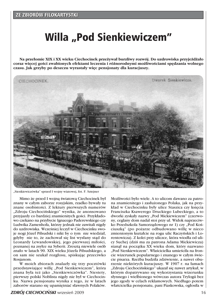 ZE ZBIORÓW FILOKARTYSTKI Willa „Pod Sienkiewiczem” Na prze∏omie XIX i XX wieku Ciechocinek prze˝ywa∏ burzliwy rozwój. Do uzdrowiska przyje˝d˝a∏o coraz wi´cej goÊci zwabionych efektami leczenia i ró˝norodnymi mo˝liwoÊciami sp´dzania wolnego czasu. Jak grzyby po deszczu wyrasta∏y wi´c pensjonaty dla kuracjuszy. „Sienkiewiczówka” sprzed I wojny wiatowej, fot. F. Sztejner Mimo ˝e przed I wojnà Êwiatowà Ciechocinek by∏ znany w ca∏ym zaborze rosyjskim, rzadko bywa∏y tu znane osobistoÊci. Z lektury pierwszych numerów „Zdroju Ciechociƒskiego” wynika, ˝e anonsowano przyjazdy co bardziej znamienitych goÊci. Przyk∏adowo czekano na przybycie Ignacego Paderewskiego czy Ludwika Zamenhofa, którzy jednak nie zawitali nigdy do uzdrowiska. WczeÊniej leczy∏ w Ciechocinku swoje nogi Józef Pi∏sudski i nikt by o tym nie wiedzia∏, gdyby nie to, ˝e zachowa∏ si´ list wys∏any stàd do Leonardy Lewandowskiej, jego pierwszej mi∏oÊci, poznanej na zsy∏ce na Syberii. Zresztà niewiele osób zna∏o w latach 90. XIX wieku Józefa Pi∏sudskiego, a on sam nie szuka∏ rozg∏osu, spiskujàc przeciwko Rosjanom. W moich zbiorach znalaz∏y si´ trzy pocztówki przedstawiajàce will´ „Pod Sienkiewiczem”, która znana by∏a te˝ jako „Sienkiewiczówka”. Niestety, pierwszy polski Noblista nigdy nie by∏ w Ciechocinku. Nazwa pensjonatu wynika z tego, ˝e w latach zaborów starano si´ upami´tniaç s∏awnych Polaków. ZDRÓJ CIECHOCI¡SKI wrzesieƒ 2009 Mo˝liwoÊci by∏o wiele. A to ulicom dawano za patrona znamienitego i zas∏u˝onego Polaka, jak na przyk∏ad w Ciechocinku by∏y ulice Staszica czy ksi´cia Franciszka Ksawerego Druckiego Lubeckiego, a to dworki zyska∏y nazwy „Pod Mickiewiczem” (czerwony, ceglany dom nadal stoi przy ul. Widok naprzeciwko Przedszkola Samorzàdowego nr 1) czy „Pod KoÊciuszkà” (po po˝arze odbudowano will´ w nieco zmienionym kszta∏cie na rogu ulic Raczyƒskich i Lorentowicza). Z kolei przy uliczce, która wiod∏a od ulicy Suchej (dziÊ ma za patrona Adama Mickiewicza) stanà∏ na poczàtku XX wieku dom, który nazwano „Pod Sienkiewiczem”. W∏aÊcicielka umieÊci∏a na froncie wizerunek popularnego i znanego w ca∏ym Êwiecie pisarza. Rzeêba budzi∏a zdziwienie, a nawet oburzenie niektórych kuracjuszy. W 1907 r. na ∏amach „Zdroju Ciechociƒskiego” ukaza∏ si´ nawet artyku∏, w którym dopatrywano si´ wykorzystania wizerunku s∏ynnego i wielbionego wówczas autora Trylogii bez jego zgody w celach reklamowych. Nied∏ugo potem w∏aÊcicielka pensjonatu, pani Piaskowska, og∏osi∏a w 16 „Sienkiewiczówka” z lat 30. XX w., fot. M.A.F.-Gdynia gazecie list otrzymany szeÊç lat wczeÊniej od samego Henryka Sienkiewicza, w którym pisarz wyrazi∏ zgod´ na umieszczenie jego popiersia na Êcianie budynku. Willa zyska∏a nazw´ „Pod Sienkiewiczem”. Rzeêba zagin´∏a bez Êladu prawdopodobnie w czasie okupacji, bowiem na pocztówce z lat trzydziestych XX w. mo˝na jà jeszcze zauwa˝yç. W reklamie zamieszczonej w „Informatorze ciechociƒskim” F. Makowskiego z 1910 roku czytamy: „MiejscowoÊç na wskroÊ piaszczysta, najsuchsza, blisko kàpieli, koÊcio∏a i zagajnika Êwierkowego. Kuchnia dietetyczna, smaczna i zdrowa. Us∏uga specjalna, staranna. Czytelnia abonamentowa i czasopism krajowych na miejscu. Ogólny pokój jadalny i pianino.” Czytelnia oferowa∏a aktualne powieÊci i nowele w abonamencie po 75 kopiejek miesi´cznie lub po jednym rublu za sezon szeÊciotygodniowy. ZaÊ dwa lata potem w informatorze wydanym przez Towarzystwo Przyjació∏ Ciechocinka „Ciechocinek. Zak∏ad wód mineralnych jodo-bromo-s∏onych” mo˝na by∏o przeczytaç reklam´ o nast´pujàcej treÊci: Umiƒskiego „Ciechocinek i okolice”, wydanym w 1990 roku, autor zapowiada∏, ˝e w przysz∏oÊci na miejscu „Sienkiewiczówki” zostanie wzniesiony nowoczesny hotel - pensjonat o standardzie mi´dzynarodowym… W czasach PRL w ogrodzie „Orbisu” cicho szemra∏a fontanna, a w wodzie p∏ywa∏y czerwone rybki. W pobli˝u by∏y dwie kawiarnie -„Kameralna” i „Pod Kasztanami” z najlepszymi w Ciechocinku lodami i ciastkami. Do dziÊ pami´tam smak lodów waniliowych, najbardziej waniliowych pod s∏oƒcem i wspania∏y zapach kawy. Sprzedawane tam lody bakaliowe z rodzynkami i orzechami by∏y szczytem luksusu. Obie kawiarnie ju˝ nie istniejà, w pami´ci bywalców pozosta∏y jedynie serwowane tam pysznoÊci, a budynek „Sienkiewiczówki” popad∏ w ruin´ i czeka na lepsze czasy. Tekst dedykuj´ pami´ci mojej Mamy, Ireny Nocny, która pracowa∏a wiele lat w „Orbisie” oddziale „Pomorzanki”. Aldona Nocna Dworek „Pod Sienkiewiczem” Kuchnia higieniczna D-rowej Gierszowej prowadzona pod∏ug najnowszych zasad hygieny i dyetetyki. Âniadania, obiady, podwieczorki i kolacje. Specyalny oddzia∏ kuchni jarskiej pod∏ug d-ra Lahmanna. (pisownia oryginalna) Ulica, przy której sta∏ pensjonat, otrzyma∏a za patrona Sienkiewicza i tak jest do dzisiaj. Po II wojnie Êwiatowej w budynku mieÊci∏ si´ OÊrodek Pensjonatowy PBT „Orbis”, a o przyjeêdzie do niego marzy∏a niejedna Polka czy niejeden Polak. Pewnà ciekawostkà jest, ˝e w przewodniku turystycznym Janusza 17 Dom wypoczynkowy „Orbis”, lata 60. XX w., fot. J. Osuchowski ZDRÓJ CIECHOCI¡SKI wrzesieƒ 2009