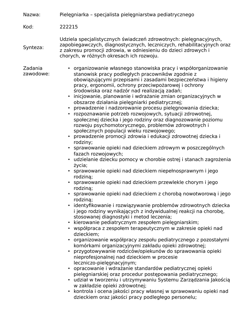 Nazwa: Pielęgniarka – specjalista pielęgniarstwa pediatrycznego Kod: 222215 Synteza: Udziela specjalistycznych świadczeń zdrowotnych: pielęgnacyjnych, zapobiegawczych, diagnostycznych, leczniczych, rehabilitacyjnych oraz z zakresu promocji zdrowia, w odniesieniu do dzieci zdrowych i chorych, w różnych okresach ich rozwoju. Zadania zawodowe: • organizowanie własnego stanowiska pracy i współorganizowanie stanowisk pracy podległych pracowników zgodnie z obowiązującymi przepisami i zasadami bezpieczeństwa i higieny pracy, ergonomii, ochrony przeciwpożarowej i ochrony środowiska oraz nadzór nad realizacją zadań; • inicjowanie, planowanie i wdrażanie zmian organizacyjnych w obszarze działania pielęgniarki pediatrycznej; • prowadzenie i nadzorowanie procesu pielęgnowania dziecka; • rozpoznawanie potrzeb rozwojowych, sytuacji zdrowotnej, społecznej dziecka i jego rodziny oraz diagnozowanie poziomu rozwoju psychomotorycznego, problemów zdrowotnych i społecznych populacji wieku rozwojowego; • prowadzenie promocji zdrowia i edukacji zdrowotnej dziecka i rodziny; • sprawowanie opieki nad dzieckiem zdrowym w poszczególnych fazach rozwojowych; • udzielanie dziecku pomocy w chorobie ostrej i stanach zagrożenia życia; • sprawowanie opieki nad dzieckiem niepełnosprawnym i jego rodziną; • sprawowanie opieki nad dzieckiem przewlekle chorym i jego rodziną; • sprawowanie opieki nad dzieckiem z chorobą nowotworową i jego rodziną; • identyfikowanie i rozwiązywanie problemów zdrowotnych dziecka i jego rodziny wynikających z indywidualnej reakcji na chorobę, stosowanej diagnostyki i metod leczenia; • kierowanie pediatrycznym zespołem pielęgniarskim; • współpraca z zespołem terapeutycznym w zakresie opieki nad dzieckiem; • organizowanie współpracy zespołu pediatrycznego z pozostałymi komórkami organizacyjnymi zakładu opieki zdrowotnej; • przygotowywanie rodziców/opiekunów do sprawowania opieki nieprofesjonalnej nad dzieckiem w procesie leczniczo-pielęgnacyjnym; • opracowanie i wdrażanie standardów pediatrycznej opieki pielęgniarskiej oraz procedur postępowania pediatrycznego; • udział w tworzeniu i utrzymywaniu Systemu Zarządzania Jakością w zakładzie opieki zdrowotnej; • kontrola i ocena jakości pracy własnej w sprawowaniu opieki nad dzieckiem oraz jakości pracy podległego personelu; • organizowanie i prowadzenie szkoleń personelu pielęgniarskiego w zakresie opieki nad dziećmi zdrowymi i chorymi, w różnych okresach ich rozwoju; • uczestniczenie w badaniach naukowych w dziedzinie pielęgniarstwa pediatrycznego oraz wykorzystywanie wyników badań w działalności praktycznej. Dodatkowe zadania zawodowe: • nauczanie zawodu pielęgniarki; • prowadzenie zajęć dydaktycznych z zakresu pielęgniarstwa pediatrycznego w kształceniu ustawicznym pielęgniarek.