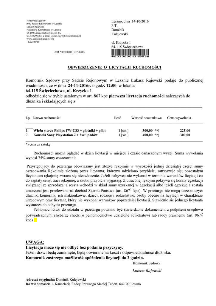 Obwieszczenie o licytacji - Kancelaria Komornicza w Lesznie