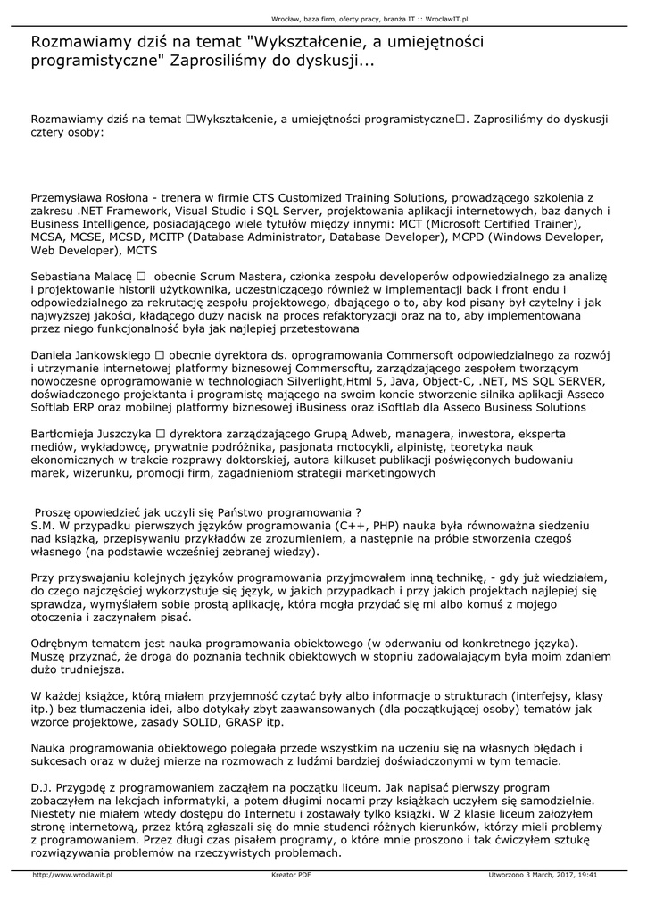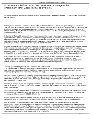 Wrocław, baza firm, oferty pracy, branża IT :: WroclawIT.pl Rozmawiamy dziś na temat "Wykształcenie, a umiejętności programistyczne" Zaprosiliśmy do dyskusji... Rozmawiamy dziś na temat Wykształcenie, a umiejętności programistyczne. Zaprosiliśmy do dyskusji cztery osoby: Przemysława Rosłona - trenera w firmie CTS Customized Training Solutions, prowadzącego szkolenia z zakresu .NET Framework, Visual Studio i SQL Server, projektowania aplikacji internetowych, baz danych i Business Intelligence, posiadającego wiele tytułów między innymi: MCT (Microsoft Certified Trainer), MCSA, MCSE, MCSD, MCITP (Database Administrator, Database Developer), MCPD (Windows Developer, Web Developer), MCTS Sebastiana Malacę obecnie Scrum Mastera, członka zespołu developerów odpowiedzialnego za analizę i projektowanie historii użytkownika, uczestniczącego również w implementacji back i front endu i odpowiedzialnego za rekrutację zespołu projektowego, dbającego o to, aby kod pisany był czytelny i jak najwyższej jakości, kładącego duży nacisk na proces refaktoryzacji oraz na to, aby implementowana przez niego funkcjonalność była jak najlepiej przetestowana Daniela Jankowskiego obecnie dyrektora ds. oprogramowania Commersoft odpowiedzialnego za rozwój i utrzymanie internetowej platformy biznesowej Commersoftu, zarządzającego zespołem tworzącym nowoczesne oprogramowanie w technologiach Silverlight,Html 5, Java, Object-C, .NET, MS SQL SERVER, doświadczonego projektanta i programistę mającego na swoim koncie stworzenie silnika aplikacji Asseco Softlab ERP oraz mobilnej platformy biznesowej iBusiness oraz iSoftlab dla Asseco Business Solutions Bartłomieja Juszczyka dyrektora zarządzającego Grupą Adweb, managera, inwestora, eksperta mediów, wykładowcę, prywatnie podróżnika, pasjonata motocykli, alpinistę, teoretyka nauk ekonomicznych w trakcie rozprawy doktorskiej, autora kilkuset publikacji poświęconych budowaniu marek, wizerunku, promocji firm, zagadnieniom strategii marketingowych Proszę opowiedzieć jak uczyli się Państwo programowania ? S.M. W przypadku pierwszych języków programowania (C++, PHP) nauka była równoważna siedzeniu nad książką, przepisywaniu przykładów ze zrozumieniem, a następnie na próbie stworzenia czegoś własnego (na podstawie wcześniej zebranej wiedzy). Przy przyswajaniu kolejnych języków programowania przyjmowałem inną technikę, - gdy już wiedziałem, do czego najczęściej wykorzystuje się język, w jakich przypadkach i przy jakich projektach najlepiej się sprawdza, wymyślałem sobie prostą aplikację, która mogła przydać się mi albo komuś z mojego otoczenia i zaczynałem pisać. Odrębnym tematem jest nauka programowania obiektowego (w oderwaniu od konkretnego języka). Muszę przyznać, że droga do poznania technik obiektowych w stopniu zadowalającym była moim zdaniem dużo trudniejsza. W każdej książce, którą miałem przyjemność czytać były albo informacje o strukturach (interfejsy, klasy itp.) bez tłumaczenia idei, albo dotykały zbyt zaawansowanych (dla początkującej osoby) tematów jak wzorce projektowe, zasady SOLID, GRASP itp. Nauka programowania obiektowego polegała przede wszystkim na uczeniu się na własnych błędach i sukcesach oraz w dużej mierze na rozmowach z ludźmi bardziej doświadczonymi w tym temacie. D.J. Przygodę z programowaniem zacząłem na początku liceum. Jak napisać pierwszy program zobaczyłem na lekcjach informatyki, a potem długimi nocami przy książkach uczyłem się samodzielnie. Niestety nie miałem wtedy dostępu do Internetu i zostawały tylko książki. W 2 klasie liceum założyłem stronę internetową, przez którą zgłaszali się do mnie studenci różnych kierunków, którzy mieli problemy z programowaniem. Przez długi czas pisałem programy, o które mnie proszono i tak ćwiczyłem sztukę rozwiązywania problemów na rzeczywistych problemach. http://www.wroclawit.pl Kreator PDF Utworzono 3 March, 2017, 19:41 Wrocław, baza firm, oferty pracy, branża IT :: WroclawIT.pl Gdy uważałem się za dobrego programistę, zacząłem pracę w firmie Softlab (byłem najmłodszym pracownikiem firmy, obecnie jest to Asseco Business Solution) i tam uświadomiłem sobie, że tak na prawdę byłem w błędzie, co do swojego poziomu. Potrafiłem programować, jednak nie znałem się na porządnym debugowaniu, zarządzaniu pamięci. Przy pomocy doświadczonych kolegów, ciężkiej pracy i ciągłym poszerzaniu wiedzy, nauczyłem się kunsztu programisty i odpowiedniego myślenia. P.R. Jak widać większość programistów uczy się samodzielnie. Mimo, że na rynku są dostępne szkolenia, które pokazują jak rozwiązać pewne problemy w najlepszy sposób to nic nie zastąpi zwykłego siedzenia i ćwiczenia na własną rękę. Programiści muszą ciągle praktykować. Teoria jest równie ważna jak praktyka. Często na szkoleniach człowiek uczy się rzeczy, które teoretycznie mu się nie przydają, a przy którymś projekcie zamiast kombinować jak koń pod górkę i wymyślać na nowo rozwiązania korzysta z istniejących. Ponadto zawsze warto wiedzieć co jest optymalniejsze od czegoś i w jakich przypadkach. Panie Bartku bardzo proszę opisać pokrótce przy jakiego typu projektach pracują u Pana w firmie programiści ? Czym się zajmują ? B.J. Studio programistyczne, które uruchomiliśmy przed niespełna dwoma laty zajmuje się realizowaniem przede wszystkim autorskich zamówień, w tym m.in. aplikacji mobilnych, jak również systemów klasy CMS czy CRM. Programiści na co dzień programują także moduły niezbędne w realizacji większych zleceń opartych o gotowe rozwiązania, np. korzystając z silników open source, jak Wordpress. Czy najlepsza jest nauka w domu, nad konkretnymi projektami czy też szkolenia w firmach zewnętrznych ? S.M. Uważam, że nauka w domu jest najtrudniejszą i najkosztowniejszą drogą, ponieważ uczymy się na 