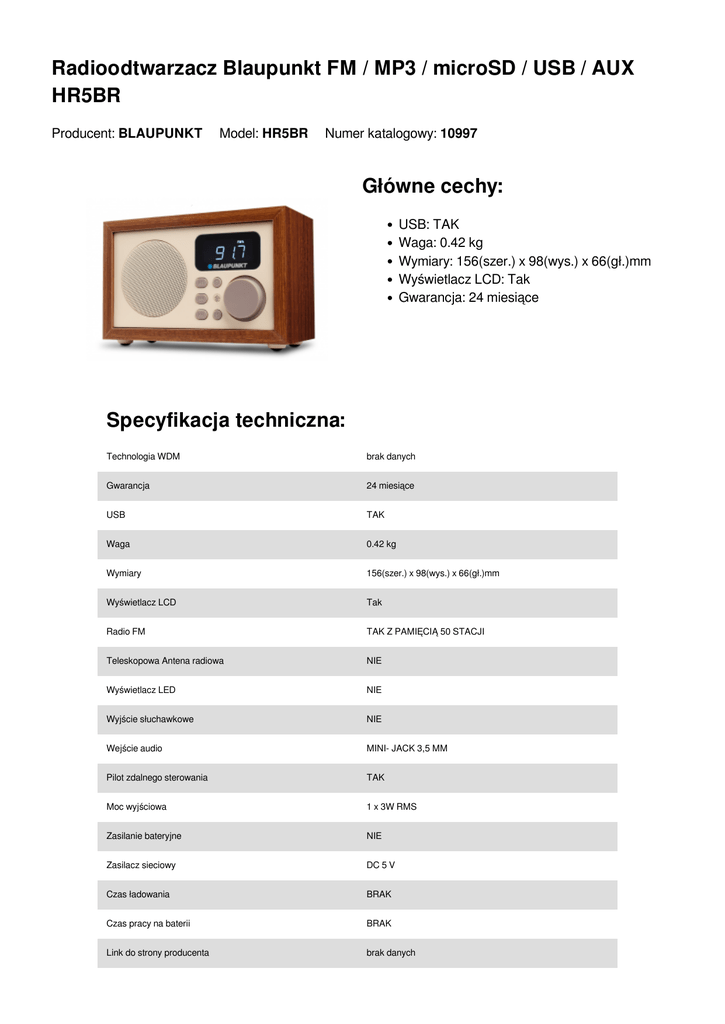 Radioodtwarzacz Blaupunkt FM / MP3 / microSD / USB / AUX HR5BR Producent: BLAUPUNKT Model: HR5BR Numer katalogowy: 10997 Główne cechy: USB: TAK Waga: 0.42 kg Wymiary: 156(szer.) x 98(wys.) x 66(gł.)mm Wyświetlacz LCD: Tak Gwarancja: 24 miesiące Specyfikacja techniczna: Technologia WDM brak danych Gwarancja 24 miesiące USB TAK Waga 0.42 kg Wymiary 156(szer.) x 98(wys.) x 66(gł.)mm Wyświetlacz LCD Tak Radio FM TAK Z PAMIĘCIĄ 50 STACJI Teleskopowa Antena radiowa NIE Wyświetlacz LED NIE Wyjście słuchawkowe NIE Wejście audio MINI- JACK 3,5 MM Pilot zdalnego sterowania TAK Moc wyjściowa 1 x 3W RMS Zasilanie bateryjne NIE Zasilacz sieciowy DC 5 V Czas ładowania BRAK Czas pracy na baterii BRAK Link do strony producenta brak danych Prędkość transmisji brak danych