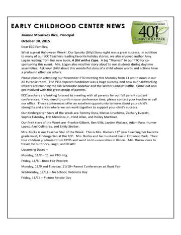 Joanne Mourikes Rice, Principal October 30, 2015 Dear ECC Families, What a great Halloween Week! Our Spooky (Silly) Story night was a great success. In addition to many of our ECC Teachers reading favorite holiday stories, we also enjoyed author Amy Logan reading from her new book, A Girl with a Cape. A big “Thanks!” to our PTO for cosponsoring this event. Mrs. Logan also read her story aloud to our students during daytime assemblies. Ask your child about this wonderful story of a child whose words and actions have a profound effect on others. Please plan on attending our November PTO meeting this Monday from 11 am to noon in our All Purpose room. The PTO Popcorn fundraiser was a huge success, and now our hardworking officers are planning the fall Scholastic Bookfair and the Winter Concert Raffle. Come out and get involved with this great group of parents. ECC teachers are looking forward to meeting with all parents for our fall parent student conferences. If you need to confirm your conference time, please contact your teacher or call our office. These conferences offer an excellent opportunity to learn about your child’s strengths and areas where we can work together to support your child’s success. Our Kindergarten Stars of the Week are-Tommy Dyra, Matias Uruchima, Zachary Everett, Sophia Esterday, Eric Mendoza Jr., Hind Allan, and Heiley Martinez. Our PreK stars of the Week are -Frankie Gilbert, Ben Villa, Jayden Wallace, Adam Para, Hunter Lopez, Axel Colindres, and Emily Steiber. Mrs. Bocka is our Teacher Star of the Week. This is Mrs. Bocka’s 13th year teaching her favorite grade level, Kindergarten at the ECC. Mrs. Bocka and her husband live in Elmwood Park. Their four children graduated from EPHS and went on to universities in Illinois. Mrs. Bocka loves to travel, be outdoors, laugh, and READ! Upcoming Dates – Monday, 11/2 – 11 am PTO mtg. Friday, 11/6 – Book Fair Preview Monday, 11/9 and Tuesday, 11/10– Parent Conferences ad Book Fair Wednesday, 11/11 – No School, Veterans Day Friday, 11/13 – Picture Retake Day Joanne Mourikes Rice Directora August 16, 2013 Estimadas Familias del Centro ECC, ¡Qué semana tan maravillosa de Halloween! Nuestra Noche de Historias Misteriosas (graciosas) fue todo un éxito. Además de varias de nuestras maestras del Centro ECC que leyeron su historia favorita de la festividad, disfrutamos de la autora Amy Logan, quien leyó su nuevo libro, Girl with a Cape. Muchísimas Gracias a nuestros padres de la PTO por co-auspiciar este evento. La Señora Logan también leyó su historia en alto a nuestros estudiantes durante las asambleas en el día. Por favor interrogue a su hijo sobre esta historia tan maravillosa de una niña que con sus palabras y acciones tiene un efecto profundo en otros. Por favor haga planes asistir a la reunión de la PTO de noviembre que será este lunes de 11 am – 12 pm en el cuarto multiusos. La actividad para recolección de la PTO de palomitas fue un gran éxito, y ahora nuestros trabajosos oficiales están planeando la feria de otoño de Libros Escolares y la Rifa del Concierto de Invierno. Por favor venga y hágase parte de este maravilloso de padres. Las maestras del Centro ECC están deseosas de poderse reunir con todos los padres para las conferencias de padres y maestros de otoño. Si usted necesita confirmar su tiempo de conferencia, por favor llame a su maestra o llame a nuestra oficina. Estas conferencias ofrecen una oportunidad excelente de aprender sobre las áreas fuertes de su niño/a y las áreas donde podemos trabajar juntos para apoyar el éxito de su niño/a. Nuestros Estudiantes Estrella de la Semana del Kindergarten son-Tommy Dyra, Matias Uruchima, Zachary Everett, Sophia Esterday, Eric Mendoza Jr., Hind Allan y Heiley Martinez. Nuestros Estudiantes Estrella de la Semana de PreK son -Frankie Gilbert, Ben Villa, Jayden Wallace, Adam Para, Hunter Lopez, Axel Colindres y Emily Steiber. La Señora Bocka es nuestra maestra Estrella de La Semana. La Señora Mrs. Bocka, lleva 13 años ensenando en su grado de nivel favorito, el Kindergarten, aquí en el Centro ECC. La Señora Bocka y su esposo viven aquí en Elmwood Park. Sus cuatro hijos se graduaron de EPHS y asistieron a universidades en Illinois. ¡A la Señora Bocka le encanta viajar, estar al aire libre, reír y LEER! Fechas Importantes Futuras – Lunes, 11/2 – 11 am Reunión de la PTO Viernes, 11/6 – Muestra de la Feria de Libros Lunes, 11/9 y martes, 11/10– Conferencias de padres y Feria de libros Miércoles, 11/11 – No hay clases, Día del Veterano Viernes, 11/13 – Retoma de Fotografías 30 pazdziernika, 2015 Drodzy Rodzice, Co za udany tydzien halloweenowy! Noc Strasznych ( Smiesznych) Historii zakonczyla sie duzym sukcesem. Oprocz wielu nauczycieli ECC prezentujacych swoje ulubione halloweenowe ksiazeczki, wieczor uswietnila autorka, Amy Logan, ktora przeczytala swoja ksiazke dla dzieci pt. Girl with a Cape. Wielkie „dziekuje” przesylamy w strone PTO za wspolfinansowanie tego wydarzenia. Pani Logan wystapila tez przed naszymi uczniami w czasie zajec szkolnych. Prosze zapytac dziecko o bohaterke jej opowiadania, dziewczynke, ktorej slowa i dzialania mialy wplyw na zycie innych ludzi. Prosze zaplanowac udzial w najblizszym spotkaniu organizacji PTO, ktore odbedzie sie w najblizszy poniedzialek, o godzinie 11.00 w naszej klasie All Purpose. Sprzedaz popcornu sponsorowana przez PTO zakonczyla sie wielkim sukcesem. Obecnie nasi rodzice przygotowuja sie do pracy przy jesiennym Kiermaszu Ksiazek firmy Scholastic i do loterii fantowej w czasie Koncertu Zimowego. Zapraszamy wszystkich rodzicow do pomocy. Nauczyciele ECC z niecierpliwoscia oczekuja na spotkania z rodzicami w czasie jesiennych wywiadowek. Jesli potrzebuja Panstwo potwierdzic date i godzine spotkania, prosze skontaktowac sie z wychowawca Panstwa dziecka lub naszym biurem. Konferencje oferuja rodzicom doskonala okazje do dowiedzenia sie, jaki material jest juz dz