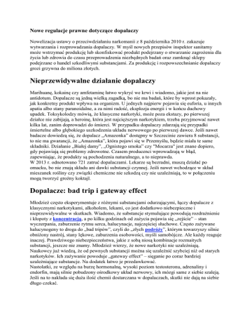 Nowe regulacje prawne dotyczące dopalaczy Nowelizacja ustawy o przeciwdziałaniu narkomanii z 8 października 2010 r. zakazuje wytwarzania i rozprowadzania dopalaczy. W myśl nowych przepisów inspektor sanitarny moŜe wstrzymać produkcję lub skonfiskować produkt podejrzany o stwarzanie zagroŜenia dla Ŝycia lub zdrowia do czasu przeprowadzenia niezbędnych badań oraz zamknąć sklepy podejrzane o handel szkodliwymi substancjami. Za produkcję i rozpowszechnianie dopalaczy grozi grzywna do miliona złotych. Nieprzewidywalne działanie dopalaczy Marihuanę, kokainę czy amfetaminę łatwo wykryć we krwi i wiadomo, jakie jest na nie antidotum. Dopalacze są jedną wielką zagadką, bo nie ma badań, które by wprost pokazały, jak konkretny produkt wpływa na organizm. U jednych najpierw pojawia się euforia, u innych apatia albo stany paranoidalne, a za nimi radość, eksplozja energii i w końcu duchowy upadek. Toksykolodzy mówią, Ŝe klasyczne narkotyki, moŜe poza ekstazy, po pierwszej działce nie zabijają, a heroinę, która jest najcięŜszym narkotykiem, trzeba przyjmować nawet kilka lat, zanim doprowadzi do śmierci. W przypadku dopalaczy zdarzają się przypadki śmiertelne albo głębokiego uszkodzenia układu nerwowego po pierwszej dawce. Jeśli nawet badacze dowiedzą się, Ŝe dopalacz „Amazonka” dostępny w Szczecinie zawiera 8 substancji, to nie ma gwarancji, Ŝe „Amazonka”, która pojawi się w Przemyślu, będzie miała te same składniki. Działanie „Białej damy”, „Ognistego smoka” czy "Mocarza" jest znane dopiero, gdy pojawiają się problemy zdrowotne. Czasem producenci wprowadzają w błąd, zapewniając, Ŝe produkty są pochodzenia naturalnego, a to nieprawda. W 2013 r. odnotowano 721 zatruć dopalaczami. Lekarze są bezradni, muszą działać po omacku, bo nie znają składu ani dawki substancji czynnej. Jeśli nawet wchodzące w skład mieszanek rośliny czy związki chemiczne nie szkodzą czy nie uzaleŜniają, to w połączeniu mogą tworzyć groźny koktajl. Dopalacze: bad trip i gateway effect MłodzieŜ często eksperymentuje z róŜnymi substancjami odurzającymi, łączy dopalacze z klasycznymi narkotykami, alkoholem, lekami, co jest dodatkowo niebezpieczne i nieprzewidywalne w skutkach. Wiadomo, Ŝe substancje stymulujące powodują rozdraŜnienie i kłopoty z koncentracją, a po kilku godzinach od zaŜycia pojawia się „zejście” – stan wyczerpania, zaburzenie rytmu serca, halucynacje, najczęściej słuchowe. Często zaŜywane halucynogeny to droga do „bad tripów”, czyli do „złych podróŜy”, którym towarzyszy silnie obniŜony nastrój, stany lękowe, zaburzenia osobowości, myśli samobójcze. Ale kaŜdy reaguje inaczej. Prawdziwego niebezpieczeństwa, jakie z sobą niosą kombinacje rozmaitych substancji, jeszcze nie znamy. MłodzieŜ wierzy, Ŝe nowe narkotyki nie uzaleŜniają. Naukowcy juŜ wiedzą, Ŝe od pewnych substancji moŜna się uzaleŜnić szybciej niŜ od starych narkotyków. Ich zaŜywanie powoduje „gateway effect” – sięganie po coraz bardziej uzaleŜniające substancje. Na dodatek łatwo je przedawkować. Nastolatki, ze względu na burzę hormonalną, wysoki poziom testosteronu, adrenaliny i endorfin, mają silnie pobudzony ośrodkowy układ nerwowy, ich mózgi same z siebie szaleją. Jeśli na to nakłada się duŜa ilość chemii dostarczana w dopalaczach, skutki nie dają na siebie długo czekać. http://www.poradnikzdrowie.pl/psychologia/nalogi/dopalacze-nowa-era-nowezagrozenia_42342.html Dlaczego dopalacze są niebezpieczne? • • • • Zanim jakaś substancja trafi do powszechnego uŜytku np. jako lek, musi przejść próby laboratoryjne, czasem takŜe testy na zwierzętach oraz trzy fazy badań klinicznych na ludziach. W ten sposób sprawdzane jest, czy substancje te są bezpieczne dla człowieka i nie powodują szkodliwych skutków ubocznych. Dopalacze, choć tworzone są z mieszanin niebadanych do tej pory substancji psychoaktywnych, nie przechodzą takich testów. Prawda jest taka, Ŝe producenci dopalaczy testują swoje „wyroby” na klientach. Badania pokazały, Ŝe do dopalaczy często dodawane są substancje zanieczyszczone, w niektórych próbkach znajdują się takŜe leki. PoniewaŜ liczba tworzonych dopalaczy rośnie, a składają się na nie róŜne nowowyodrębnione składniki, w razie zatrucia lub innych skutków ubocznych, często lekarze nie są w stanie wykryć, jaka substancja spowodowała dany efekt. MoŜe to utrudnić proces leczenia lub ratowania Ŝycia. PoniewaŜ na ich opakowaniach nie jest napisane, jakie substancje zawierają, cięŜko przewidzieć jakie skutki uboczne powodują, oraz jak duŜa dawka moŜe wywołać powaŜne negatywne konsekwencje.