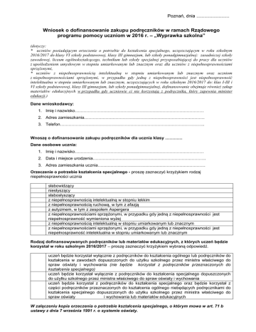 Poznań, dnia ......................... Wniosek o dofinansowanie zakupu podręczników w ramach Rządowego programu pomocy uczniom w 2016 r. – „Wyprawka szkolna” (dotyczy: * uczniów posiadającym orzeczenie o potrzebie do kształcenia specjalnego, uczęszczającym w roku szkolnym 2016/2017 do klasy VI szkoły podstawowej, klasy III gimnazjum, lub szkoły ponadgimnazjalnej: zasadniczej szkoły zawodowej, liceum ogólnokształcącego, technikum lub szkoły specjalnej przysposabiającej do pracy dla uczniów z upośledzeniem umysłowym w stopniu umiarkowanym lub znacznym oraz dla uczniów z niepełnosprawnościami sprzężonymi, * uczniów z niepełnosprawnością intelektualną w stopniu umiarkowanym lub znacznym oraz uczniom z niepełnosprawnościami sprzężonymi, w przypadku gdy jedną z niepełnosprawności jest niepełnosprawność intelektualna w stopniu umiarkowanym lub znacznym, uczęszczających w roku szkolnym 2016/2017 do: klas I-III i VI szkoły podstawowej, klasy III gimnazjum, lub szkoły ponadgimnazjalnej, dofinansowanie obejmuje również zakup materiałów edukacyjnych w przypadku gdy uczniowie ci nie korzystają z podręcznika, który zapewnia minister edukacji.) Dane wnioskodawcy: 1. Imię i nazwisko……………………………………………………………………………… 2. Adres zamieszkania………………………………………………………………………… 3. Telefon……………………………………………………………………………………….. Wnoszę o dofinansowanie zakupu podręczników dla ucznia klasy ………… Dane osobowe ucznia: 1. Imię i nazwisko……………………………………………………………………………… 2. Data i miejsce urodzenia……………………………………………………………………. 3. Adres zamieszkania ucznia………………………………………………………………… Orzeczenie o potrzebie kształcenia specjalnego - proszę zaznaczyć krzyżykiem rodzaj niepełnosprawności ucznia słabowidzący niesłyszący słabosłyszący z niepełnosprawnością intelektualną w stopniu lekkim z niepełnosprawnością ruchową, w tym z afazją z autyzmem, w tym z zespołem Aspergera z niepełnosprawnościami sprzężonymi, w przypadku gdy jedną z niepełnosprawności jest niepełnosprawność wymieniona wyżej z niepełnosprawnością intelektualną w stopniu umiarkowanym lub znacznym z niepełnosprawnościami sprzężonymi, w przypadku gdy jedną z niepełnosprawności jest niepełnosprawność intelektualna w stopniu umiarkowanym lub znacznym Rodzaj dofinansowywanych podręczników lub materiałów edukacyjnych, z których uczeń będzie korzystał w roku szkolnym 2016/2017 – proszę zaznaczyć krzyżykiem wybraną odpowiedź. uczeń będzie korzystał wyłącznie z podręczników do kształcenia ogólnego lub podręczników do kształcenia w zawodach dopuszczonych do użytku szkolnego przez ministra właściwego do spraw oświaty i wychowania (nie będzie korzystał z podręczników przeznaczonych do kształcenia specjalnego) uczeń będzie korzystał wyłącznie z podręczników do kształcenia specjalnego dopuszczonych do użytku szkolnego przez ministra właściwego do spraw oświaty i wychowania uczeń będzie korzystał z podręczników do kształcenia specjalnego oraz będzie korzystał z części podręczników przeznaczonych do kształcenia ogólnego niebędących podręcznikami do kształcenia specjalnego dopuszczonych do użytku szkolnego przez ministra właściwego do spraw oświaty i wychowania lub materiałów edukacyjnych W załączeniu kopia orzeczenia o potrzebie kształcenia specjalnego, o którym mowa w art. 71 b ustawy z dnia 7 września 1991 r. o systemie oświaty. Oświadczenie: 1. Oświadczam, że powyższe dane, które potwierdzam własnoręcznym podpisem, są zgodne ze stanem faktycznym. 2. Wyrażam zgodę na przetwarzanie danych osobowych wyłącznie dla potrzeb programu pomocy uczniom w 2016 r. – „Wyprawka szkolna”. ............................................................................. (czytelny podpis wnioskodawcy) Oświadczenie o zakupie podręczników/materiałów edukacyjnych Oświadczam, że dla ucznia wskazanego we wniosku dokonano zakupu następujących podręczników/ materiałów edukacyjnych1: 1. ………………………………………………………………................. (tytuł, autor podręcznika)/materiały edukacyjne 2. ……………………………………………………………….................. (tytuł, autor podręcznika)/materiały edukacyjne 3. ……………………………………………………………….................. (tytuł, autor podręcznika)/materiały edukacyjne 4. ……………………………………………………………….................. (tytuł, autor podręcznika)/materiały edukacyjne 5 ………………………………………………………………................. (tytuł, autor podręcznika)/materiały edukacyjne 6. ……………………………………………………………….................. (tytuł, autor podręcznika)/materiały edukacyjne 7. ……………………………………………………………….................. (tytuł, autor podręcznika)/materiały edukacyjne 8. ……………………………………………………………….................. (tytuł, autor podręcznika)/materiały edukacyjne 9. ……………………………………………………………….................. (tytuł, autor podręcznika)/materiały edukacyjne 10. ……………………………………………………………….................. (tytuł, autor podręcznika)/materiały edukacyjne …………........ (cena) …………........ (cena) …………........ (cena) …………........ (cena) …………........ (cena) …………........ (cen