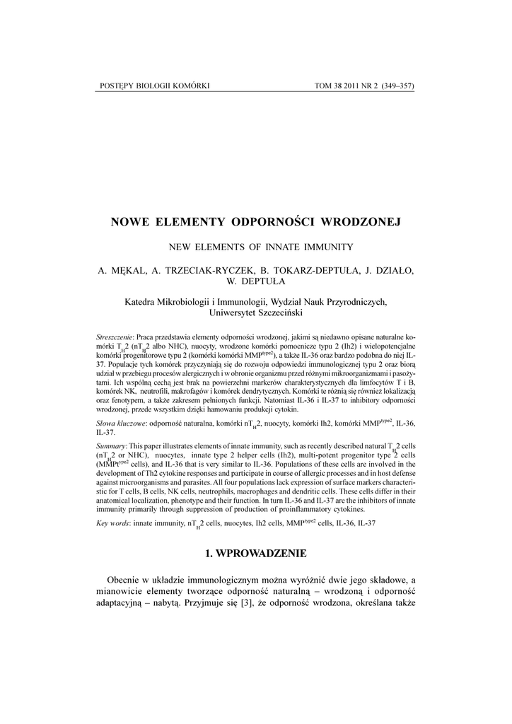 POSTÊPY BIOLOGII KOMÓRKI TOM 38 2011 NR 2 (349357) NOWE ELEMENTY ODPORNOCI WRODZONEJ 349 NOWE ELEMENTY ODPORNOCI WRODZONEJ NEW ELEMENTS OF INNATE IMMUNITY A. MÊKAL, A. TRZECIAK-RYCZEK, B. TOKARZ-DEPTU£A, J. DZIA£O, W. DEPTU£A Katedra Mikrobiologii i Immunologii, Wydzia³ Nauk Przyrodniczych, Uniwersytet Szczeciñski Streszczenie: Praca przedstawia elementy odpornoci wrodzonej, jakimi s¹ niedawno opisane naturalne komórki TH2 (nTH2 albo NHC), nuocyty, wrodzone komórki pomocnicze typu 2 (Ih2) i wielopotencjalne komórki progenitorowe typu 2 (komórki komórki MMPtype2), a tak¿e IL-36 oraz bardzo podobna do niej IL37. Populacje tych komórek przyczyniaj¹ siê do rozwoju odpowiedzi immunologicznej typu 2 oraz bior¹ udzia³ w przebiegu procesów alergicznych i w obronie organizmu przed ró¿nymi mikroorganizmami i paso¿ytami. Ich wspóln¹ cech¹ jest brak na powierzchni markerów charakterystycznych dla limfocytów T i B, komórek NK, neutrofili, makrofagów i komórek dendrytycznych. Komórki te ró¿ni¹ siê równie¿ lokalizacj¹ oraz fenotypem, a tak¿e zakresem pe³nionych funkcji. Natomiast IL-36 i IL-37 to inhibitory odpornoci wrodzonej, przede wszystkim dziêki hamowaniu produkcji cytokin. S³owa kluczowe: odpornoæ naturalna, komórki nTH2, nuocyty, komórki Ih2, komórki MMPtype2, IL-36, IL-37. Summary: This paper illustrates elements of innate immunity, such as recently described natural TH2 cells (nTH2 or NHC), nuocytes, innate type 2 helper cells (Ih2), multi-potent progenitor type 2 cells (MMPtype2 cells), and IL-36 that is very similar to IL-36. Populations of these cells are involved in the development of Th2 cytokine responses and participate in course of allergic processes and in host defense against microorganisms and parasites. All four populations lack expression of surface markers characteristic for T cells, B cells, NK cells, neutrophils, macrophages and dendritic cells. These cells differ in their anatomical localization, phenotype and their function. In turn IL-36 and IL-37 are the inhibitors of innate immunity primarily through suppression of production of proinflammatory cytokines. Key words: innate immunity, nTH2 cells, nuocytes, Ih2 cells, MMPtype2 cells, IL-36, IL-37 1. WPROWADZENIE Obecnie w uk³adzie immunologicznym mo¿na wyró¿niæ dwie jego sk³adowe, a mianowicie elementy tworz¹ce odpornoæ naturaln¹ wrodzon¹ i odpornoæ adaptacyjn¹ nabyt¹. Przyjmuje siê [3], ¿e odpornoæ wrodzona, okrelana tak¿e 350 A. MÊKAL, A. TRZECIAK-RYCZEK, B. TOKARZ-DEPTU£A, J. DZIA£O, W. DEPTU£A jako konstytutywna, to defensyno-, cytokino- i chemokinozale¿na odpornoæ wielu komórek uk³adu odpornociowego (UO), perforynozale¿na aktywnoæ komórek NK, cytotoksyczna aktywnoæ dope³niacza niezale¿na od przeciwcia³, fagocytoza i nieswoista reaktywnoæ komórek T wobec wirusów. Odpornoæ ta odgrywa podstawow¹ rolê nie tylko w zwalczaniu infekcji, ale jest tak¿e wa¿na w chorobach powsta³ych na skutek oddzia³ywania czynników rodowiskowych. Najnowsze badania wykaza³y, ¿e do elementów tworz¹cych odpornoæ wrodzon¹ nale¿y zaliczyæ nowe typy komórek i cytokin. 2. NOWOODKRYTE POPULACJE KOMÓREK UO TWORZ¥CE ODPORNOÆ WRODZON¥ Te elementy reprezentowane s¹ przez cztery populacje komórek, tj. naturalne komórki TH2 nTH2 (natural TH2 cells) albo NHC (natural helper cells), nuocyty, wrodzone komórki pomocnicze typu 2 Ih2 (innate type 2 helper cells) oraz wielopotencjalne komórki progenitorowe typu 2 MMPtype2 (multi-potent progenitor type 2 cells), których funkcja zwi¹zana jest g³ównie z obron¹ przed infekcjami oraz chorobami alergicznymi i warunkowaniem rozwoju odpowiedzi immunologicznej typu Th2 [13,14,18,20,21,25]. Wspóln¹ cech¹ tych komórek jest brak na ich powierzchni markerów charakterystycznych dla limfocytów T i B, komórek NK oraz neutrofili, makrofagów i komórek dendrytycznych [20]. Maj¹ one jednak receptory charakterystyczne dla komórek progenitorowych, tj. receptor c-Kit (stem-cell-factor receptor) oraz Sca-1 (stem cell antigen-1) [20]. Naturalne komórki TH2 (nTH2), pierwotnie okrelane jako naturalne komórki pomocnicze (NHC), to populacja zlokalizowana w niedostrzeganych uprzednio strukturach zwanych skupiskami limfoidalnymi zwi¹zanymi z tkank¹ t³uszczow¹ FALC (fat-associated lymphoid clusters) (tab.1), które s¹ rozproszone wzd³u¿ naczyñ krwiononych w krezce otrzewnowej ssaków, w tym cz³owieka [13,25]. Komórki te mniej licznie wystêpuj¹ tak¿e w tkance t³uszczowej wokó³ nerek i narz¹dów p³ciowych oraz w podskórnej tkance t³uszczowej [13]. Na podstawie barwienia metod¹ Giemzy i obserwacji w mikroskopie elektronowym stwierdzono, ¿e nTH2 (NHC) maj¹ morfologiê charakterystyczn¹ dla komórek limfoidalnych, tj. okr¹g³e, ciemno barwi¹ce siê j¹dro, ma³¹ zawartoæ cytoplazmy oraz s³abo rozwiniêty aparat Golgiego i retikulum endoplazmatyczne (ER) [13]. Liczba tych komórek jest ograniczona ze wzglêdu na niewielkie rozmiary i liczbê skupisk FALC, jednak strategiczna ich lokalizacja oraz wydzielanie przez nie swoistych cytokin sprawiaj¹, ¿e funkcjonalna rola nTH2 (NHC) jest znacz¹ca [13,25]. Dowiedziono, ¿e komórki te produkuj¹ cytokiny charakterystyczne dla limfocytów TH2, tj. IL-4, IL-5, IL-10, IL-13, a ich g³ówna funkcja zwi¹zana jest z udzia³em w przebiegu procesów alergicznych oraz w obronie organizmu w trakcie inwazji paso¿ytniczych [13,25]. Wykazano jednak, ¿e nie maj¹ receptora powierzchniowego TCR typowego dla NOWE ELEMENTY ODPORNOCI WRODZONEJ 351 limfocytów T, a wiêc nie daj¹ odpowiedzi na antygeny swoiste dla tych komórek. Limfocyty nTH 2 daj¹ odpowied na IL-2 i wykazuj¹ ekspresjê receptora dla wspólnego ³añcucha g, który funkcjonuje jako sygnalny sk³adnik receptora IL-2 [25]. Ponadto, nTH 2 (NHC), w odpowiedzi na stymulacjê IL-25, IL-2 i IL-33 (to nietypowa cytokina, bo aktywuje komórki przez receptor ST2, nale¿¹cy do rodziny receptorów dla interleu