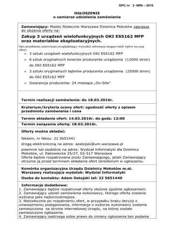 DPC nr 2 -WIN – 2016 OGŁOSZENIE o zamiarze udzielenia zamówienia Zamawiający: Miasto Stołeczne Warszawa Dzielnica Mokotów zaprasza do złożenia oferty na: Zakup 3 urządzeń wielofunkcyjnych OKI ES5162 MFP oraz materiałów eksploatacyjnych. Opis przedmiotu zamówienia uwzględniający wszystkie informacje mogące mieć wpływ na ceną oferty: • 3 sztuki urządzeń wielofunkcyjnych OKI ES5162 MFP • 6 sztuk oryginalnych tonerów producenta urządzenia (12000 stron) do OKI ES5162 MFP • 3 sztuki oryginalnych bębnów producenta urządzenia (25000 stron) do OKI ES5162 MFP • Gwarancja producenta: 24 miesiące „On-Site” Termin realizacji zamówienia: do 18.03.2016r. Kryterium/kryteria oceny ofert: zgodność oferty z opisem przedmiotu zamówienia i cena Termin składania ofert: 14.03.2016r. do godz. 12:00 Termin związania ofertą: 18.03.2016r. Oferty można składać: faksem, nr faksu: 22 5651441 drogą elektroniczną na adres: [email protected] pisemnie lub osobiście na adres: Wydział Informatyki dla Dzielnicy Mokotów, ul. Rakowiecka 25/27, 02-517 Warszawa Oferta będzie rozpatrywana przez Zamawiającego, jeżeli Zamawiający otrzyma ją przed terminem składania ofert określonym w ogłoszeniu. Komórka organizacyjna Urzędu Dzielnicy Mokotów m.st. Warszawy realizująca wydatek: Wydział Informatyki Osoba do kontaktu: Adam Ostojski tel: 22 5651440 Informacje dodatkowe: 1. Zamawiający będzie rozpatrywał oferty złożone zgodnie ogłoszeniem. 2. Zamawiający udzieli zamówienia wykonawcy, którego oferta zostanie wybrana jako najkorzystniejsza. 3. Niezwłocznie po rozpatrzeniu ofert, w przypadku braku decyzji o unieważnieniu postępowania, informacja o wyborze wykonawcy zostanie zamieszczona na stronie internetowej Urzędu, na której zostało zamieszczone ogłoszenie. 4. Zamawiający zastrzega sobie prawo do zmiany ogłoszenia bez podania przyczyn. 5. Zamawiający zastrzega sobie prawo odwołania ogłoszenia w każdym czasie bez podawania przyczyn. 6. W sprawie nie ujętych w ogłoszeniu mają zastosowanie przepisy kodeksu cywilnego. Załączniki 1. wzór/projekt umowy 2. wzór oferty /-/ Adam Ostojski Naczelnik Wydziału Informatyki .................................................... data, podpis i pieczątka kierownika komórki organizacyjnej realizującej wydatek