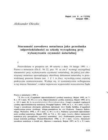 Rejent . r o k 9 . nr 11(103) listopad 1999 r. Aleksander Oleszko Staranność zawodowa notariusza jako przesłanka odpowiedzialności za szkodę wyrządzoną przy wykonywaniu czynności notarialnej I Przewidziane w przepisie art. 49 ustawy z dnia 14 lutego 1991 r. Prawo o notariacie (Dz.U. Nr 22, poz. 91 ze zm.)1 wymogi szczególnej staranności przy wykonywaniu czynności notarialnej, do jakiej jest obowiązany notariusz sporządzający określony dokument notarialny w przewidzianej prawem formie (art. 1 § 1 in fine), wywołują coraz częściej praktyczne zainteresowanie. Wydaje się, iż systematycznie wzbogacana w tej mierze literatura2, a także najnowsze wypowiedzi orzecznictwa Sądu 1 Prawo o notariacie z 1991 r. 2 Z. B a s a k, Z zagadnień odpowiedzialności cywilnej notariuszy, Rejent 1992, nr 78, s. 43 i nast.; M. FI o r c z a k, Odpowiedzialność cywilna notariuszy, Rejent 1995, nr 4, s. 113 i nast.; B. L e w a s z k i e w i c z - P e t r y k o w s k a , Uwagi o zasadach rządzących cywilną odpowiedzialnością notariusza, Przegląd Sądowy 1995, nr 2, s. 16 i nast.; t e j ż e , Uwagi o zawodowym obowiązku udzielania informacji, [w:] Studia Iuridica. Z zagadnień współczesnego prawa cywilnego. Księga pamiątkowa ku czci Profesora Tomasza Dybowskiego, Warszawa 1994, s. 47 i nast.; A. 01 e s z k o, Podstawy i przestanki odpowiedzialności cywilnej notariuiszy, Rejent 1992, nr 7-8, s. 18 i nast.; t e n ż e , Zakres staranności notariusza przy sporządzeniu czynności notarialnej, [w:] Problematyka prawna reprywatyzacji notariatu polskiego, Poznań-Kluczbork 1996, s. 67 i nast.; t e n ż e , Staranność zawodowa notariusza w świetle art. 80prawa o notariacie, Rejent 1997, nr 9, s. 9 i nast.; 115 C Aleksander Oleszko Najwyższego 3 , nie wyczerpują nasuwających się na tle powyższego uregulowania problemów oraz wątpliwości, których kolejne podjęcie usprawiedliwiają także ostatnie doniesienia prasowe4. Coraz częściej media donoszą o sporządzonych przez notariuszy aktach notarialnych, w których - ich zdaniem - dochodzi do fałszowania umów sprzedaży nieruchomości, najczęściej lokali mieszkalnych, domów o znacznej wartości rynkowej. Na wokandy sądów trafiają również przeciwko notariuszom sprawy cywilne oraz karne z tytułu odpowiedzialności za wyrządzoną szkodę oraz za popełnione przez notariusza tzw. przestępstwo fałszu intelektualnego. W tym ostatnim przypadku zarzut polegać ma na poświadczeniu nieprawdy w sporządzonym przez notariusza dokumencie. W takich sytuacjach zarzuca się notariuszowi, iż bez należytej staranności sporządził np. umowę sprzedaży nieruchomości na skutek przedłożonemu mu sfałszowanego pełnomocnictwa, czy innego dokumentu stanowiącego podstawę do dokonania danej czynności notarialnej. Gdyby bowiem należycie „sprawdził" okazane mu dokumenty, to bez wątpienia stwierdziłby, iż sprzedawca w chwili zawarcia umowy liczy 126 lat, a mocodawca w chwili udzielonego pełnomocnictwa był małoletni. Wskazując na zawodową staranność notariusza sporządzającego akt notarialny stwierdzający zawarcie umowy przeniesienia własności nieruchomości, można zauważyć, że częstokroć notariusz w tzw. części opisowej aktu dotyczącej nieruchomości powołuje się na dane zawarte w tenże, Odpowiedzialność notariusza za szkodę powstałą w związku z błędną wykładnią prawa (uwagi na tle wyroku Sądu Najwyższego z dnia 7 listopada 1997 r. IICKN 420/97, Rejent 1998, nr 7-8, s. 27 i nast.; A. W ą s i e w i c z, Odpowiedzialność cywilna notariuszy i jej ubezpieczenie, [w:] Księga pamiątkowa. I Kongres Notariuszy Rzeczypospolitej Polskiej, Poznań-Kluczbork 1993, s. 301 i nast.; K. Wo lny, Odpowiedzialność cywilna notariusza. Próba interpretacji art. 43 prawa o notariacie, Przegląd Notarialny 1934, nr 7, s. 150 i nast.; K. Ż u r a w s k i , O zobowiązaniach i odpowiedzialności notariusza ze stanowiska prawa o notariacie i w świetle najnowszego orzecznictwa niemieckiego, Przegląd Notarialny 1934, nr 21, s. 485 i nast. 3 Wyrok z dnia 7 listopada 1997 r. II CKN 420/97, OSN IC 1998, z. 5, poz. 76. 4 Chodzi przede wszystkim o doniesienia prasowe związane ze sprzedażą nieruchomości zabudowanych domami wielomieszkaniowymi w Krakowie, które przed II wojną światową stanowiły własność Żydów, oraz o sporządzenie umów na podstawie sfałszowanych pełnomocnictw udzielonych jakoby przez właścicieli-sprzedawców, zob. M. Z i e l i ń s k a , Trzeci świadek, Prawo i Życie 1997, nr 9, s. 12; A. 01 e sz k o, Staranność zawodowa notariusza..., s. 13. 116 Staranność zawodowa notariusza jako przesłanka odpowiedzialności... przedłożonym mu odpisie księgi wieczystej (zob. § 2 rozporządzenia Ministra Sprawiedliwości z dnia 18 marca 1992 r. w sprawie wykonania przepisów ustawy o księgach wieczystych i hipotece, Dz.U. Nr 29, poz. 128 ze zm.), uznając, iż dowód ten jest wystarczającą podstawą do stwierdzenia sytuacji prawnej przedmiotowej nieruchomości. Dla porządku w akcie tym czyni stosowne stwierdzenie (por. art. 92 § 3 zd. 2), przytaczając datę i numer przedłożonego mu odpisu księgi wieczystej. Jednakże niekiedy w praktyce prokuratorskiej uważa się, iż szczególna staranność notariusza, o której mowa w przepisie art. 49, nakłada na niego obowiązek osobistego zapoznania się z treścią danej księgi wieczystej, ażeby „ponad wszelką wątpliwość" przekonać się o „prawdziwości dokonanych wpisów w księdze wieczystej". Według tego poglądu, notariusz nie może zatem przy sporządzeniu aktu notarialnego poprzestać na okazanym mu odpisie z księgi wieczystej. Jeszcze większe wątpliwości wywołuje praktyka niektórych notariuszy, którzy poprzestają na oświadczeniu sprzedającego nieruchomość co do treści wpisów w księdze wieczystej prowadzonej dla tej nieruchomości, nie żądając od zbywcy nawet odpisu księgi wieczystej. Co wię