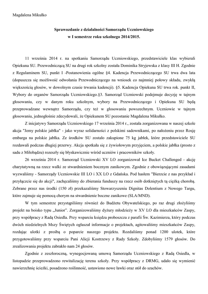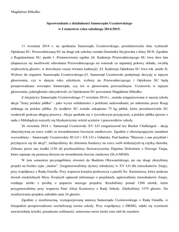 Magdalena Mikułko Sprawozdanie z działalności Samorządu Uczniowskiego w I semestrze roku szkolnego 2014/2015. 11 września 2014 r. na spotkaniu Samorządu Uczniowskiego, przedstawiciele klas wybierali Opiekuna SU. Przewodniczącą SU na drugi rok szkolny została Dominika Stryjewska z klasy III H. Zgodnie z Regulaminem SU, punkt I -Postanowienia ogólne §4. Kadencja Przewodniczącego SU trwa dwa lata (dopuszcza się możliwość odwołania Przewodniczącego na wniosek co najmniej połowy składu, zwykłą większością głosów, w dowolnym czasie trwania kadencji). §5. Kadencja Opiekuna SU trwa rok. punkt II, Wybory do organów Samorządu Uczniowskiego.§3. Samorząd Uczniowski podejmuje decyzję w tajnym głosowaniu, czy w danym roku szkolnym, wybory na Przewodniczącego i Opiekuna SU będą przeprowadzane wewnątrz Samorządu, czy też w głosowaniu powszechnym. Uczniowie w tajnym głosowaniu, jednogłośnie zdecydowali, że Opiekunem SU pozostanie Magdalena Mikułko. Z inicjatywy Samorządu Uczniowskiego 17 września 2014 r., została zorganizowana w naszej szkole akcja "Jemy polskie jabłka" - jako wyraz solidarności z polskimi sadownikami, po nałożeniu przez Rosję embarga na polskie jabłka. Ze środków SU zostało zakupione 75 kg jabłek, które przedstawiciele SU rozdawali podczas długiej przerwy. Akcja spotkała się z żywiołowym przyjęciem, a polskie jabłka (prosto z sadu z Miłobądzu) rozeszły się błyskawicznie wśród uczniów i pracowników szkoły. 26 września 2014 r. Samorząd Uczniowski XV LO zorganizował Ice Bucket Challenged - akcję charytatywną na rzecz walki ze stwardnieniem bocznym zanikowym. Zgodnie z obowiązującymi zasadami wyzwaliśmy - Samorządy Uczniowskie III LO i XX LO z Gdańska. Pod hasłem "Bierzcie z nas przykład i przyłączcie się do akcji", zachęcaliśmy do zbierania funduszy na rzecz osób dotkniętych tą ciężką chorobą. Zebrane przez nas środki (150 zł) przekazaliśmy Stowarzyszeniu Dignitas Dolentium z Nowego Targu, które zajmuje się pomocą chorym na stwardnienie boczne zanikowe (SLA/MND). W tym semestrze przystąpiliśmy również do Budżetu Obywatelskiego, po raz drugi złożyliśmy projekt na boisko typu „Junior”. Zorganizowaliśmy dyżury młodzieży w XV LO dla mieszkańców Zaspy, przy współpracy z Radą Osiedla. Przy wsparciu księdza proboszcza z parafii Św. Kazimierza, który podczas dwóch niedzielnych Mszy Świętych ogłaszał informacje o projektach, agitowaliśmy mieszkańców Zaspy, rozdając ulotki z prośbą o poparcie naszego projektu. Rozdaliśmy ponad 1200 ulotek, które przygotowaliśmy przy wsparciu Pani Alicji Kostrzewy z Rady Szkoły. Zdobyliśmy 1579 głosów. Do zrealizowania projektu zabrakło nam 24 głosów. Zgodnie z zeszłoroczną, wynegocjowaną umową Samorządu Uczniowskiego z Radą Osiedla, w listopadzie przeprowadzono rewitalizację terenu szkoły. Przy współpracy z DRMG, udało się wymienić nawierzchnię ścieżki, posadzono roślinność, ustawiono nowe ławki oraz stół do szachów. 11 listopada 2014 r. już po raz drugi, chętni uczniowie naszej szkoły wzięli udział w XII Gdańskiej Paradzie Niepodległości, organizowanej przez Stowarzyszenie SUM. Ponad setka uczniów XV, przemaszerowała ulicami Gdańska z biało-czerwonymi opaskami dla upamiętnienia 70. rocznicy wybuchu Powstania Warszawskiego. Tego dnia uczniowie XV świętowali 96 rocznicę odzyskania niepodległości przez Polskę. Projekt Samorządu Uczniowskiego koordynowała klasa I E - Natalia Krupa i Sebastian Przybył oraz opiekun SU i nauczyciele wspomagający: Grzegorz Kuleta i Marek Dąbrowski. 21 listopada 2014 roku odbyła się „Noc w szkole”. Ta czwarta edycja, corocznej imprezy zgromadziła prawie 50 uczniów naszej szkoły. Nocowanie rozpoczęły zabawy integracyjne, później w programie było karaoke, poczęstunek, bieg na orientacje, turniej siatkówki, projekcje filmowe. Koordynatorem projektu był Marek Dąbrowski i klasa 0 H, nauczyciele wspomagający: Magdalena Mikułko, Grażyna Groth, Andrzej Lasota, Grzegorz Kuleta i Rafał Śnieżko. Przez cały listopad klasa II F realizowała projekt „Pomoc dla schroniska”. Zebrano: ręczniki, narzuty, koce, miski, smycze, szelki, obroże. Ze sprzedaży ciast, która odbyła się 12 listopada uzbierano 125,34zł. Pełną kwotę przeznaczono na zakup smyczy i obroży, które przekazano schronisku Promyk w Gdańsku. Projekt koordynowała Daria Kętrzyńska i wychowawczyni kl. II F Ewa Przybyłowicz. W tym semestrze Samorząd Uczniowski XV LO, nawiązał współpracę z Polskim Stowarzyszeniem na Rzecz Osób z Upośledzeniem Umysłowym Koło w Gdańsku, które mieści się przy ul. Jagiellońskiej 11. W II semestrze chcemy zorganizować spotkania informacyjne i zachęcać uczniów XV do włączenia się w projekt Stowarzyszenia „Starszy brat, starsza siostra”. Koordynatorką projektu została Dominika Dróżdż z klasy II E. Z inicjatywy Samorządu Uczniowskiego, w grudniu odbyła się w naszej szkole akcja "Świąteczna Paczka XV LO", którą koordynowała klasa I D. Zbieraliśmy pieniądze na zakup paczek świątecznych (żywność, środki czystości) dla czterech rodzin. W zorganizowaniu akcji pomógł nam ksiądz proboszcz z parafii p.w. Św. Kazimierza z Zaspy, któremu 18 grudnia przekazaliśmy paczki dla trzech rodzin. W piątek, 19 grudnia uczniowie wraz z opiekunem, zawieźli paczki do samotnej matki z Ujeściska, która wychowuje cztery córki w wieku 9, 7, 3 lata i 2 miesiące. W sumie udało nam się wręczyć paczki za kwotę 1264 zł (zebraliśmy wśród uczniów 794 zł.) Wsparła nas również dyrekcja, nauczyciele i pracownicy szkoły (470 zł). W akcję zaangażowani byli: Krzysztof Wasilewski z kl. I D, Dominika Dróżdż, Martyna Cieszyńska i Karolina Marcyńska z kl. II E. 19 grudnia 2014 r. podczas wigilii klasowych, został przeprowadzony Konkurs Świąteczny, na najładniej udekorowaną salę. W skład ju