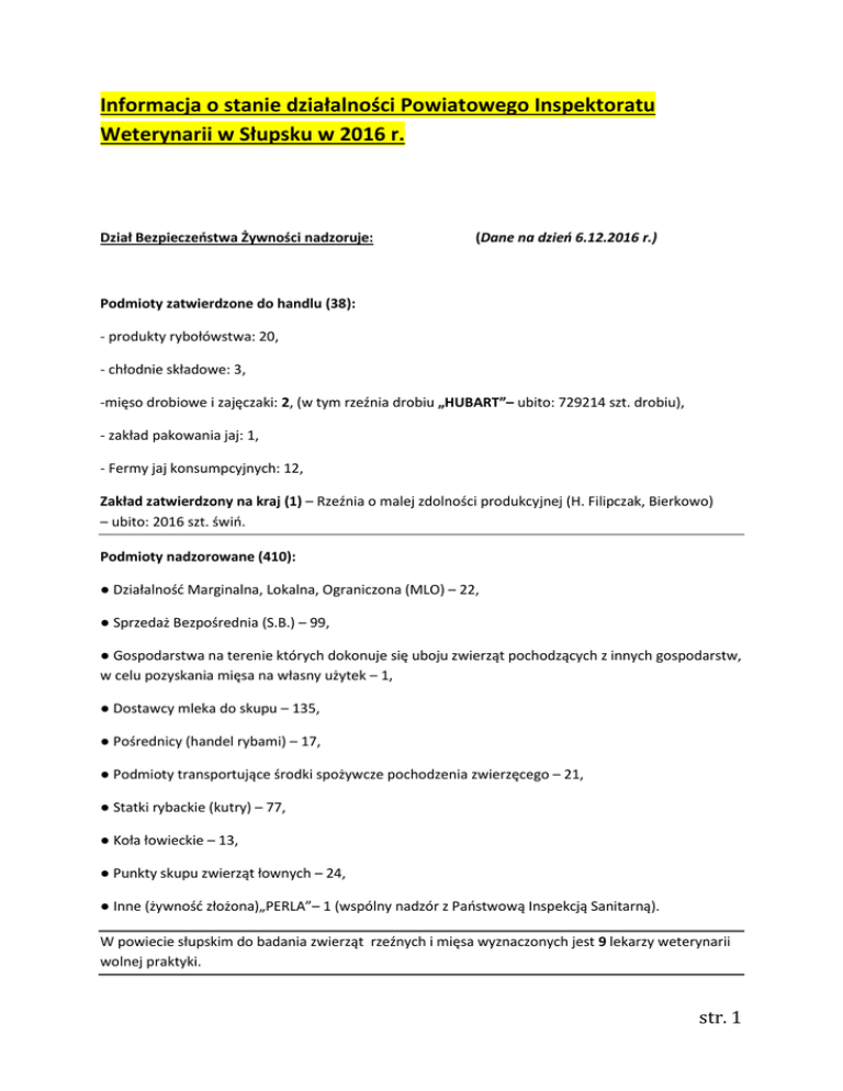 Informacja o stanie działalności Powiatowego Inspektoratu Weterynarii w Słupsku w 2016 r. Dział Bezpieczeństwa Żywności nadzoruje: (Dane na dzień 6.12.2016 r.) Podmioty zatwierdzone do handlu (38): - produkty rybołówstwa: 20, - chłodnie składowe: 3, -mięso drobiowe i zajęczaki: 2, (w tym rzeźnia drobiu „HUBART”– ubito: 729214 szt. drobiu), - zakład pakowania jaj: 1, - Fermy jaj konsumpcyjnych: 12, Zakład zatwierdzony na kraj (1) – Rzeźnia o malej zdolności produkcyjnej (H. Filipczak, Bierkowo) – ubito: 2016 szt. świń. Podmioty nadzorowane (410): ● Działalność Marginalna, Lokalna, Ograniczona (MLO) – 22, ● Sprzedaż Bezpośrednia (S.B.) – 99, ● Gospodarstwa na terenie których dokonuje się uboju zwierząt pochodzących z innych gospodarstw, w celu pozyskania mięsa na własny użytek – 1, ● Dostawcy mleka do skupu – 135, ● Pośrednicy (handel rybami) – 17, ● Podmioty transportujące środki spożywcze pochodzenia zwierzęcego – 21, ● Statki rybackie (kutry) – 77, ● Koła łowieckie – 13, ● Punkty skupu zwierząt łownych – 24, ● Inne (żywność złożona)„PERLA”– 1 (wspólny nadzór z Państwową Inspekcją Sanitarną). W powiecie słupskim do badania zwierząt rzeźnych i mięsa wyznaczonych jest 9 lekarzy weterynarii wolnej praktyki. str. 1 Zbadano: 1940 szt. świń, 1459.szt. dzików. Stwierdzono 9 przypadków włośnicy u dzików, 706639szt. drobiu (HUBART). Monitoring żywności: pobrano 83 prób żywności ( wg. zakresu i harmonogramu określonego przez Państwowy Instytut Weterynaryjny w Puławach oraz Wojewódzki Inspektorat Weterynarii w Gdańsku). Odprawy eksportowe do krajów trzecich: (łącznie z wystawieniem stosownych świadectw i załażeniem plomb) - 456. Dział Bezpieczeństwa Żywności przeprowadził 447 kontroli, wystawił 247 Decyzji Administracyjnych. Nałożono 13 mandatów na sumę 2650 zł oraz 1 karę pieniężną na sumę 200 zł. Współpraca: Współpraca z Państwową Inspekcją Sanitarną odbywa się w oparciu o zawarte porozumienie na szczeblu powiatowym. Wspólne kontrole w sklepach prowadzących produkcję mięsa i wędlin (np.„E.LECLERC”, „INRTRMARCHE”, „PERLA”, „Daglezja”, Sano, Społem), miejscami nielegalnej produkcji żywności lub obrotu (w przypadku zgłoszeń). W miarę zaistniałej potrzeby współpraca z innymi instytucjami np. jednostkami samorządu terytorialnego, Policją, Państwową Inspekcją Jakości Środków Spożywczych, Urzędem Celnym. Narady i szkolenia: Narady i szkolenia z lekarzami wyznaczonymi do badania zwierząt rzeźnych i mięsa ze szczególnym uwzględnieniem: - omówienia dokumentacji prowadzonej przez lekarzy urzędowych; - przekazaniem informacji o nowych przepisach prawnych, procedurach i instrukcjach; - omówienie występujących nieprawidłowości w nadzorowanych podmiotach. – min. 2 w roku. Narady z podmiotami – producentami żywności – według zaistniałych potrzeb w celu przekazania istotnych informacji dotyczących prowadzonych działalności. Pasze i Utylizacja Dział nadzoruje następujące podmioty: Dystrybucja pasz – 21 Obrót papierowy paszami – 2 Transport pasz – 12 Zakłady techniczne (garbarnie) – 2 Transport uppz – 14 Obrót uppz – 6 Zakład pośredni uppz – 1 Biogazownia – 1 Produkcja karmy dla zwierząt domowych – 1 Fermy mięsożernych zwierząt futerkowych – 17 str. 2 Obrót paszami )lek. wet.) – 13 Gospodarstwa rolne (produkcja pierwotna) – 973 Przeprowadzono w tym dziale 110 kontroli, wydano 78 decyzji administracyjnych, pobrano 54 prób urzędowych w ramach monitoringu pasz. Kar pieniężnych nie było. Powiatowy Lekarz Weterynarii w Słupsku przedstawia poniżej informacje dotyczące stanu sanitarko – weterynaryjnego w powiecie słupskim za 2016 rok. I. Zestawienie pogłowia zwierząt oraz siedzib stad na terenie powiatu słupskiego ( stan na 6.12.2016 r.) 1. Bydło – 462 stada (11329 zwierząt) 2. Owce – 35 stad (1491 zwierząt) 3. Kozy – 29 stad ( 215 zwierząt) 4. Świnie – 472 stada (61165 zwierząt) 5. Konie – 160 zarejestrowanych właścicieli w PZHK Co roku w zakresie dobrostanu zwierząt kontrolowanych jest 5 % stad z każdego gatunku. Największe fermy świń – Skarszów Górny – ok 16.000) – Płaszewo – ok 8.000 – Strzyżyno – ok 6.000 Największe fermy bydła – Dochowo – 856 – Dargoleza – 773 – Bobrowniki – 470 Największe fermy kur – nioski – Adkonis – 2 kurniki (ok. 100.000 szt. drobiu przypadające na jedno wstawienie), 2 odchowalnie (ok. 220.000) – brojlery – Żelice – 5 kurników (ok. 100.000) – Osowo – 3 kurniki (ok. 100.000) - Bierkowo – 5 kurników (ok. 100.000) II. Podmioty nadzorowane (320): Drób hodowlany – 1 Odchowalnie drobiu – 3 Zakład wylęgu drobiu – 1 Kury nioski towarowe – 16 Brojlery kurze – 19 str. 3 Gospodarstwa akwakultury (w tym ślimaki) – 43 Schronisko dla bezdomnych zwierząt – 1 Pośrednicy w obrocie zwierzętami – 4 Punkty kopulacyjne – 4 Punkty unasieniania – 6 ZOO – 1 Zwierzęta dzikie utrzymywane jako gospodarskie – 5 Przewoźnicy zwierząt – 18 Pasieki – 191 Co roku kontroli podlega 100% podmiotów nadzorowanych, z wyjątkiem pasiek, które kontrolowane są w przypadku podejrzenia/wystąpienia choroby zakaźnej. III. W 2016 r. do czynności urzędowych w zakresie zwalczania chorób zakaźnych wyznaczonych było 22 lekarzy weterynarii. IV. W ramach kontroli identyfikacji i rejestracji zwierząt oraz wymogów wzajemnej zgodności przeprowadzono 33 kontrole. V. Zapobieganie i zwalczanie chorób zakaźnych zwierząt: 1. Wykonano: 1613-Badań bydła w kierunku TBC – gruźlica bydła 2685 - Badań w kierunku EBB – enzootyczna białaczka bydła 1550 - Badan w kierunku brucelozy bydła 57 - Badan w kierunku brucelozy owiec i kóz 1520 - Badań w kierunku choroby Aujeszkyego 12877 - Szczepień psów i kotów przeciwko wściekliźnie 8 - badań w kierun