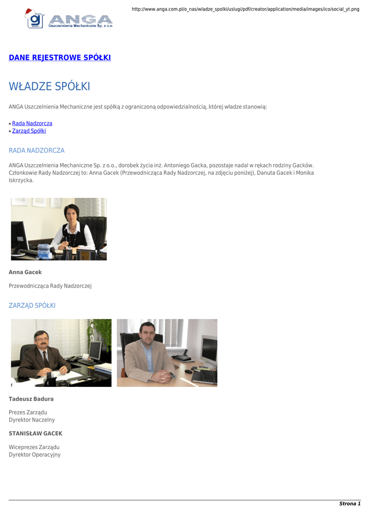 http://www.anga.com.pl/o_nas/wladze_spolki/uslugi/pdf/creator/application/media/images/ico/social_yt.png DANE REJESTROWE SPÓŁKI WŁADZE SPÓŁKI ANGA Uszczelnienia Mechaniczne jest spółką z ograniczoną odpowiedzialnością, której władze stanowią: ■ ■ Rada Nadzorcza Zarząd Spółki RADA NADZORCZA ANGA Uszczelnienia Mechaniczne Sp. z o.o., dorobek życia inż. Antoniego Gacka, pozostaje nadal w rękach rodziny Gacków. Członkowie Rady Nadzorczej to: Anna Gacek (Przewodnicząca Rady Nadzorczej, na zdjęciu poniżej), Danuta Gacek i Monika Iskrzycka. Anna Gacek Przewodnicząca Rady Nadzorczej ZARZĄD SPÓŁKI Tadeusz Badura Prezes Zarządu Dyrektor Naczelny STANISŁAW GACEK Wiceprezes Zarządu Dyrektor Operacyjny Strona 1 http://www.anga.com.pl/o_nas/wladze_spolki/uslugi/pdf/creator/application/media/images/ico/social_yt.png Jacek Weigel Dyrektor Handlowy Prokurent Ewa Muś Główna Księgowa Prokurent Strona 2