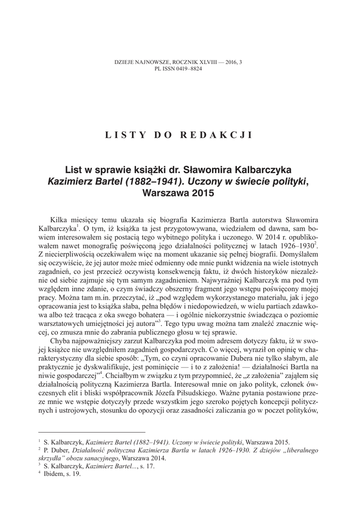 DZIEJE NAJNOWSZE, ROCZNIK XLVIII — 2016, 3 PL ISSN 0419–8824 LISTY DO REDAKCJI List w sprawie książki dr. Sławomira Kalbarczyka Kazimierz Bartel (1882–1941). Uczony w świecie polityki, Warszawa 2015 Kilka miesięcy temu ukazała się biografia Kazimierza Bartla autorstwa Sławomira Kalbarczyka1. O tym, iż książka ta jest przygotowywana, wiedziałem od dawna, sam bowiem interesowałem się postacią tego wybitnego polityka i uczonego. W 2014 r. opublikowałem nawet monografię poświęconą jego działalności politycznej w latach 1926–19302. Z niecierpliwością oczekiwałem więc na moment ukazanie się pełnej biografii. Domyślałem się oczywiście, że jej autor może mieć odmienny ode mnie punkt widzenia na wiele istotnych zagadnień, co jest przecież oczywistą konsekwencją faktu, iż dwóch historyków niezależnie od siebie zajmuje się tym samym zagadnieniem. Najwyraźniej Kalbarczyk ma pod tym względem inne zdanie, o czym świadczy obszerny fragment jego wstępu poświęcony mojej pracy. Można tam m.in. przeczytać, iż „pod względem wykorzystanego materiału, jak i jego opracowania jest to książka słaba, pełna błędów i niedopowiedzeń, w wielu partiach zdawkowa albo też tracąca z oka swego bohatera — i ogólnie niekorzystnie świadcząca o poziomie warsztatowych umiejętności jej autora”3. Tego typu uwag można tam znaleźć znacznie więcej, co zmusza mnie do zabrania publicznego głosu w tej sprawie. Chyba najpoważniejszy zarzut Kalbarczyka pod moim adresem dotyczy faktu, iż w swojej książce nie uwzględniłem zagadnień gospodarczych. Co więcej, wyraził on opinię w charakterystyczny dla siebie sposób: „Tym, co czyni opracowanie Dubera nie tylko słabym, ale praktycznie je dyskwalifikuje, jest pominięcie — i to z założenia! — działalności Bartla na niwie gospodarczej”4. Chciałbym w związku z tym przypomnieć, że „z założenia” zająłem się działalnością polityczną Kazimierza Bartla. Interesował mnie on jako polityk, członek ówczesnych elit i bliski współpracownik Józefa Piłsudskiego. Ważne pytania postawione przeze mnie we wstępie dotyczyły przede wszystkim jego szeroko pojętych koncepcji politycznych i ustrojowych, stosunku do opozycji oraz zasadności zaliczania go w poczet polityków, S. Kalbarczyk, Kazimierz Bartel (1882–1941). Uczony w świecie polityki, Warszawa 2015. P. Duber, Działalność polityczna Kazimierza Bartla w latach 1926–1930. Z dziejów „liberalnego skrzydła” obozu sanacyjnego, Warszawa 2014. 3 S. Kalbarczyk, Kazimierz Bartel..., s. 17. 4 Ibidem, s. 19. 1 2 214 LISTY DO REDAKCJI których zwykło się określać jako sanacyjnych „liberałów”5. Już zwykły zdrowy rozsądek podpowiada, że w przypadku podobnego ujęcia tematu problemy ekonomiczne powinny być uwzględnione w zakresie „niezbędnym do ukazania ówczesnych procesów politycznych oraz koncepcji ustrojowych”6. Problematyka gospodarcza nie została więc pominięta, lecz uwzględniona jedynie w takim stopniu, w jaki uznałem to za konieczne z punktu widzenia zdefiniowanych przez siebie problemów badawczych (uwagi te dotyczą zresztą także innych dziedzin działalności Bartla, np. jego stosunku do Kościoła katolickiego i edukacji). No cóż, Kalbarczyk najwyraźniej nie był w stanie tego zrozumieć, z czego oczywiście nie można mu robić zarzutu. Podobnie zresztą jak nie mógł pojąć różnic w samych założeniach obu naszych publikacji. Moja monografia nie jest bowiem analizą fragmentu życiorysu Bartla w latach 1926–1930, jak błędnie uważa Kalbarczyk, lecz pracą próbującą odpowiedzieć na pytanie o rzeczywistą rolę bohatera w ówczesnych mechanizmach władzy. I tym różni się ona od całościowej biografii. W związku z tym zasygnalizowane przez Kalbarczyka pytanie o „sens wyrywania z biografii politycznej znanej postaci kilku lat”7 należy już chyba pominąć pobłażliwym milczeniem. Kolejne uwagi Kalbarczyka o charakterze ogólnym odnoszą się do „usterek konstrukcyjnych”. Jako przykład wskazuje on fakt, iż sprawie wyjazdu inżyniera Stanisława Kruszewskiego za granicę poświęciłem pół strony, podczas gdy wizycie Bartla w Wolnym Mieście Gdańsku zaledwie jedno zdanie8. Problem wspomnianego wyjazdu faktycznie stanowi szczegół, który oczywiście można było pominąć. W sposób interesujący pokazuje on jednak stopień zaangażowania ówczesnego premiera w sprawy często nawet drugorzędne. Jest to także ciekawy przyczynek do relacji łączących Bartla z jego osobistym sekretarzem Stanisławem Zaćwilichowskim, będącym jak wiadomo oficerem II Oddziału9. Natomiast wizyta Bartla w Gdańsku stanowiła jedynie epizod, o czym można się zresztą przekonać, analizując odnośny fragment pracy Kalbarczyka, który opisuje przede wszystkim przebieg oficjalnych spotkań oraz streszcza okolicznościowe przemówienia. Trudno się więc dziwić, iż podsumowując skutki tej podróży, bez ogródek stwierdza, że były one „nikłe”10. Szerszy jej opis był zapewne niezbędny w przypadku całościowej biografii, nie wnosił natomiast absolutnie nic nowego z punktu widzenia problemów badawczych, o których wspominałem wcześniej. W swoich uwagach krytycznych pod moim adresem Kalbarczyk poświęcił ponad pół strony sprawie słynnego okólnika z 9 XII 1926 r. Jest to w zasadzie jedyna próba podjęcia rzetelnej dyskusji merytorycznej, choć także i ten fragment jest okraszony różnymi złośliwościami. Krytykuje on wyrażoną przeze mnie opinię na temat tego aktu prawnego oraz stosunku ówczesnego wicepremiera Bartla do Kościoła katolickiego. Zdaniem Kalbarczyka wydanie okólnika nie miało nic wspólnego z próbą zdobycia poparcia ze strony episkopatu, lecz wynikało po prostu z konieczności realizacji zawartego rok wcześniej konkordatu. Był to bowiem akt wykonawczy „do umowy z Watykanem, jaki po prostu musiał zostać wydany”11. O