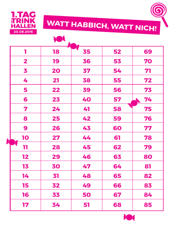 WATT HABBICH, W ATT NICH! 1 18 35 52 69 2 19 36 53 70 3 20 37 54 71 4 21 38 55 72 5 22 39 56 73 6 23 40 57 74 7 24 41 58 75 8 25 42 59 76 9 26 43 60 77 10 27 44 61 78 11 28 45 62 79 12 29 46 63 80 13 30 47 64 81 14 31 48 65 82 15 32 49 66 83 16 33 50 67 84 17 34 51 68 85