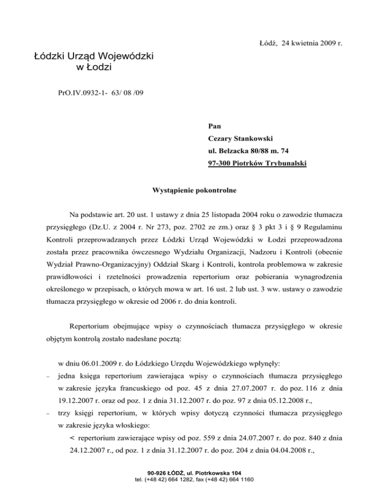 Łódź, 24 kwietnia 2009 r. Łódzki Urząd Wojewódzki w Łodzi PrO.IV.0932-1- 63/ 08 /09 Pan Cezary Stankowski ul. Belzacka 80/88 m. 74 97-300 Piotrków Trybunalski Wystąpienie pokontrolne Na podstawie art. 20 ust. 1 ustawy z dnia 25 listopada 2004 roku o zawodzie tłumacza przysięgłego (Dz.U. z 2004 r. Nr 273, poz. 2702 ze zm.) oraz § 3 pkt 3 i § 9 Regulaminu Kontroli przeprowadzanych przez Łódzki Urząd Wojewódzki w Łodzi przeprowadzona została przez pracownika ówczesnego Wydziału Organizacji, Nadzoru i Kontroli (obecnie Wydział Prawno-Organizacyjny) Oddział Skarg i Kontroli, kontrola problemowa w zakresie prawidłowości i rzetelności prowadzenia repertorium oraz pobierania wynagrodzenia określonego w przepisach, o których mowa w art. 16 ust. 2 lub ust. 3 ww. ustawy o zawodzie tłumacza przysięgłego w okresie od 2006 r. do dnia kontroli. Repertorium obejmujące wpisy o czynnościach tłumacza przysięgłego w okresie objętym kontrolą zostało nadesłane pocztą: w dniu 06.01.2009 r. do Łódzkiego Urzędu Wojewódzkiego wpłynęły: jedna księga repertorium zawierająca wpisy o czynnościach tłumacza przysięgłego w zakresie języka francuskiego od poz. 45 z dnia 27.07.2007 r. do poz. 116 z dnia 19.12.2007 r. oraz od poz. 1 z dnia 31.12.2007 r. do poz. 97 z dnia 05.12.2008 r., trzy księgi repertorium, w których wpisy dotyczą czynności tłumacza przysięgłego w zakresie języka włoskiego: < repertorium zawierające wpisy od poz. 559 z dnia 24.07.2007 r. do poz. 840 z dnia 24.12.2007 r., od poz. 1 z dnia 31.12.2007 r. do poz. 204 z dnia 04.04.2008 r., 90-926 ŁÓDŹ, ul. Piotrkowska 104 tel. (+48 42) 664 1282, fax (+48 42) 664 1160 < repertorium zawierające wpisy od poz. 205 z dnia 06.04.2008 r. do poz. 693 z dnia 29.10.2008 r.), < repertorium zawierające wpisy od poz. 694 z dnia 31.10.2008 r. do poz. 778 z dnia 30.12.2008 r., w dniu 04.02.2009 r. do Łódzkiego Urzędu Wojewódzkiego wpłynęły: repertorium tłumacza przysięgłego jęz. francuskiego wpisy od poz. 1 z dnia 04.01.2006 r. do poz. 98 z dnia 25.12.2006 r. oraz od poz. 1 z dnia 08.01.2007 r. do poz. 44 z dnia 23.07.2007 r.; repertorium tłumacza przysięgłego jęz. włoskiego zawierające wpisy od poz. 1 z dnia 01.01.2006 r. do poz. 341 z dnia 01.06.2006 r. W toku czynności kontrolnych prowadzonych w dniu 8 stycznia 2009 r. oraz w dniu 5 lutego 2009 r. stwierdzono, że nie zostało nadesłane repertorium zawierające wpisy o czynnościach tłumacza przysięgłego w zakresie jęz. włoskiego od poz. 342/2006 do końca roku 2006, a także zawierające wpisy od poz. 1 do poz. 558 w 2007 r. Skierowano do Pana pismo znak PrO.IV.0932-1-63/08/09 z dnia 10 lutego 2009 r. w sprawie nadesłania brakującego repertorium oraz dodatkowych wyjaśnień w terminie 14 dni od otrzymania pisma (odbiór pisma potwierdzono w dniu 12.02.2009 r.). Do dnia 18 marca 2009 r. brakujące repertorium jak i wyjaśnienia nie wpłynęły do Łódzkiego Urzędu Wojewódzkiego i kontrolę zakończono. W związku z kontrolą, której wyniki przedstawione zostały w protokole kontroli podpisanym przez Pana w dniu 2 kwietnia 2009 roku, na podstawie § 23 Regulaminu Kontroli przeprowadzanych przez Łódzki Urząd Wojewódzki przekazuję niniejsze wystąpienie pokontrolne, zawierające ocenę kontrolowanej działalności. Po przeprowadzonej kontroli, w zakresie prawidłowości i rzetelności prowadzenia repertorium stwierdzono, że: 1. W repertorium, gdzie odnotowano czynności tłumacza przysięgłego w zakresie języka francuskiego : we wszystkich wpisach w rubryce: „rodzaj czynności wykonanej i język tłumaczenia lub odpisu” zapisano język tłumaczenia lub odpisu, nie zapisano jednak rodzaju czynności wykonanej, w poz. 56 odnotowanej w 2006 r. zapisano datę zlecenia: „29.08.2009 r.”. W swoim piśmie z dnia 02.04.2009 r. wyjaśnił Pan, iż był to „czeski błąd”, a wpis o dacie zlecenia w tej pozycji powinien brzmieć: „29.08.06.”. 90-926 ŁÓDŹ, ul. Piotrkowska 104 tel. (+48 42) 664 1282, fax (+48 42) 664 1160 w poz. 107/2007 w opisie tłumaczonego dokumentu w rubryce: „język, w którym dokument sporządzono” zamieszczono informację o treści: „francusko-flam.”, a w rubryce: „rodzaj czynności wykonanej i język tłumaczenia lub odpisu” zamieszczono informację: „polski”, w poz. 108/2007 w opisie tłumaczonego dokumentu w rubryce: „język, w którym dokument sporządzono” zamieszczono informację o treści: „flam.”, a w rubryce: „rodzaj czynności wykonanej i język tłumaczenia lub odpisu” zamieszczono informację: „polski”, w niektórych pozycjach w rubryce: „uwagi” zamieszczono następujące zapisy: w poz. 12/2006 - „francuski i flamandzki”, w poz. 25/2006 - „francuski i angielski jednobrzmiące”, w poz. 26/2006 - „francuski i flamandzki”, w poz. 27/2006 - „francuski, flamandzki, niemiecki”, w poz. 28/2006 - „francuski, flamandzki”, w poz. 31/2006 - „flamandzki układ jak we francuskim”, w poz. 34/2006 - „flamandzki, francuski, niemiecki, stały układ nadruki i treści”, w poz. 54/2006 - „francuski, flamandzki, niemiecki”, w poz. 65/2006 - „francuski, flamandzki”, w poz. 66/2006 - „(fragmenty i logo po flamandzku)”, w poz. 73/2006 - „niem. fran. Włoski i retoromański”, w poz. 93/2006 - „fran. flam. niemiecki, 2 i 3 po flamandzku, STANDARD”, w poz. 94/2006 - „odręczny z układu francuskiego – flamandzki”, w poz. 98/2006 - „francuski, flamandzki, niemiecki, stałe nadruki i treści”, w poz. 41/2007 - „potwierdzenie, układ francuski, flamandzko – polski”, w poz. 43/2007 - „2 i 3 flamandzki z układu fran.”. 2. W repertorium, gdzie odnotowano czynności tłumacza przysięgłego w zakresie języka włoskiego: we wszystkich wpisach w rubryce: „rodzaj czynności wykonanej i języka tłumaczenia lub odpisu” zapisano język tłumaczenia lub odpisu, nie zapisano jednak rodzaju czynności wyko