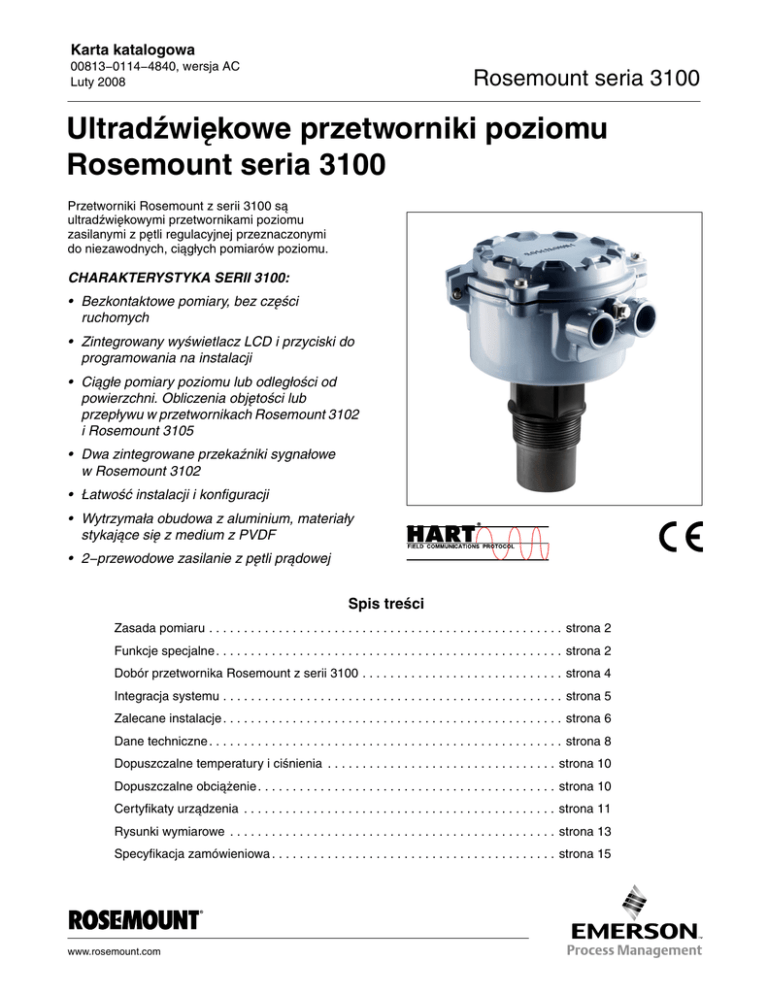 Karta katalogowa 00813−0114−4840, wersja AC Luty 2008 Rosemount seria 3100 Ultradźwiękowe przetworniki poziomu Rosemount seria 3100 Przetworniki Rosemount z serii 3100 są ultradźwiękowymi przetwornikami poziomu zasilanymi z pętli regulacyjnej przeznaczonymi do niezawodnych, ciągłych pomiarów poziomu. CHARAKTERYSTYKA SERII 3100: • Bezkontaktowe pomiary, bez części ruchomych • Zintegrowany wyświetlacz LCD i przyciski do programowania na instalacji • Ciągłe pomiary poziomu lub odległości od powierzchni. Obliczenia objętości lub przepływu w przetwornikach Rosemount 3102 i Rosemount 3105 • Dwa zintegrowane przekaźniki sygnałowe w Rosemount 3102 • Łatwość instalacji i konfiguracji • Wytrzymała obudowa z aluminium, materiały stykające się z medium z PVDF • 2−przewodowe zasilanie z pętli prądowej Spis treści Zasada pomiaru . . . . . . . . . . . . . . . . . . . . . . . . . . . . . . . . . . . . . . . . . . . . . . . . . . . strona 2 Funkcje specjalne . . . . . . . . . . . . . . . . . . . . . . . . . . . . . . . . . . . . . . . . . . . . . . . . . . strona 2 Dobór przetwornika Rosemount z serii 3100 . . . . . . . . . . . . . . . . . . . . . . . . . . . . . strona 4 Integracja systemu . . . . . . . . . . . . . . . . . . . . . . . . . . . . . . . . . . . . . . . . . . . . . . . . . strona 5 Zalecane instalacje . . . . . . . . . . . . . . . . . . . . . . . . . . . . . . . . . . . . . . . . . . . . . . . . . strona 6 Dane techniczne . . . . . . . . . . . . . . . . . . . . . . . . . . . . . . . . . . . . . . . . . . . . . . . . . . . strona 8 Dopuszczalne temperatury i ciśnienia . . . . . . . . . . . . . . . . . . . . . . . . . . . . . . . . . strona 10 Dopuszczalne obciążenie . . . . . . . . . . . . . . . . . . . . . . . . . . . . . . . . . . . . . . . . . . . strona 10 Certyfikaty urządzenia . . . . . . . . . . . . . . . . . . . . . . . . . . . . . . . . . . . . . . . . . . . . . strona 11 Rysunki wymiarowe . . . . . . . . . . . . . . . . . . . . . . . . . . . . . . . . . . . . . . . . . . . . . . . strona 13 Specyfikacja zamówieniowa . . . . . . . . . . . . . . . . . . . . . . . . . . . . . . . . . . . . . . . . . strona 15 www.rosemount.com Karta katalogowa Rosemount seria 3100 00813−0114−4840, wersja AC Luty 2008 Niezawodność i uniwersalność Przetworniki Rosemount z serii 3100 są przetwornikami poziomu cieczy działającymi w oparciu o technologię ultradźwiękową. ZASADA POMIARU Ultradźwiękowe impulsy generowane przez przetwornik odbijają się od powierzchni cieczy. Przetwornik odbiera odbite sygnały (echa) i mierzy opóźnienie czasowe między sygnałem nadawanym a odbieranym. Pomiary przepływu w otwartych kanałach Przetworniki Rosemount 3102 i 3105 mogą również obliczać natężenie przepływu w otwartych kanałach. Przetwornik ma bibliotekę profili przepływu dla standardowych otwartych kanałów, obsługuje również zdefiniowane przez użytkownika profile przepływu. Do pamięci przetwornika można wprowadzić 10−punktową tabelę przybliżeń kształtu zbiornika i struktury przepływu. Obliczone natężenie przepływu może być wysłane przez wyjście 4–20 mA lub HART. Odległość = Prędkość dźwięku w powietrzu * (Opóźnienie / 2) FUNKCJE SPECJALNE Poziom Odległość Na podstawie wyznaczonego opóźnienia czasowego obliczana jest automatycznie odległość od powierzchni cieczy. Zintegrowany czujnik temperatury w sposób ciągły mierzy temperaturę powietrza wokół przetwornika. Przetwornik oblicza Prędkość dźwięku w powietrzu, automatycznie kompensując wpływ temperatury na Odległość. W przetwornikach 3102 i 3105 można podłączyć zdalny czujnik temperatury. Zmierzona odległość może być wysłana przez wyjście 4–20 mA lub HART®. Zaawansowane funkcje programowe • Uczenie się (rejestracja fałszywych ech) • Przetwornik może nauczyć się ignorować do czterech fałszywych ech, powstających przez odbicia sygnałów od elementów zakłócających. Detekcja pustego zbiornika • Przy pustym zbiorniku, przetwornik może ignorować do czterech fałszywych ech, bez konieczności ingerencji użytkownika. Aktualna głębokość • Gdy zbiornik nie jest pusty, dolny poziom odniesienia może być automatycznie przypisany do wartości sumy głębokości wprowadzonej przez użytkownika i odległości od powierzchni. Nastawa pustego zbiornika • Gdy zbiornik jest pusty, dolny poziom odniesienia może być automatycznie zmieniony na mierzoną odległość. Przesunięcie stałe odległości • Odległość od powierzchni może być zmieniana przez użytkownika przez wprowadzenie dodatniego lub ujemnego przesunięcia odległości. Przesunięcie stałe poziomu • Poziom może być zmieniany przez użytkownika przez wprowadzenie dodatniego lub ujemnego przesunięcia stałego poziomu. Detekcja zakłóceń przy dnie zbiornika Pomiary poziomu Po zaprogramowaniu poziomu odniesienia w zbiorniku (zazwyczaj dno zbiornika), przetwornik może obliczać głębokość cieczy (poziom). Obliczony poziom może być wysłany przez wyjście 4–20 mA lub HART. Pomiary objętości Przetworniki Rosemount 3102 i 3105 mogą obliczać objętość cieczy w zbiorniku. Przetwornik ma zapisane w pamięci różne kształty zbiorników. Obliczona objętość może być wysłana przez wyjście 4–20 mA lub HART. Przetwornik może ignorować obszar w dnie zbiornika, który daje fałszywe echa. Przekaźniki w Rosemount 3102 • Dwa zintegrowane przekaźniki do zwiększenia możliwości sterowania. 2 Product Data Sheet Rosemount seria 3100 00813−0114−4840, wersja AC Luty 2008 Zintegrowany wyświetlacz i przyciski Opcja zewnętrznego czujnika temperatury Na ekranie można wyświetlić pięć znaków alfanumerycznych lub danych pomocnych podczas programowania. Wszystkie modele mają zintegrowany czujnik temperatury do automatycznej kompensacji wpływu zmian temperatury. W przetwornikach Rosemount 3102 i 3105, po lew
