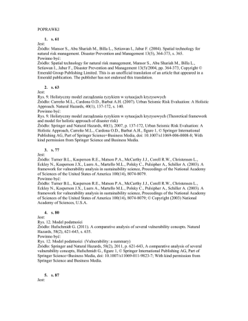 POPRAWKI 1. s. 61 Jest: Źródło: Mansor S., Abu Shariah M., Billa L., Setiawan I., Jabar F. (2004). Spatial technology for natural risk management. Disaster Prevention and Management 13(5), 364-373, s. 365. Powinno być: Źródło: Spatial technology for natural risk management, Mansor S., Abu Shariah M., Billa L., Setiawan I., Jabar F., Disaster Prevention and Management 13(5)/2004, pp. 364-373, Copyright © Emerald Group Publishing Limited. This is an unofficial translation of an article that appeared in a Emerald publication. The publisher has not endorsed this translation. 2. s. 63 Jest: Rys. 9. Holistyczny model zarządzania ryzykiem w sytuacjach kryzysowych Źródło: Carreño M.L., Cardona O.D., Barbat A.H. (2007). Urban Seismic Risk Evaluation: A Holistic Approach. Natural Hazards, 40(1), 137-172, s. 140. Powinno być: Rys. 9. Holistyczny model zarządzania ryzykiem w sytuacjach kryzysowych (Theoretical framework and model for holistic approach of disaster risk) Źródło: Springer and Natural Hazards, 40(1), 2007, p. 137-172, Urban Seismic Risk Evaluation: A Holistic Approach, Carreño M.L., Cardona O.D., Barbat A.H., figure 1, © Springer International Publishing AG, Part of Springer Science+Business Media, doi: 10.1007/s11069-006-0008-8; With kind permission from Springer Science and Business Media. 3. s. 77 Jest: Źródło: Turner B.L., Kasperson R.E., Matson P.A., McCarthy J.J., Corell R.W., Christensen L., Eckley N., Kasperson J.X., Luers A., Martello M.L., Polsky C., Pulsipher A., Schiller A. (2003). A framework for vulnerability analysis in sustainability science, Proceedings of the National Academy of Sciences of the United States of America 100(14), 8074-8079. Powinno być: Źródło: Turner B.L., Kasperson R.E., Matson P.A., McCarthy J.J., Corell R.W., Christensen L., Eckley N., Kasperson J.X., Luers A., Martello M.L., Polsky C., Pulsipher A., Schiller A. (2003). A framework for vulnerability analysis in sustainability science, Proceedings of the National Academy of Sciences of the United States of America 100(14), 8074-8079; © Copyright (2003) National Academy of Sciences, U.S.A. 4. s. 80 Jest: Rys. 12. Model podatności Źródło: Hufschmidt G. (2011). A comparative analysis of several vulnerability concepts. Natural Hazards, 58(2), 621-643, s. 635. Powinno być: Rys. 12. Model podatności (Vulnerability: a summary) Źródło: Springer and Natural Hazards, 58(2), 2011, p. 621-643, A comparative analysis of several vulnerability concepts, Hufschmidt G., figure 1, © Springer International Publishing AG, Part of Springer Science+Business Media, doi: 10.1007/s11069-011-9823-7; With kind permission from Springer Science and Business Media. 5. s. 87 Jest: Źródło: Ahsan Md. N., Warner J. (2014). The socioeconomic vulnerability index: A pragmatic approach for assessing climate change led risks–A case study in the south-western coastal Bangladesh. International Journal of Disaster Risk Reduction 8, 32-49, s. 37-38. Powinno być: Źródło: Reprinted from International Journal of Disaster Risk Reduction, 8/2014, Ahsan Md. N., Warner J., The socioeconomic vulnerability index: A pragmatic approach for assessing climate change led risks–A case study in the south-western coastal Bangladesh, pp. 32-49, doi:10.1016/j.ijdrr.2013.12.009, Copyright © 2015 Elsevier B.V., with permission from Elsevier. Polish translation by Michał Nowakowski. 6. s. 88 Przypis 150 Jest: Ahsan Md. N., Warner J. (2014). The socioeconomic vulnerability index: A pragmatic approach for assessing climate change led risks–A case study in the south-western coastal Bangladesh. International Journal of Disaster Risk Reduction 8, 32-49, s. 38. Powinno być: Reprinted from International Journal of Disaster Risk Reduction, 8, Ahsan Md. N., Warner J., The socioeconomic vulnerability index: A pragmatic approach for assessing climate change led risks–A case study in the south-western coastal Bangladesh, pp. 32-49, doi:10.1016/j.ijdrr.2013.12.009, Copyright © 2015 Elsevier B.V., with permission from Elsevier. Polish translation by Michał Nowakowski. 7. s. 100 Jest: Źródło: Lu P., Stead D. (2013) Understanding the notion of resilience in spatial planning: A case study of Rotterdam, The Netherlands. Cities 35, 200-212, s. 202. Powinno być: Źródło: Reprinted from Cities, 35, Lu P., Stead D., Understanding the notion of resilience in spatial planning: A case study of Rotterdam, The Netherlands, pp. 200-212, doi:10.1016/j.cities.2013.06.001, Copyright © 2015 Elsevier B.V., with permission from Elsevier. Polish translation by Michał Nowakowski. 8. s. 105 Jest: Źródło: Ayyub B.M. (2014). Systems Resilience for Multihazard Environments: Definition, Metrics, and Valuation for Decision Making. Risk Analysis 34, 340-355, s. 347. Powinno być: Źródło: Systems Resilience for Multihazard Environments: Definition, Metrics, and Valuation for Decision Making, Ayyub B.M., Risk Analysis 34/2014, doi: 10.1111/risa.12093, Copyright © 19992014 John Wiley & Sons, Inc, with permission from John Wiley & Sons. This is an unofficial translation of an article that appeared in a Wiley publication. The publisher has not endorsed this translation. 9. s. 109 Jest: Źródło: Joerin, J., Shaw, R., Takeuchi, Y. and Krishnamurthy, R. (2014), The adoption of a Climate Disaster Resilience Index in Chennai, India. Disasters, 38: 540–561, s. 547-548. Powinno być: Źródło: The adoption of a Climate Disaster Resilience Index in Chennai, India, Joerin, J., Shaw, R., Takeuchi, Y. and Krishnamurthy, R., Disasters 38(3)/2014, doi: 10.1111/disa.12058, Copyright © 1999-2014 John Wiley & Sons, Inc., with permission from John Wiley & Sons. This is an unofficial translation of an article that appeared in a Wiley publication. The publisher has not endorsed this translation. 10. s. 116 Jest: Rys. 16. Systematyzacja pojęć „adaptacja” i „radzenie sobie” w odniesieniu do kategorii „wpływ” i „zmiana” Źródło: Birkma