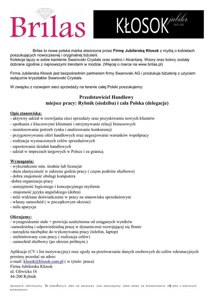 Brilas to nowa polska marka stworzona przez Firmę Jubilerską Kłosok z myślą o kobietach poszukujących nowoczesnej i oryginalnej biżuterii. Kolekcja łączy w sobie kamienie Swarovski Crystals oraz srebro i Alcantarę. Wzory oraz kolory zostały dobrane zgodnie z najnowszymi trendami w modzie. (Więcej o marce na www.brilas.pl) Firma Jubilerska Kłosok jest bezpośrednim partnerem firmy Swarovski AG i produkuje biżuterię z użyciem wyłącznie kryształów Swarovski Crystals. W związku z rozwojem sieci sprzedaży na terenie całej Polski poszukujemy: Przedstawiciel Handlowy miejsce pracy: Rybnik (siedziba) i cała Polska (delegacje) Opis stanowiska: - aktywny udział w rozwijaniu sieci sprzedaży oraz pozyskiwaniu nowych klientów - spotkania z kluczowymi klientami i utrzymywanie relacji biznesowych - monitorowanie potrzeb rynku i analizowanie konkurencji - przygotowywanie ofert handlowych oraz negocjowanie warunków współpracy - realizacja wyznaczonych celów sprzedażowych - raportowanie działań handlowych - udział w imprezach targowych w Polsce i za granicą Wymagania: - wykształcenie min. średnie lub licencjat - duża elastyczność w zakresie godzin pracy ( częste podróże służbowe) - dobra znajomość obsługi komputera -dobra organizacja pracy - umiejętność logicznego i koncepcyjnego myślenia − znajomość języka angielskiego (dobra) - mile widziane doświadczenie w pracy na stanowisku sprzedażowym - własny samochód ( w początkowym okresie) - miła aparycja Oferujemy: - wynagrodzenie stałe + prowizja uzależniona od osiąganych wyników -samodzielną i odpowiedzialną pracę w dynamicznie rozwijającej się firmie - narzędzia niezbędne do wykonywania pracy (telefon, laptop) − nielimitowany czas pracy ( realizacja celów) − samochód służbowy (po okresie próbnym.) Aplikacje (CV i list motywacyjny) oraz zgody na przetwarzanie danych osobowych do celów rekrutacyjnych prosimy przesłać na adres: e-mail: [email protected] ( w tytule: praca) Firma Jubilerska Kłosok ul. Gliwicka 16 44-200 Rybnik U pr z e j m i e inf o r m u j e m y , ż e na d e s ł a n y c h of e r t ni e z w r a c a m y or a z za s t r z e g a m y so bi e pr a w o do ko n t a k t o w a n i a si ę tylk o z w y b r a n y m i ka n d y d a t a m i .