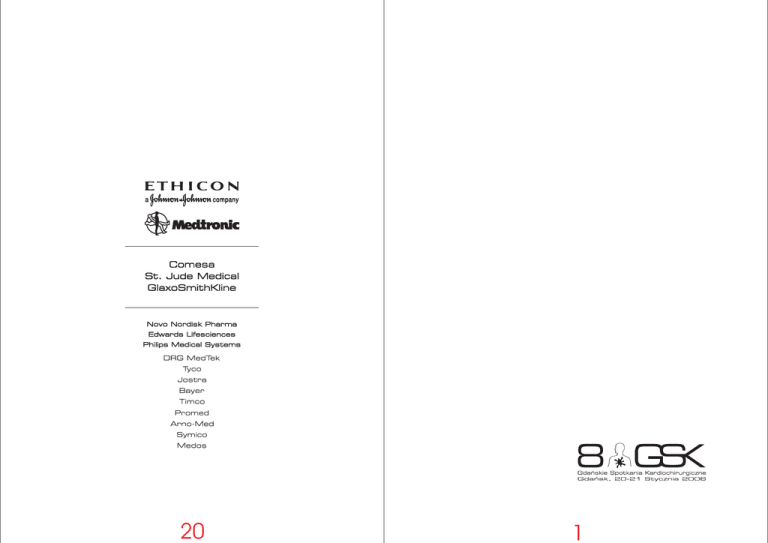 20 1 Pi¹tek, 20 stycznia 2006 Notatki: 13:00 Oficjalne otwarcie konferencji Sala Koncertowa 13:00-15:00 Sesja 1 - Aktualne trendy w kardiochirurgii 15:30-17:50 Sesja 2 A- Chirurgia aorty i zastawki aortalnej 18:00-19:20 Sesja 3 A- Chirurgia zastawki mitralnej Sala Senacka 15:30-17:20 Sesja 2 B Sesja anestezjologiczna 18:00-19:20 Sesja 3 B Kardiochirurgia dzieciêca, chirurgiczne leczenie niewydolnoœci serca 21:00 Kolacja - Dwór Bractwa Œw. Jerzego, Z³ota Brama (za zaproszeniami) Sobota, 21 stycznia 2006 Teletransmisja z sal operacyjnych Implantacja bezszwowej zastawki aortalnej 'Enable 3F'. Prof. Jerzy Sadowski, Klinika Chirurgii Serca, Naczyñ i Transplantologii im. Jana Paw³a II, Kraków OPCABG z u¿yciem U-clipów. Dr Rafa³ Pawlaczyk, Klinika Kardiochirurgii, AM Gdañsk Sala Koncertowa 8:30-9:00 Sesja 4 A Powik³ania w kardiochirurgii 11:00-13:00 Sesja 5 A Przypadki roku Sala Senacka 8:30-10:40 Sesja 4 B Sesja perfuzjonistów 11:00-12:50 Sesja 5 B Chirurgiczne leczenie choroby wieñcowej 2 19 Notatki: Wyk³ady / Lectures CABG is still the best theraphy for multivessel and left main stem disease. David P. Taggart, Oxford, UK Effects of off-pump surgery on myocardial and cerebral function. David P. Taggart, Oxford, UK Trends in the treatment of coronary artery disease in Turku. Kari Kuttila, Turku, Finland CABG surgery with MicroECC. Dietrich E. Birnbaum, Regensburg, Germany The shift in cardiac surgery patients population of the last two decades. Leon Eijsman, Amsterdam, The Netherlands Outcome after implantation of Medtronic FreeStyle xenograft in aortic position. Andrzej Sosnowski, Leicester, UK Nowe mo¿liwoœci chirurgicznego leczenia wad lewego ujœcia têtniczego. Jerzy Sadowski, Klinika Chirurgii Serca, Naczyñ i Transplantologii im. Jana Paw³a II Kraków Technique and results of aortic arch repair. Kari Kuttila, Turku, Finland Perfusion strategies for type A aortic dissections. Peter van der Barselaar, The Netherlands Czynniki krwawieñ po operacjach kardiochirurgicznych. Ewa Mayzner-Zawadzka, Katedra i Zak³ad Anastezjologii i Intensywnej Terapii, Akademia Medyczna Warszawa Minimal extracorporeal perfusion circuits, set-up and results. Peter van der Barselaar, St. Antonius Hospital, The Netherlands 18 Comparison of the Troponin I levels during coronary artery bypass graft in cardiac procedures, realised with and without extracorporeal circulation. Jaros³aw Fija³kowski, Klinika Serca i Naczyñ L`Hopital Ste. Joseph, Belgium 3 Pi¹tek, 20 stycznia Sesja 1 - Sala Koncertowa Aktualne trendy w kardiochirurgii Sesji przewodnicz¹: David P. Taggart, Bohdan Maruszewski, Kari Kuttila 13:00 CABG is still the best theraphy for multivessel and left main stem disease. David P. Taggart, Oxford, UK 13:20 Effects of off-pump surgery on myocardial and cerebral function. David P. Taggart, Oxford, UK 13:40 Trends in the treatment of coronary artery disease in Turku. Kari Kuttila, Turku, Finland 14:00 CABG surgery with MicroECC. Dietrich E. Birnbaum, Regensburg, Germany 14:20 The shift in cardiac surgery patients population of the last two decades. Leon Eijsman, Amsterdam, The Netherlands 12:00 Przydatnoœæ badañ przep³ywu w pomostach aortalnowieñcowych u chorych z chorob¹ niedokrwienn¹ serca i wp³yw na strategiê postêpowania. Marcin Maruszewski, Klinika Kardiochirurgii, Œl¹skie Centrum Chorób Serca, Zabrze 12:10 Comparative analysis of early postoperative results in patients after CABG. Vadim Shumovetz, Miñsk, Bielorus 12:20 Age but not lipid profile affects endothelial function of internal thoracic artery. Marcin Malinowski, II Klinika Kardiochirurgii, AM Katowice 12:30 Variability of perioperative risk profile - analysis of EUROscore model in own material. Rados³aw Wilimski, Centralny Szpital Kliniczny Warszawa 12:40 Long term angiotensin converting enzyme-inhibition and postoperative risk of atrial fibrillation following coronary artery bypass grafting. Krzysztof Szyndler, Klinika Kardiochirurgii, AM Gdañsk 14:40 Nanobakterie - rewolucja w patogenezie chorób uk³adu sercowo - naczyniowego. Ryszard Kalawski, Oddzia³ Kardiochirurgii, Stare Miasto, Poznañ Coffee break 4 17 Sobota, 21 stycznia Pi¹tek, 20 stycznia Sesja 5 B - Sala Senacka Chirurgiczne leczenie choroby wieñcowej Sesji przewodnicz¹: Kazimierz Suwalski, Ryszard Kalawski Sesja 2 A - Sala Koncertowa Chirurgia aorty i zastawki aortalnej Sesji przewodnicz¹: Jerzy Sadowski, Leon Eijsman, Jan Rogowski 11:00 Operacje choroby niedokrwiennej serca ze wskazañ nag³ych czynniki wp³ywaj¹ce na wyniki wczesne. Bogdan Kowalik, Klinika Kardiochirurgii, PAM Szczecin 15:30 Outcome after implantation of Medtronic FreeStyle xenograft in aortic position. Andrzej Sosnowski, Leicester, UK 11:10 Rutynowe zastosowanie techniki OPCAB w têtniczej rewaskularyzacji miêœnia sercowego. Jacek Kaperczak, Oddzia³ Kardiochirurgii, Wojewódzkie Centrum Medyczne, Opole 15:50 Nowe mo¿liwoœci chirurgicznego leczenia wad lewego ujœcia têtniczego. Jerzy Sadowski, Klinika Chirurgii Serca, Naczyñ Transplantologii im. Jana Paw³a II Kraków 11:20 Total arterial revascularization in patient over 70 years old. Pawe³ Rudziñski, Klinika Chirurgii Serca, Naczyñ i Transplantologii im. Jana Paw³a II, Kraków 16:10 Technique and results of aortic arch repair. Kari Kuttila, Turku, Finland 11:30 Zastosowanie têtnicy promieniowej w chirurgicznym leczeniu choroby wieñcowej. Piotr ¯elazny, Oddzia³ Kardiochirurgii, Wojewódzki Szpital Specjalistyczny, Olsztyn 11:40 Wykorzystanie têtnicy promieniowej do pomostowania naczyñ wieñcowych w materiale Œl¹skiego Centrum Chorób Serca w Zabrzu. Jan Borzymowski, Klinika Kardiochirurgii, Œl¹skie Centrum Chorób Serca, Zabrze 11:50 Chirurgiczna plastyka ujœcia pnia lewej têtnicy wieñcowej. Robert Trzciñski, Klinika Kardiochirurgii, AM Bia³ystok 16 16:30 Perfusion strategies for type A aortic dissections. Peter van der Barselaar, St. Antonius Hospital, The Netherlands 16:50 Expanding the in