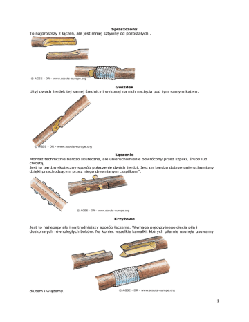 Spłaszczony To najprostszy z łączeń, ale jest mniej sztywny od pozostałych . Gwizdek Użyj dwóch żerdek tej samej średnicy i wykonaj na nich nacięcia pod tym samym kątem. Łączenie Montaż technicznie bardzo skuteczne, ale unieruchomienie odwrócony przez szpilki, śruby lub chłostą. Jest to bardzo skuteczny sposób połączenie dwóch żerdzi. Jest on bardzo dobrze unieruchomiony dzięki przechodzącym przez niego drewnianym „szpilkom”. Krzyżowe Jest to najlepszy ale i najtrudniejszy sposób łączenia. Wymaga precyzyjnego cięcia piłą i doskonałych równoległych boków. Na koniec wszelkie kawałki, których piła nie usunęła usuwamy dłutem i wiążemy. 1 Biczowanie Jest to bardzo dobrze znany rodzaj zaciosów. Z pomocą liny ciasno wiążemy płaskie styki żerde. Narożnik Po wywierceniu w jednej z żerdek dziury i przeprowadzenie przez nią czopa wbijamy w niego kawałek drewna za pomocą drewnianego młotka. To jest rodzaj zaciosu nieruchomionego. Śruba najlepiej unieruchomić. Przez dwie żerdzie w gniazdach (dziurach) przewiercamy śrubę aby je jak Kostki Przewiercamy żerdkę na wylot. Wkładamy czop głównej żerdki. Następnie przewiercamy żerdź drugi raz mniejszym wiertłem. Wkładamy w otwór drewnianą „igłę” Jest to typ zaciosów często używany na przykład do szczebli drabiny. 2 Korzystanie z wiertarki ręcznej; świdra Należy pamiętać, że wiercenie otworów dla kołków lub śrub, które są na ogół o małej średnicy: 10, 12 lub 14 mm, odbywa się z dużo większą łatwością i szybkością za pomocą wiertarki ręcznej; wiertła. Łączenie Zacios ten jest trudny, jeśli chcemy uzyskać jego dobrą jakość. Nie obsługuje on dużych obciążeń. Ważne jest zachowanie odpowiednich proporcji w budowlach z tego typu łączeniem. ) Trzeci drewna Jest to często stosowany zacios. Wykonać nacięcia jak na rysunkach A i B, połączyć żerdzie, a na końcu złączyć śrubą lub czopem. 3 Jak wyciąć zacios za pomocą dłuta i młotka Gniazdo Jest to cylindryczny otwór utworzony za pomocą świdra. Średnica otworu nie powinna przekraczać 1/3 średnicy pnia. 4 Czop Otwór musi być cylindryczny. Najlepszą metodą na otrzymanie czopa jest wycięcie go kwadratowego jak na rysunku niżej a następnie spiłowanie do formy okrągłej. Środki montażowe Jest to łączenie prostopadłe w stosunku do żerdki. Rozpora Są to wnęki wspornika na wysokości. Cięcia powinny wynosić około 90 ° w stosunku do dwusiecznej kąta utworzonego przez dwie części. Źródło: http://www.scoutorama.org/Le-moisage.html http://www.scoutorama.org/Mis-bois-et-tiers-bois.html http://www.scoutorama.org/Immobilisation-des-assemblages.html http://www.scoutorama.org/Tenons-et-mortaises-cylindriques.html 5