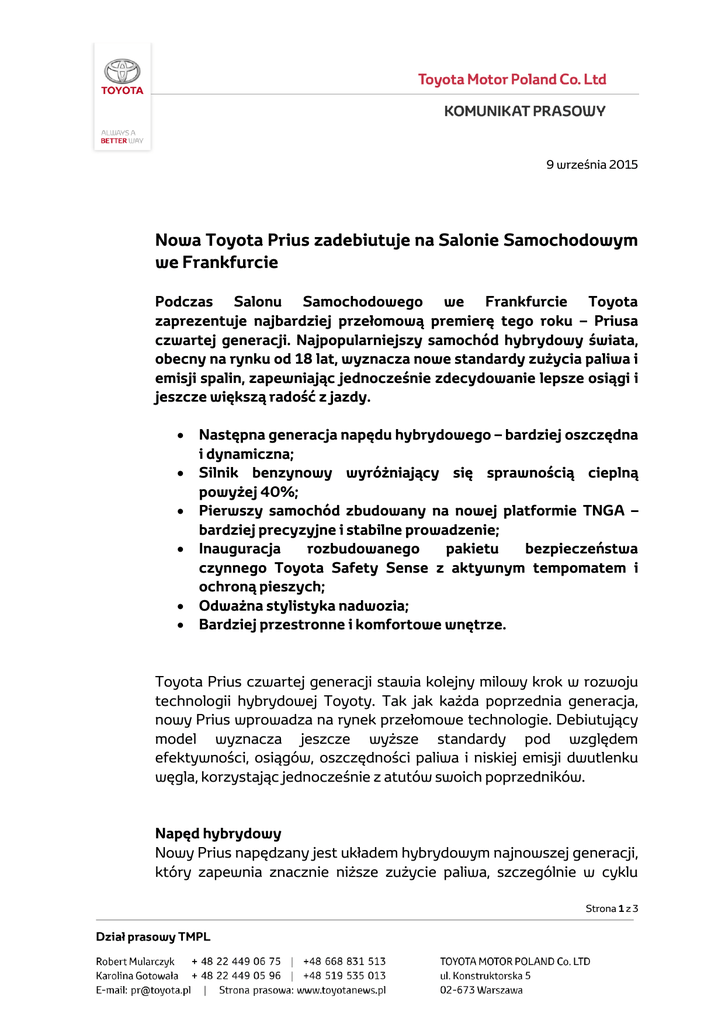 9 września 2015 Nowa Toyota Prius zadebiutuje na Salonie Samochodowym we Frankfurcie Podczas Salonu Samochodowego we Frankfurcie Toyota zaprezentuje najbardziej przełomową premierę tego roku – Priusa czwartej generacji. Najpopularniejszy samochód hybrydowy świata, obecny na rynku od 18 lat, wyznacza nowe standardy zużycia paliwa i emisji spalin, zapewniając jednocześnie zdecydowanie lepsze osiągi i jeszcze większą radość z jazdy. Następna generacja napędu hybrydowego – bardziej oszczędna i dynamiczna; Silnik benzynowy wyróżniający się sprawnością cieplną powyżej 40%; Pierwszy samochód zbudowany na nowej platformie TNGA – bardziej precyzyjne i stabilne prowadzenie; Inauguracja rozbudowanego pakietu bezpieczeństwa czynnego Toyota Safety Sense z aktywnym tempomatem i ochroną pieszych; Odważna stylistyka nadwozia; Bardziej przestronne i komfortowe wnętrze. Toyota Prius czwartej generacji stawia kolejny milowy krok w rozwoju technologii hybrydowej Toyoty. Tak jak każda poprzednia generacja, nowy Prius wprowadza na rynek przełomowe technologie. Debiutujący model wyznacza jeszcze wyższe standardy pod względem efektywności, osiągów, oszczędności paliwa i niskiej emisji dwutlenku węgla, korzystając jednocześnie z atutów swoich poprzedników. Napęd hybrydowy Nowy Prius napędzany jest układem hybrydowym najnowszej generacji, który zapewnia znacznie niższe zużycie paliwa, szczególnie w cyklu Strona 1 z 3 pozamiejskim, oraz ogromną radość z jazdy. Napęd pracuje ciszej i płynniej niż dotychczas. Całkowicie zmodernizowany pełny napęd hybrydowy jest teraz lżejszy, wydajniejszy i bardziej dynamiczny. Przebudowany silnik spalinowy wykazuje się sprawność cieplną powyżej 40% – jest to najlepszy wynik na świecie dla silnika benzynowego. Pozostałe elementy układu hybrydowego są bardziej kompaktowe i zostały tak umiejscowione, by obniżyć środek ciężkości i zajmować jak najmniej miejsca. Nowy zestaw baterii niklowo-wodorkowych o zwiększonej gęstości energetycznej jest teraz mniejszy, bardziej wydajny i trwały. Nowa platforma TNGA Toyota Prius jest wizytówką marki, najbardziej reprezentatywnym przedstawicielem rodziny hybryd, służącym Toyocie do demonstrowania najnowocześniejszych technologii w dziedzinie napędu, bezpieczeństwa i komfortu. Kompleksowa technologia TNGA (Toyota New Generation Architecture) obejmująca nowe platformy, napędy oraz innowacyjne rozwiązania w dziedzinie organizacji produkcji, przenosi wszystkie te parametry na wyższy poziom. Platforma TNGA przyczyniła się do poprawy dynamiki i ekonomiczności Priusa. Samochód ma niżej położony środek ciężkości, co zapewnia bardziej precyzyjne i stabilne prowadzenie. Nowa platforma stworzyła projektantom większe możliwości ekspresji, dzięki czemu powstał samochód o nowoczesnym, atrakcyjnym wyglądzie i bardziej muskularnej sylwetce. Auto ma bardziej przestronne, komfortowe wnętrze oraz większy bagażnik. Wnętrze zyskało też bardziej wyważony, spokojny charakter. Bezpieczeństwo Nowy Prius otrzymał rozszerzony pakiet Toyota Safety Sense, oparty na współpracy kamery i radaru. Rozbudowana wersja zawiera aktywny tempomat (Adaptive Cruise Control), który dostosowuje prędkość samochodu do prędkości poprzedzającego pojazdu, oraz układ wczesnego reagowania w razie ryzyka zderzenia (Pre-Collision System) rozszerzony o funkcję zapobiegania zderzeniom z pieszymi. Strona 2 z 3 Prius czwartej generacji stanie się nowym punktem odniesienia dla całego rynku samochodów z alternatywnymi napędami. Osiągnięcia technologiczne zespołu projektantów Priusa w dziedzinie wydajności i osiągów napędu hybrydowego, stabilności prowadzenia i radości z jazdy będą wprowadzane stopniowo do następnych hybrydowych modeli Toyoty. Strona 3 z 3