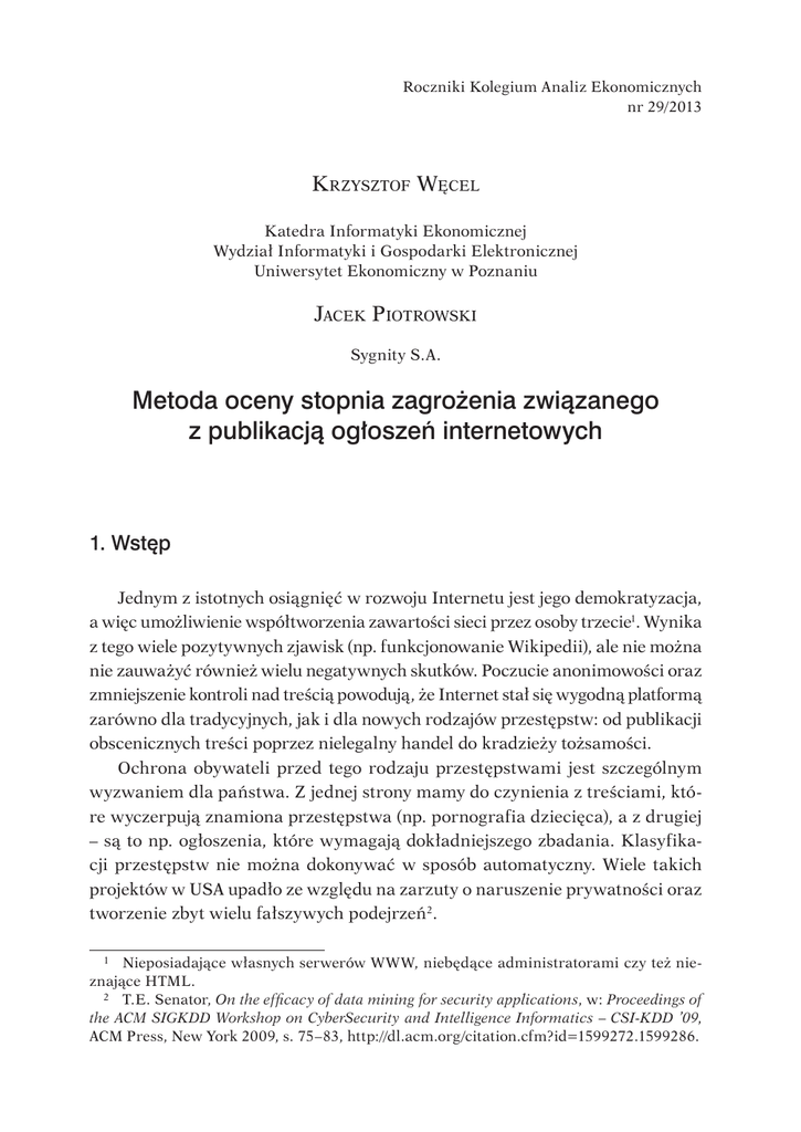 Roczniki Kolegium Analiz Ekonomicznych nr 29/2013 K rzysztof Węcel Katedra Informatyki Ekonomicznej Wydział Informatyki i Gospodarki Elektronicznej Uniwersytet Ekonomiczny w Poznaniu Jacek Piotrowski Sygnity S. A. Metoda oceny stopnia zagrożenia związanego z publikacją ogłoszeń internetowych 1. Wstęp Jednym z istotnych osiągnięć w rozwoju Internetu jest jego demokratyzacja, a więc umożliwienie współtworzenia zawartości sieci przez osoby trzecie1. Wynika z tego wiele pozytywnych zjawisk (np. funkcjonowanie Wikipedii), ale nie można nie zauważyć również wielu negatywnych skutków. Poczucie anonimowości oraz zmniejszenie kontroli nad treścią powodują, że Internet stał się wygodną platformą zarówno dla tradycyjnych, jak i dla nowych rodzajów przestępstw: od publikacji obscenicznych treści poprzez nielegalny handel do kradzieży tożsamości. Ochrona obywateli przed tego rodzaju przestępstwami jest szczególnym wyzwaniem dla państwa. Z jednej strony mamy do czynienia z treściami, które wyczerpują znamiona przestępstwa (np. pornografia dziecięca), a z drugiej – są to np. ogłoszenia, które wymagają dokładniejszego zbadania. Klasyfikacji przestępstw nie można dokonywać w sposób automatyczny. Wiele takich projektów w USA upadło ze względu na zarzuty o naruszenie prywatności oraz tworzenie zbyt wielu fałszywych podejrzeń 2. Nieposiadające własnych serwerów WWW, niebędące administratorami czy też nieznające HTML. 2 T. E . Senator, On the efficacy of data mining for security applications, w: Proceedings of the ACM SIGKDD Workshop on CyberSecurity and Intelligence Informatics – CSI-KDD ’09, ACM Press, New York 2009, s. 75–83, http://dl.acm.org/citation.cfm?id=1599272.1599286. 1 326 Krzysztof Węcel, Jacek Piotrowski O tym, czy dany czyn jest przestępstwem, rozstrzyga sąd, co jest poprzedzone zebraniem odpowiednich dowodów. W każdym przypadku potrzebni są ludzie z odpowiednimi uprawnieniami oraz kompetencjami. Mogą jednak i powinni być wspierani przez odpowiednie narzędzia informatyczne pozwalające na monitoring cyberprzestrzeni oraz wychwytywanie relewantnych sygnałów. Każda sytuacja, która może prowadzić do przestępstwa, określana jest jako zagrożenie. Profil zagrożenia to informacje o zagrożeniu zebrane z danego źródła internetowego i ustrukturyzowane w postaci atrybutów oraz przypisanych im wartości, zgodnie z określoną klasą zagrożenia. Celem niniejszego artykułu jest propozycja oceny stopnia zagrożenia pozwalająca na szeregowanie zagrożeń na potrzeby działań operacyjnych właściwych organów państwa. 2. Tło projektu oraz motywacja Proponowana metoda znajduje zastosowanie w projekcie Semantyczny Monitoring Cyberprzestrzeni (SMC). Celem projektu jest opracowanie metody oraz prototypu narzędzia pozwalającego na przezwyciężenie problemu integracji danych i informacji pochodzących ze zróżnicowanych, ale uprzednio wskazanych źródeł na potrzeby ochrony cyberprzestrzeni poprzez wykrywanie zagrożeń, które manifestowane są w rozpatrywanych źródłach. Na początku projektu została przeprowadzona szczegółowa analiza możliwych scenariuszy oraz potencjalnych zagrożeń. W jej wyniku określono, że najbardziej obiecującym obszarem zastosowań modelu SMC jest monitorowanie zagrożenia, jakim jest niezgodna z prawem sprzedaż leków inicjowana w Internecie. Zatem przedmiotem zainteresowania są pojedyncze ogłoszenia na forach internetowych, a proponowana metoda ma oceniać, na ile dane ogłoszenie stanowi zagrożenie dla porządku społecznego. Przypisana ocena pozwala na szeregowanie zagrożeń. Dla zrozumienia rozważań związanych z metodą oceny zagrożeń konieczne jest przedstawienie samego profilu zagrożenia. Dla przyjętego scenariusza biznesowego został zdefiniowany schemat bazy danych, którego fragment dotyczący profilu zagrożenia został przedstawiony na rysunku 1. Źródło: J. Małyszko, A. Filipowska, W. Abramowicz, T. Kaczmarek, E. Bukowska, B. Perkowski, P. Stolarski et al., Architektura systemu wykrywania zagrożeń w cyberprzestrzeni, „Roczniki” Kolegium Analiz Ekonomicznych SGH, z. 24, Oficyna Wydawnicza SGH, Warszawa 2012, s. 11–22. Rysunek 1. Schemat profilu zagrożenia dla scenariusza nielegalnego obrotu lekami Metoda oceny stopnia zagrożenia związanego z publikacją ogłoszeń internetowych 327 328 Krzysztof Węcel, Jacek Piotrowski Schemat przewiduje dość znaczną liczbę atrybutów. W rzeczywistych ogłoszeniach podane są wartości zaledwie kilku z nich. Rysunek 2 przedstawia przykładowe profile zagrożenia. Rysunek 2. Przykładowe profile zagrożenia Źródło: opracowanie własne. 3. Problem badawczy i prace powiązane Zagadnienie klasyfikacji ogłoszenia jako zagrożenia jest szczególnym przypadkiem zagadnienia kategoryzacji tekstu. Istotnym wyzwaniem jest to, że nie ma gotowych rozwiązań dziedzinowych, a metody ogólne byłyby niewystarczające. Według naszej wiedzy nikt wcześniej nie podejmował prac w dziedzinie będącej przedmiotem zainteresowania projektu SMC. Większość metod kategoryzacji tekstu opiera się na modelu wektorowym (vector-space model) znanym z wyszukiwania informacji3. Celem jest wychwycenie struktury takiej, jak kolejność i bliskość słów, fraz, ich lokalizacja w dokumencie. We wszystkich podejściach można spotkać się z problemem redukcji przestrzeni. Na przykład Karras4 proponuje metodykę ekstrakcji cech, która przede wszystkim wykorzystuje kategorie semantyczne zamiast surowych wystąpień słów. Ogura i współpracownicy5 proponują nową miarę do selekcji cech, które przybliżają ważność danego termu, opierając się na tym, jak bardzo rozkład 3 A. Markov, Fast categorization of Web documents represented by graphs, „Advances in Web Mining and Web Usage Analysis” 2007, vol. 4811, s. 56–71, http://www.springerlink. com/index/u4886005 r4760437.pdf. 4 D. Karras, An improved text c