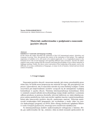 Lingwistyka Stosowana nr 5: 2012 109 Teresa TOMASZKIEWICZ Uniwersytet im. Adama Mickiewicza w Poznaniu Materiały audiowizualne z podpisami a nauczanie języków obcych Abstract: Subtitled A-V materials and language teaching In this article the author describes the realization of the LLP international project: Subtitling and Language Learning. First, she presents the context of the realization of this project. The supposed importance of subtitles in LL still needs to be studied empirically. It is a longitudinal project at the European level with several languages and regarding different types of learners. Second, the author suggests some results coming from the research concerning the possibility of use of these materials in language teaching. Finally, she shows some weak points of the conducting of the project, such as the difficulty of so many combinations of languages, so many levels of learners, formal and non-formal context of teaching. 1. Uwagi wstępne Nauczanie języków obcych i stosowane metody, jak wiemy, przechodziły przez różne fazy, bo każda nowa propozycja ma zmierzać do tego, aby przyśpieszyć ten proces i spowodować, aby to nauczanie stawało się coraz bardziej wydajne. Celem oczywiście jest doprowadzenie uczniów/ uczących się do umiejętności wydajnej komunikacji w języku obcym. Niemniej internacjonalizacja komunikacji, która w ostatnich czasach nabrała niewyobrażalnego tempa dzięki satelitom i systemom odbioru przekazu za pomocą chociażby telewizji kablowej czy indywidualnej poprzez anteny paraboliczne, każe nam myśleć zupełnie inaczej o samej komunikacji, której jako nauczyciele języków obcych, zamierzamy nauczać. Telewizja numeryczna zwiększająca ilość programów, już wychodzące z mody video czy jeszcze funkcjonujące programy na DVD, które oferują możliwość oglądania filmów w wielu wersjach językowych, stwarzają nowe możliwości dydaktyczne. Ta internacjonalizacja mediów audiowizualnych wzbogacona o Internet, iPody, gry audiowizualne itd. itp., zmienia z dnia na dzień stosunek społeczeństw do 110 TERESA TOMASZKIEWICZ języków obcych, do komunikacji globalnej, do tego, co powinno stanowić minimum komunikacji międzynarodowej. Oczywiście pewna ideologia międzynarodowa stara się wmówić wszystkim, że język angielski jest jedynym uczestniczącym w tej globalnej ewolucji i że jego rozwój będzie determinował rozwój technologii informacyjnych i komunikacyjnych. Niemniej realia co najmniej europejskie, a może nawet światowe, wyraźnie pokazują, że w wielu kontaktach „twarzą w twarz”, czy też w kontaktach pozauniwersyteckich, gospodarczych znajomość tylko i wyłącznie języka angielskiego nie doprowadza do porozumień, co najmniej ekonomicznych, w kontakcie między różnymi podmiotami władającymi różnym i językami. W związku z tym różne organizacje krajowe i międzynarodowe starają się realizować pewną politykę językową, która po pierwsze promowałaby wielojęzyczność, ale po drugie pokazywałaby, w jaki sposób ją realizować nie tylko w klasach szkolnych, a również w różnych kontekstach społecznych, w których obywatele społeczeństw mogliby korzystać z mediów, aby nauczyć się, czy poszerzyć swoje umiejętności w różnych językach obcych, nie tylko w języku angielskim, w sposób bardziej lub mniej formalny, w instytucjach kształcących, ale też poza nimi. Jakieś parę lat temu w kręgach europejskich pojawiło się hasło: „Można uczyć się języków obcych, oglądając telewizję lub inne media”. Oczywiście powstał pewien problem, bo w Europie istnieją kraje tzw. preferujące dubbing i inne, które częściej stosują napisy lub głos lektorski. Już na wstępie musimy stwierdzić, że jeżeli dane społeczeństwo jest przyzwyczajone do dubbingu, to niezbyt chętnie sięga po programy w wersji z podpisami, a tylko takie materiały mogą być w jakiś sposób pomocne w nauczaniu/ uczeniu się języków obcych. Różne badania w kontekście Eurobarometru1 w formie ankiet przeprowadzanych w latach 2000, 2005, 2006 wskazywały na możliwości obywateli Europy porozumiewania się w różnych językach obcych. Z tych badań wynikało, że metody uczenia się języków obcych oparte na oglądaniu telewizji czy słuchaniu radia stanowiły tylko 9% wszystkich innych metod. Mimo tych rezultatów pewne instytucje czy organizacje zaczęły zwracać uwagę na to, że materiały audiowizualne z podpisami mogą odgrywać ważną rolę w doskonaleniu sprawności językowych. Zacytujmy tylko kilka przykładów: – Komisja Europejska wydała dwa dokumenty: „Promoting language learning and linguistic diversity: 2004–2006” i „ A new framework strategy for Multilingualism” (2005–2007); – Parlament Europejski w 2007 roku podtrzymywał tę ideę; – jak również np. Ministerstwo Edukacji Narodowej w Polsce w 2008 roku czy Fińska Organizacja Nauczycieli Języków Obcych w 2007 roku itd. Eurobarometr to cykliczne badania opinii publicznej realizowane na zlecenie Komisji Europejskiej we wszystkich państwach Unii Europejskiej oraz krajach kandydujących. 1 METERIAŁY AUDIOWIZUALNE Z PODPISAMI... 111 To tylko kilka przykładów, ale trzeba stwierdzić, że wszystkie instytucje zajmujące się wielojęzycznością podkreślają użyteczność materiałów audiowizualnych z podpisami w nauce języków obcych. W ostatnich latach liczba projektów badawczych czy punktowych badań w tej dziedzinie znacznie wzrosła. Yves Gambier2 zwraca uwagę na fakt, że pojawiają się one w kontekstach różnych nauk: dydaktyki, dydaktyki językowej, pedagogiki, psychologii, socjologii, przekładoznawstwa, nauk kognitywnych itd. Z tej też przyczyny różne te badania są często trudne do porównania ze względu na cele badawcze, stosowane metody czy otrzymane rezultaty (str. 100). Ogólnie można stwierdzić, że różnice w prowadzonych badaniach czy doświadczeniach plasują 