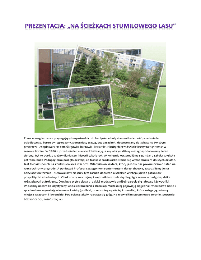 Przez szereg lat teren przylegający bezpośrednio do budynku szkoły stanowił własność przedszkola osiedlowego. Teren był ogrodzony, porośnięty trawą, bez zasadzeń, dostosowany do zabaw na świeżym powietrzu. Znajdowały się tam ślizgawki, huśtawki, karuzele, z których przedszkole korzystało głownie w sezonie letnim. W 1996 r. przedszkole zmieniło lokalizację, a my otrzymaliśmy niezagospodarowany teren zielony. Był to bardzo ważny dla dalszej historii szkoły rok. W kwietniu otrzymaliśmy sztandar a szkoła uzyskała patrona. Rada Pedagogiczna podjęła decyzję, że troska o środowisko stanie się wyznacznikiem dalszych działań. Jest to nasz sposób na kontynuowanie idei prof. Władysława Szafera, który jest dla nas prekursorem działań na rzecz ochrony przyrody. A ponieważ Profesor szczególnym sentymentem darzył drzewa, zasadziliśmy je na odzyskanym terenie. Kierowaliśmy się przy tym zasadą dobierania lokalnie występujących gatunków pospolitych i szlachetnych. Obok sosny zwyczajnej i wejmutki rozrosła się długoigła sosna kanadyjska, dzika róża, pigwa i ostrokrzew. Drugiego piętra sięgają dzisiaj modrzewie a niżej rozrosły się jałowce i żywotniki. Wiosenny akcent kolorystyczny wnosi różanecznik i złotokap. Wcześniej pojawiają się jednak wierzbowe bazie i spod mchów wyrastają wiosenne kwiaty (podbiał, przebiśnieg a później konwalia), które ustępują jesienią miejsca wrzosom i lawendzie. Pod ścianą szkoły rozrasta się głóg. Na niewielkim stosunkowo terenie, pozornie bez koncepcji, rozrósł się las. Propozycja ścieżki została tak zaprojektowana, aby umożliwić osiąganie kompetencji interdyscyplinarnych zgodnych ze standardami edukacyjnymi (czytanie, pisanie, rozumowanie, korzystanie z informacji i wykorzystanie wiedzy w praktyce). Jednocześnie widzimy możliwość realizacji celów przedmiotowych, co zapewni wykorzystanie terenu nie tylko na zajęciach przyrody, ale też języka polskiego, matematyki, a także sztuki czy wychowania fizycznego. Wyznaczono stanowiska dydaktyczne. Ich kształt zaprojektowany został przez nauczycieli różnych przedmiotów (przyrody, kształcenia zintegrowanego, matematyki, języka polskiego, wychowania fizycznego, informatyki). Każde stanowisko wzbogacono o planszę prezentacyjno-zadaniową i karty pracy zawierające propozycje do realizacji z dziećmi. Nazwy stanowisk wkomponowano w kultowe teksty z „Kubusia Puchatka”, co powinno nadawać zajęciom charakter nieskrępowanej zabawy i zachęcić do aktywności. Przy wejściu umieszczono tablicę z nazwą ścieżki (Stumilowy las) i planem stanowisk (każde kolejne stanowisko oznakowano podobną tablicą) i zaproszeniem: „Zaczarowane Miejsce- to niedaleko, nie jest trudno tam trafić. Zaczarowane Miejsce jest bowiem tam, gdzie ty jesteś i jeżeli jesteś przyjacielem Misiów – znajdziesz je”. Teksty pochodzą z ksiązki A.A.Milne „Kubuś Puchatek”. Po dziesięciu latach od pierwszych zasadzeń, szkolny ogród rozrósł się wypełniając szczelnie ogrodzoną przestrzeń. Uznaliśmy, że nie wykorzystujemy w pełni walorów dydaktycznych tego terenu. Postanowiliśmy stworzyć oryginalną ścieżkę przyrodniczą pod nazwą „Stumilowy las” Nazwa ścieżki zaczerpnięta została z lektury szkolnej znanej także wszystkim dorosłym, ponieważ stanowiącej klasykę literatury dziecięcej – A.A.Milne „Kubuś Puchatek”. Mamy nadzieję, że nasza ścieżka pozwala na nieustanne „odkrywanie” otaczającego nas środowiska w sposób atrakcyjny dla dzieci. Nadrzędny cel jakim się kierowaliśmy to poprawa częstotliwości kontaktu dzieci z naturalnym środowiskiem poprzez stworzenie odpowiednich stanowisk, zgromadzenie na niewielkim stosunkowo terenie pomocy dydaktycznych i uatrakcyjnienie zajęć, często przez nadanie im formy zabawy lub przygody. Na bazie istniejącego ogrodu powstał teren do prowadzenia różnorodnych zajęć z przedmiotów objętych programem szkoły podstawowej: przyrody, matematyki, języka polskiego, plastyki ... a także realizację zajęć wychowawczych. „Stumilowy Las” pozwola na realizację celów programowych w zakresie edukacji środowiskowej i ekologicznej, m.in. takich jak: umożliwienie uczniom poznawania środowiska naturalnego za pomocą zmysłów (zobacz, poczuj, dotknij); tworzenie dziecku okazji do spotkań z przyrodą, samodzielnych doświadczeń, bezpośredniego przeżywania; wykorzystanie wiedzy ekologicznej w praktyce; rozwijanie uzdolnień i zamiłowań przyrodniczych uczniów, kształtowanie postaw sprzyjających trosce o środowisko. Przejście ścieżki na różnych etapach umożliwi dzieciom przybliżenie i poznanie drzew, krzewów, skał, owadów oraz wybranych zjawisk zachodzących w przyrodzie. Dzieci mogą poznać np. potrzeby siedliskowe występujących lokalnie gatunków roślin, obserwować zachodzące w cyklu zmiany, postrzegać i określać podobieństwa i różnice w budowie zewnętrznej a przez to łączyć wiedzę teoretyczną z rozumieniem zjawisk przyrodniczych. „OBSERWACJE PUCHATKA – KTO TAK BZYCZY?”. Motto: Wyruszają na poszukiwanie Kogoś, dobrze jest ustalić, czy Zaginiony jest z gatunku tych, co siadają innym na nosie, czy z tych , na których można przez pomyłkę nadepnąć*”. Stanowisko poświęcone jest owadom. Możliwe wykorzystanie stanowiska to: obserwacja owadów szukających schronienia w sztucznych warunkach, podpatrywanie życia owadów, rozpoznawanie ich, poznawanie ich zwyczajów, budowy ciała; znajomość wielopostaciowości pszczół - owadów społecznych; poznanie owadów pożytecznych i szkodliwych. Na stanowisku znajduje się tablica, w której poszczególne przestrzenie wypełnione są różnymi materiałami (słoma, pnie drzew, trzcina, siano, mech…) i ul. Tablica prezentuje wielopostaciowość pszczół, przeobrażenie motyla i biedronki, zakres barw widzianych przez człowieka i pszczołę. „WAŻNE ODK