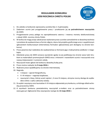 REGULAMIN KONKURSU 1050 ROCZNICA CHRZTU POLSKI 1. Do udziału w konkursie zapraszamy uczniów klas 1–3 gimnazjów. 2. Zadaniem ucznia jest przygotowanie pracy i przekazanie jej za pośrednictwem nauczyciela do GWO. 3. Przygotowanie pracy polega na zaprojektowaniu awersu i rewersu monety okolicznościowej z okazji 1050. rocznicy chrztu Polski. 4. W konkursie mogą wziąć udział prace wykonane przez uczniów samodzielnie w dowolnej technice i przesłane do wydawnictwa w formie zdjęcia, skanu lub projektu graficznego wraz z wypełnionym zgłoszeniem konkursowym (internetowy formularz zgłoszeniowy jest dostępny na stronie konkursu). 5. Praca powinna być nadesłana do wydawnictwa w formacie jpg o maksymalnej wielkości 1 megabajta. 6. Odesłanie pracy do GWO oznacza wyrażenie zgody na jej publikację (na stronie www lub/i drukiem w materiałach promocyjnych GWO) wraz z imionami i nazwiskami ucznia i nauczyciela oraz nazwą miejscowości i numerem szkoły. 7. Nauczyciel może zgłosić do konkursu dowolną liczbę prac. 8. Prace można nadsyłać do 9 maja 2016 r. 9. Wybrane prace opublikujemy na stronie internetowej. 10. Nagrody: • I miejsce – aparat fotograficzny, • II i III miejsce – nagrody książkowe, • nauczyciel z klasy, której uczeń zajmie I, II oraz III miejsce, otrzyma roczny dostęp do wykładów online z cyklu Labirynty wiedzy. 11. Za wybór zwycięzcy oraz laureatów II i III miejsca odpowiada jury konkursu, w którego skład wchodzą pracownicy GWO. 12. O wynikach konkursu powiadomimy nauczycieli e-mailem oraz za pośrednictwem strony www.gwo.pl. Ogłoszenie listy zwycięzców nastąpi do 13 maja 2016 r.