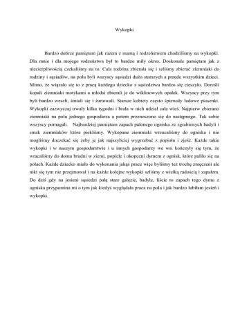 Wykopki Bardzo dobrze pamiętam jak razem z mamą i rodzeństwem chodziliśmy na wykopki. Dla mnie i dla mojego rodzeństwa był to bardzo miły okres. Doskonale pamiętam jak z niecierpliwością czekaliśmy na to. Cala rodzina zbierała się i szliśmy zbierać ziemniaki do rodziny i sąsiadów, na polu byli wszyscy sąsiedzi dużo starszych a przede wszystkim dzieci. Mimo, że wiązało się to z pracą każdego dziecko z sąsiedztwa bardzo się cieszyło. Dorośli kopali ziemniaki motykami a młodsi zbierali je do wiklinowych opałek. Wszyscy przy tym byli bardzo weseli, śmiali się i żartowali. Starsze kobiety często śpiewały ludowe piosenki. Wykopki zazwyczaj trwały kilka tygodni i brała w nich udział cała wieś. Najpierw zbierano ziemniaki na polu jednego gospodarza a potem przenoszono się do następnego. Tak sobie wszyscy pomagali. Najbardziej pamiętam zapach palonego ogniska ze zgrabionych badyli i smak ziemniaków które piekliśmy. Wykopane ziemniaki wrzucaliśmy do ogniska i nie mogliśmy doczekać się żeby je jak najszybciej wygrzebać z popiołu i zjeść. Każde takie wykopki i w naszym gospodarstwie i u innych gospodarzy we wsi kończyły się tym, że wracaliśmy do domu brudni w ziemi, popiele i okopceni dymem z ognisk, które paliło się na polach. Każde dziecko miało do wykonania jakąś prace więc byliśmy tez trochę zmęczeni ale nikt się tym nie przejmował i na każde kolejne wykopki szliśmy z wielką radością i zapałem. Do dziś gdy na jesieni sąsiedzi palą stare gałęzie, badyle, liście to zapach tego dymu z ogniska przypomina mi o tym jak kiedyś wyglądała praca na polu i jak bardzo lubiłam jesień i wykopki.