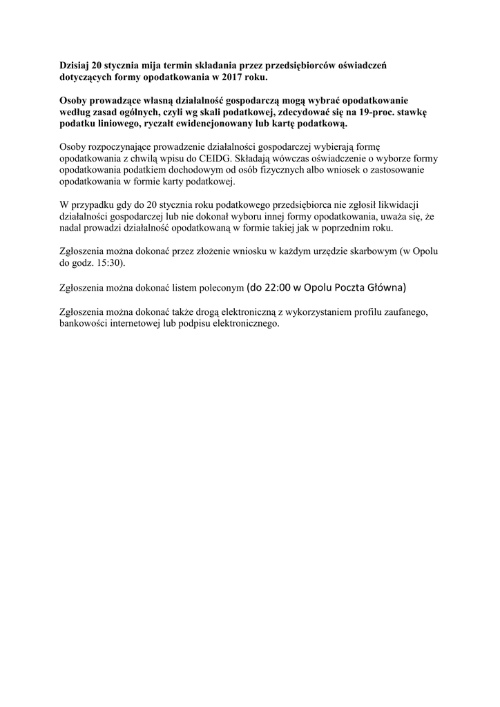 Dzisiaj 20 stycznia mija termin składania przez przedsiębiorców oświadczeń dotyczących formy opodatkowania w 2017 roku. Osoby prowadzące własną działalność gospodarczą mogą wybrać opodatkowanie według zasad ogólnych, czyli wg skali podatkowej, zdecydować się na 19-proc. stawkę podatku liniowego, ryczałt ewidencjonowany lub kartę podatkową. Osoby rozpoczynające prowadzenie działalności gospodarczej wybierają formę opodatkowania z chwilą wpisu do CEIDG. Składają wówczas oświadczenie o wyborze formy opodatkowania podatkiem dochodowym od osób fizycznych albo wniosek o zastosowanie opodatkowania w formie karty podatkowej. W przypadku gdy do 20 stycznia roku podatkowego przedsiębiorca nie zgłosił likwidacji działalności gospodarczej lub nie dokonał wyboru innej formy opodatkowania, uważa się, że nadal prowadzi działalność opodatkowaną w formie takiej jak w poprzednim roku. Zgłoszenia można dokonać przez złożenie wniosku w każdym urzędzie skarbowym (w Opolu do godz. 15:30). Zgłoszenia można dokonać listem poleconym (do 22:00 w Opolu Poczta Główna) Zgłoszenia można dokonać także drogą elektroniczną z wykorzystaniem profilu zaufanego, bankowości internetowej lub podpisu elektronicznego.