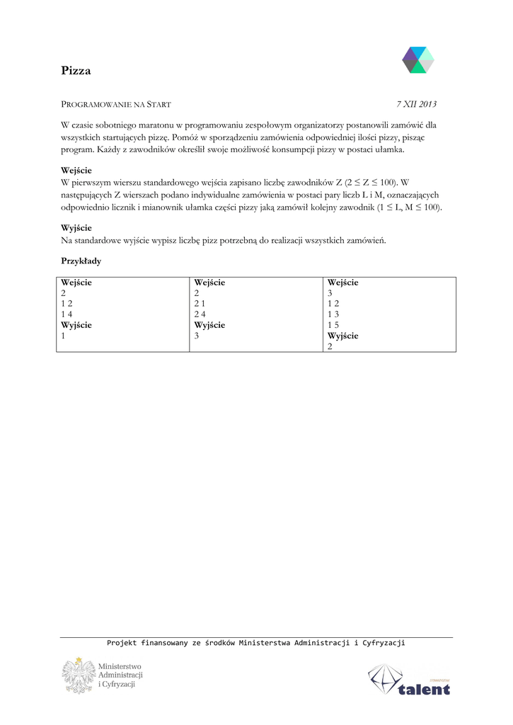 Pizza PROGRAMOWANIE NA START 7 XII 2013 W czasie sobotniego maratonu w programowaniu zespołowym organizatorzy postanowili zamówić dla wszystkich startujących pizzę. Pomóż w sporządzeniu zamówienia odpowiedniej ilości pizzy, pisząc program. Każdy z zawodników określił swoje możliwość konsumpcji pizzy w postaci ułamka. Wejście W pierwszym wierszu standardowego wejścia zapisano liczbę zawodników Z (2 ≤ Z ≤ 100). W następujących Z wierszach podano indywidualne zamówienia w postaci pary liczb L i M, oznaczających odpowiednio licznik i mianownik ułamka części pizzy jaką zamówił kolejny zawodnik (1 ≤ L, M ≤ 100). Wyjście Na standardowe wyjście wypisz liczbę pizz potrzebną do realizacji wszystkich zamówień. Przykłady Wejście 2 12 14 Wyjście 1 Wejście 2 21 24 Wyjście 3 Wejście 3 12 13 15 Wyjście 2 Projekt finansowany ze środków Ministerstwa Administracji i Cyfryzacji
