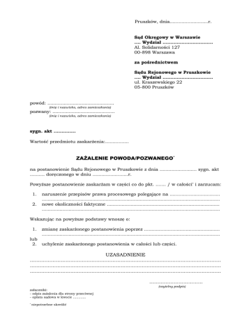 Pruszków, dnia..........................r. Sąd Okręgowy w Warszawie .... Wydział ................................ Al. Solidarności 127 00-898 Warszawa za pośrednictwem Sądu Rejonowego w Pruszkowie .... Wydział ................................ ul. Kraszewskiego 22 05-800 Pruszków powód: ............................................. (imię i nazwisko, adres zamieszkania) pozwany: .......................................... (imię i nazwisko, adres zamieszkania) sygn. akt .............. Wartość przedmiotu zaskarżenia:................ ZAŻALENIE POWODA/POZWANEGO* na postanowienie Sądu Rejonowego w Pruszkowie z dnia ......................... sygn. akt .......... doręczonego w dniu ........................r. Powyższe postanowienie zaskarżam w części co do pkt. ....... / w całości* i zarzucam: 1. 2. naruszenie przepisów prawa procesowego polegające na .................................. ........................................................................................................................ nowe okoliczności faktyczne ............................................................................ ........................................................................................................................ Wskazując na powyższe podstawy wnoszę o: 1. zmianę zaskarżonego postanowienia poprzez ................................................... ........................................................................................................................ lub 2. uchylenie zaskarżonego postanowienia w całości lub części. UZASADNIENIE ...................................................................................................................... ...................................................................................................................... ...................................................................................................................... ................................. (czytelny podpis) załączniki: - odpis zażalenia dla strony przeciwnej - opłata sądowa w kwocie ............ * niepotrzebne skreślić
