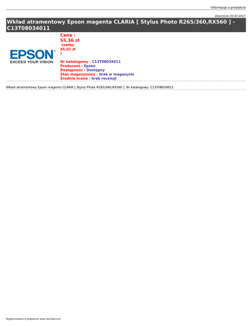 Informacje o produkcie Utworzono 03-03-2017 Wkład atramentowy Epson magenta CLARIA [ Stylus Photo R265/360,RX560 ] C13T08034011 Cena : 55,36 zł (netto: 45,01 zł ) Nr katalogowy : C13T08034011 Producent : Epson Dostępność : Dostępny Stan magazynowy : brak w magazynie Średnia ocena : brak recenzji Wkład atramentowy Epson magenta CLARIA [ Stylus Photo R265/360,RX560 ]. Nr katalogowy: C13T08034011 Wygenerowano w programie www.oscGold.com