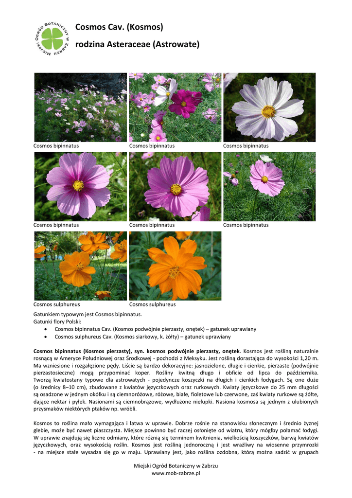 Cosmos Cav. (Kosmos) rodzina Asteraceae (Astrowate) Cosmos bipinnatus Cosmos bipinnatus Cosmos bipinnatus Cosmos bipinnatus Cosmos bipinnatus Cosmos bipinnatus Cosmos sulphureus Cosmos sulphureus Gatunkiem typowym jest Cosmos bipinnatus. Gatunki flory Polski: • Cosmos bipinnatus Cav. (Kosmos podwójnie pierzasty, onętek) – gatunek uprawiany • Cosmos sulphureus Cav. (Kosmos siarkowy, k. żółty) – gatunek uprawiany Cosmos bipinnatus (Kosmos pierzasty), syn. kosmos podwójnie pierzasty, onętek. Kosmos jest rośliną naturalnie rosnącą w Ameryce Południowej oraz Środkowej - pochodzi z Meksyku. Jest rośliną dorastająca do wysokości 1,20 m. Ma wzniesione i rozgałęzione pędy. Liście są bardzo dekoracyjne: jasnozielone, długie i cienkie, pierzaste (podwójnie pierzastosieczne) mogą przypominać koper. Rośliny kwitną długo i obficie od lipca do października. Tworzą kwiatostany typowe dla astrowatych - pojedyncze koszyczki na długich i cienkich łodygach. Są one duże (o średnicy 8–10 cm), zbudowane z kwiatów języczkowych oraz rurkowych. Kwiaty języczkowe do 25 mm długości są osadzone w jednym okółku i są ciemnoróżowe, różowe, białe, fioletowe lub czerwone, zaś kwiaty rurkowe są żółte, dające nektar i pyłek. Nasionami są ciemnobrązowe, wydłużone niełupki. Nasiona kosmosa są jednym z ulubionych przysmaków niektórych ptaków np. wróbli. Kosmos to roślina mało wymagająca i łatwa w uprawie. Dobrze rośnie na stanowisku słonecznym i średnio żyznej glebie, może być nawet piaszczysta. Miejsce powinno być raczej osłonięte od wiatru, który mógłby połamać łodygi. W uprawie znajdują się liczne odmiany, które różnią się terminem kwitnienia, wielkością koszyczków, barwą kwiatów języczkowych, oraz wysokością roślin. Kosmos jest rośliną jednoroczną i jest wrażliwy na wiosenne przymrozki - na miejsce stałe wysadza się go w maju. Uprawiany jest, jako roślina ozdobna, którą można sadzić w grupach Miejski Ogród Botaniczny w Zabrzu www.mob-zabrze.pl Cosmos Cav. (Kosmos) rodzina Asteraceae (Astrowate) na rabatach, oraz wykorzystuje, jako kwiat cięty (długo utrzymuje świeżość w wazonie - nawet tydzień). Ze względu na swoją wysokość może stanowić piękną osłonę dla brzydkich miejsc. Rozmnaża się go przez siew nasion. Kosmos tworzy samosiewy - sam się rozsiewa i może rosnąć na tym samym miejscu nawet kilkanaście lat. Cosmos sulphureus Cav. - kosmos żółty (kosmos siarkowy) - naturalnie występuje w Meksyku oraz Brazylii, gdzie dorasta do wysokości 90 cm. W naszych warunkach jest rośliną jednoroczną o wysokości około 60-80 cm, choć bywają niższe odmiany. Pędy ma silnie rozgałęzione. Liście są jasnozielone, podwójnie pierzaste, przypominające liście koperku, choć nieco szersze (także szersze od poprzedniego gatunku). Kwiaty są mniejsze, ale jest ich bardzo dużo - języczkowate są pomarańczowe lub żółte, rurkowate stosunkowo długie i lekko wystające. Kwitnie od lipca do października, przyciągając wiele gatunków motyli. Nasiona - ciemnobrązowe niełupki, są podobne do nasion Cosmos bipinnatus, lecz są bardziej wydłużone. Cosmos sulphureus wymaga stanowiska słonecznego, ciepłego i osłoniętego - gatunek ciepłolubny. Nie należy on jednak do roślin wymagających, najlepiej rośnie na średnio żyznej glebie. Kosmos jest efektowną rośliną ozdobną z kwiatów i może być wykorzystywany do sadzenia na rabatach, najlepiej sadzony w grupach ogrodowych. Nadaje się także na kwiat cięty oraz do suchych bukietów. W tym gatunku także wyhodowano dużo odmian, które różnią się barwą kwiatów, wielkością i wysokością roślin. Rozmnażamy je przez wysiew nasion - można siać bezpośrednio do gruntu w maju. Miejski Ogród Botaniczny w Zabrzu www.mob-zabrze.pl