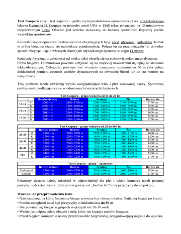 Test Coopera (czyt. test kupera) – próba wytrzymałościowa opracowana przez amerykańskiego lekarza Kennetha H. Coopera na potrzeby armii USA w 1968 roku, polegająca na 12-minutowym nieprzerwanym biegu. Obecnie jest szeroko stosowany do badania sprawności fizycznej przede wszystkim sportowców. Kenneth Cooper opracował zestaw ćwiczeń obejmujących bieg, chód, pływanie i kolarstwo. Jednak to próba biegowa cieszy się największą popularnością. Polega on na przemierzeniu (w dowolny sposób: biegnąc, idąc o własnych siłach) jak największego dystansu w ciągu 12 minut. Kondycję fizyczną, w zależności od wieku i płci określa się na podstawie pokonanego dystansu. Próba biegowa 12-minutowa powinna odbywać się na miękkiej nawierzchni najlepiej na stadionie lekkoatletycznym. Odległości powinny być wyraźnie oznaczone minimum co 50 m (dla pełnej dokładności pomiaru czterech sędziów dystansowych na obwodzie bieżni lub co sto metrów na innej trasie). Trzy poniższe tabele zawierają wyniki uwzględniające wiek i płeć testowanej osoby. Sportowcy profesjonalni podlegają ocenie w odmiennych (wyższych) kryteriach. M K M K M K Bardzo dobrze 2700+ m 2000+ m 2800+ m 2100+ m 3000+ m 2300+ m Test Coopera - grupa wiekowa od 13 do 20 lat Dobrze Średnio Źle 2400–2700 m 2200–2399 m 2100–2199 m 1900–2000 m 1600–1899 m 1500–1599 m 2500–2800 m 2300–2499 m 2200–2299 m 2000–2100 m 1700–1999 m 1600–1699 m 2700–3000 m 2500–2699 m 2300–2499 m 2100–2300 m 1800–2099 m 1700–1799 m Bardzo źle 2100- m 1500- m 2200- m 1600- m 2300- m 1700- m M K M K M K M K Bardzo dobrze 2800+ m 2700+ m 2700+ m 2500+ m 2500+ m 2300+ m 2400+ m 2200+ m Test Coopera – grupa wiekowa od 20 do 50+ lat Dobrze Średnio Źle 2400–2800 m 2200–2399 m 1600–2199 m 2200–2700 m 1800–2199 m 1500–1799 m 2300–2700 m 1900–2299 m 1500–1899 m 2000–2500 m 1700–1999 m 1400–1699 m 2100–2500 m 1700–2099 m 1400–1699 m 1900–2300 m 1500–1899 m 1200–1499 m 2000–2400 m 1600–1999 m 1300–1599 m 1700–2200 m 1400–1699 m 1100–1399 m Bardzo źle 1600- m 1500- m 1500- m 1400- m 1400- m 1200- m 1300- m 1100- m Mężczyźni Kobiety Bardzo dobrze 3700+ m 3000+ m 13-14 15-16 17-20 20-29 30-39 40-49 50+ Test Coopera – grupa – sportowcy Dobrze Średnio 3400–3700 m 3100–3399 m 2700–3000 m 2400–2699 m Źle 2800–3099 m 2100–2399 m Bardzo źle 2800- m 2100- m Pokonany dystans należy odnaleźć w odpowiedniej dla płci i wieku komórce tabeli podanej powyżej i odczytać wynik. Jeśli jest on gorszy niż „bardzo źle” to są przyczyny do niepokoju... Warunki do przeprowadzenia testu • Nawierzchnia, na której będziemy biegać powinna być równa i płaska. Najlepiej biegać po bieżni. • Pomiar odległości musi być precyzyjny z dokładnością do 50 m. • Nie powinno się biegać w grupach większych niż 20-30 osób. • Ważne jest odpowiednie obuwie i strój, który nie krępuje ruchów biegacza. • Przed biegiem koniecznie należy przeprowadzić rozgrzewkę, przygotowującą mięśnie do wysiłku.