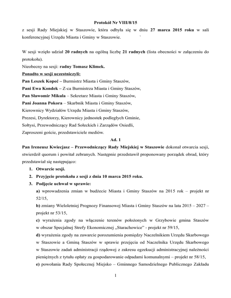 Protokół Nr VIII/8/15 z sesji Rady Miejskiej w Staszowie, która odbyła się w dniu 27 marca 2015 roku w sali konferencyjnej Urzędu Miasta i Gminy w Staszowie. ` W sesji wzięło udział 20 radnych na ogólną liczbę 21 radnych (lista obecności w załączeniu do protokołu). Nieobecny na sesji: radny Tomasz Klimek. Ponadto w sesji uczestniczyli: Pan Leszek Kopeć – Burmistrz Miasta i Gminy Staszów, Pani Ewa Kondek – Z-ca Burmistrza Miasta i Gminy Staszów, Pan Sławomir Mikula – Sekretarz Miasta i Gminy Staszów, Pani Joanna Pokora – Skarbnik Miasta i Gminy Staszów, Kierownicy Wydziałów Urzędu Miasta i Gminy Staszów, Prezesi, Dyrektorzy, Kierownicy jednostek podległych Gminie, Sołtysi, Przewodniczący Rad Sołeckich i Zarządów Osiedli, Zaproszeni goście, przedstawiciele mediów. Ad. 1 Pan Ireneusz Kwiecjasz – Przewodniczący Rady Miejskiej w Staszowie dokonał otwarcia sesji, stwierdził quorum i powitał zebranych. Następnie przedstawił proponowany porządek obrad, który przedstawiał się następująco: 1. Otwarcie sesji. 2. Przyjęcie protokołu z sesji z dnia 10 marca 2015 roku. 3. Podjęcie uchwał w sprawie: a) wprowadzenia zmian w budżecie Miasta i Gminy Staszów na 2015 rok – projekt nr 52/15, b) zmiany Wieloletniej Prognozy Finansowej Miasta i Gminy Staszów na lata 2015 – 2027 – projekt nr 53/15, c) wyrażenia zgody na włączenie terenów położonych w Grzybowie gmina Staszów w obszar Specjalnej Strefy Ekonomicznej „Starachowice” - projekt nr 59/15, d) wyrażenia zgody na zawarcie porozumienia pomiędzy Naczelnikiem Urzędu Skarbowego w Staszowie a Gminą Staszów w sprawie przejęcia od Naczelnika Urzędu Skarbowego w Staszowie zadań administracji rządowej z zakresu egzekucji administracyjnej należności pieniężnych z tytułu opłaty za gospodarowanie odpadami komunalnymi – projekt nr 58/15, e) powołania Rady Społecznej Miejsko – Gminnego Samodzielnego Publicznego Zakładu 1 Opieki Zdrowotnej w Staszowie – projekt nr 50/15, f) nadania odznaki okolicznościowej „Zasłużony dla Miasta” - projekt nr 54/15, g) nadania odznaki okolicznościowej „Zasłużony dla Miasta” - projekt nr 55/15, h) nadania odznaki okolicznościowej „Zasłużony dla Miasta” - projekt nr 56/15, i) nadania odznaki okolicznościowej „Zasłużony dla Miasta” - projekt nr 57/15, j) wyrażenia zgody na ustanowienie służebności przesyłu na rzecz Farmy Wiatrowej Bogoria Sp. z o. o. z siedzibą w Krakowie – projekt nr 49/15, k) ustalenia wysokości i zasad wypłacania diet dla radnych Rady Miejskiej w Staszowie oraz należności z tytułu zwrotu kosztów podróży służbowych – projekt nr 51/15. 4. Interpelacje radnych. 5. Wolne wnioski i zapytania w tym: - sprawozdanie z działalności Komisji Rewizyjnej Rady Miejskiej w Staszowie za 2014 rok. - informacja z realizacji interpelacji i wniosków zgłoszonych na sesji Rady Miejskiej w Staszowie w dniu 19.02.2015 r. 6. Zamknięcie obrad sesji. Radni nie zgłosili uwag do porządku obrad i zatwierdzili go jednogłośnie (obecnych było 20 radnych). Ad. 2 Radni nie mieli uwag do protokołu z sesji z dnia 10 marca 2015 roku i przyjęli go jednomyślnie (obecnych było 20 radnych). Ad. 3 a Pani Joanna Pokora – Skarbnik Miasta i Gminy Staszów przedstawiła projekt uchwały w sprawie wprowadzenia zmian w budżecie Miasta i Gminy Staszów na 2015 rok – projekt nr 52/15. Nie podjęto dyskusji. Projekt uchwały został poddany pod głosowanie. Rada Miejska jednomyślnie (obecnych było 20 radnych) podjęła Uchwałę Nr VIII/45/15 (w załączeniu do protokołu). Ad. 3 b Pani Joanna Pokora zapoznała z projektem uchwały w sprawie zmiany Wieloletniej Prognozy Finansowej Miasta i Gminy Staszów na lata 2015 – 2027 – projekt nr 53/15. Radni nie podjęli dyskusji, nie zgłosili pytań, uwag. 2 Projekt uchwały został poddany pod głosowanie. Rada Miejska jednomyślnie (obecnych było 20 radnych) podjęła Uchwałę Nr VIII/46/15 (w załączeniu do protokołu). Ad. 3 c Pani Alina Kuszła – główny specjalista w Wydziale Inwestycji, Planowania Przestrzennego i Pozyskiwania Środków Finansowych zapoznała z projektem uchwały w sprawie wyrażenia zgody na włączenie terenów położonych w Grzybowie gmina Staszów w obszar Specjalnej Strefy Ekonomicznej „Starachowice” - projekt nr 59/15. Nie podjęto dyskusji. Pan Ireneusz Kwiecjasz poddał pod głosowanie projekt uchwały. Rada Miejska jednomyślnie (obecnych było 20 radnych) podjęła Uchwałę Nr VIII/47/15 (w załączeniu do protokołu). Ad. 3 d Pan Sławomir Mikula – Sekretarz Miasta i Gminy Staszów przedstawił projekt uchwały w sprawie wyrażenia zgody na zawarcie porozumienia pomiędzy Naczelnikiem Urzędu Skarbowego w Staszowie a Gminą Staszów w sprawie przejęcia od Naczelnika Urzędu Skarbowego w Staszowie zadań administracji rządowej z zakresu egzekucji administracyjnej należności pieniężnych z tytułu opłaty za gospodarowanie odpadami komunalnymi – projekt nr 58/15. Nie podjęto dyskusji. Projekt uchwały został poddany pod głosowanie. Rada Miejska jednomyślnie (obecnych było 20 radnych) podjęła Uchwałę Nr VIII/48/15 (w załączeniu do protokołu). Ad. 3 e Pani Sylwia Dyl – Kierownik Wydziału Spraw Obywatelskich i Społecznych zapoznała z projektem uchwały w sprawie powołania Rady Społecznej Miejsko – Gminnego Samodzielnego Publicznego Zakładu Opieki Zdrowotnej w Staszowie – projekt nr 50/15. Paragraf 2 otrzymał brzmienie: ” Pierwsze posiedzenie Rady Społecznej w składzie powołanym jak w paragrafie 1 zwołuje się na dzień 27 marca 2015 roku, godz. 15 30 w siedzibie Urzędu Miasta i Gminy w Staszowie.” Radni nie podjęli dyskusji. Projekt uchwały został poddany pod głosowanie. 3 Rada Miejska przy 12 głosach za, 3 głosach przeciw i 5 głosach wstrzymujących się (obecnych było 20 radnych) podjęła Uchwałę Nr VIII/49/15 (w załączeniu do protokołu). Ad. 3 f Pan Sław