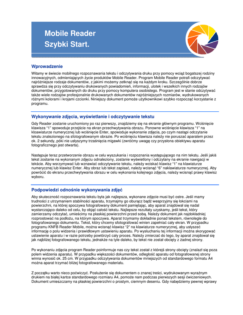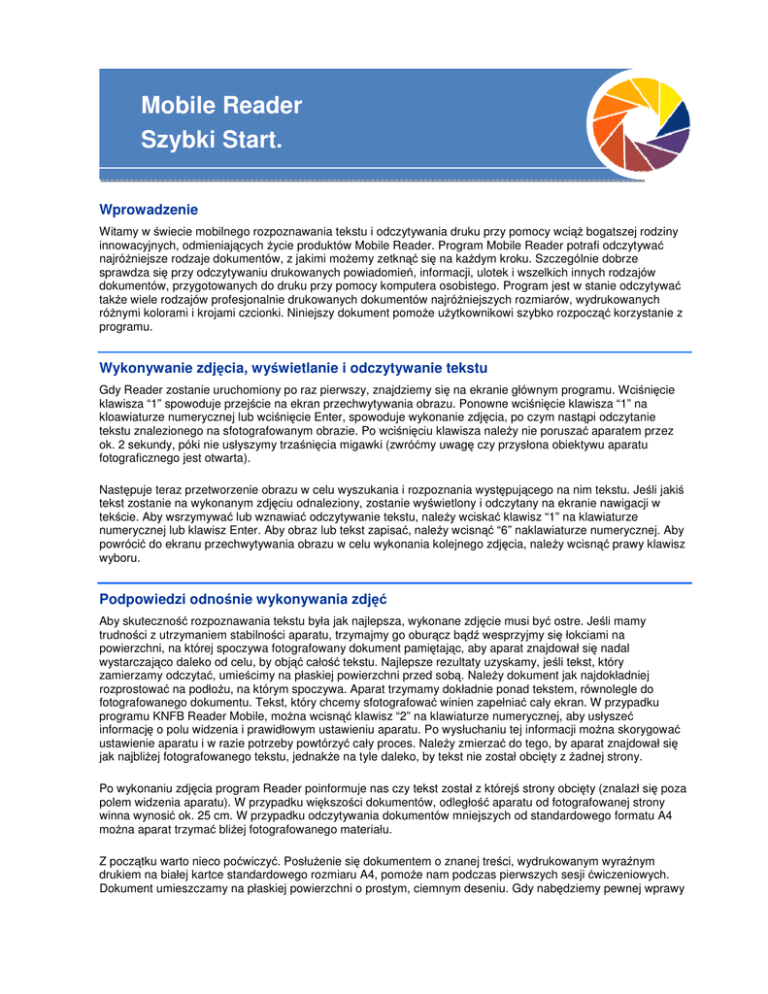 Mobile Reader Szybki Start. Wprowadzenie Witamy w świecie mobilnego rozpoznawania tekstu i odczytywania druku przy pomocy wciąż bogatszej rodziny innowacyjnych, odmieniających życie produktów Mobile Reader. Program Mobile Reader potrafi odczytywać najróżniejsze rodzaje dokumentów, z jakimi możemy zetknąć się na każdym kroku. Szczególnie dobrze sprawdza się przy odczytywaniu drukowanych powiadomień, informacji, ulotek i wszelkich innych rodzajów dokumentów, przygotowanych do druku przy pomocy komputera osobistego. Program jest w stanie odczytywać także wiele rodzajów profesjonalnie drukowanych dokumentów najróżniejszych rozmiarów, wydrukowanych różnymi kolorami i krojami czcionki. Niniejszy dokument pomoże użytkownikowi szybko rozpocząć korzystanie z programu. Wykonywanie zdjęcia, wyświetlanie i odczytywanie tekstu Gdy Reader zostanie uruchomiony po raz pierwszy, znajdziemy się na ekranie głównym programu. Wciśnięcie klawisza “1” spowoduje przejście na ekran przechwytywania obrazu. Ponowne wciśnięcie klawisza “1” na kloawiaturze numerycznej lub wciśnięcie Enter, spowoduje wykonanie zdjęcia, po czym nastąpi odczytanie tekstu znalezionego na sfotografowanym obrazie. Po wciśnięciu klawisza należy nie poruszać aparatem przez ok. 2 sekundy, póki nie usłyszymy trzaśnięcia migawki (zwróćmy uwagę czy przysłona obiektywu aparatu fotograficznego jest otwarta). Następuje teraz przetworzenie obrazu w celu wyszukania i rozpoznania występującego na nim tekstu. Jeśli jakiś tekst zostanie na wykonanym zdjęciu odnaleziony, zostanie wyświetlony i odczytany na ekranie nawigacji w tekście. Aby wsrzymywać lub wznawiać odczytywanie tekstu, należy wciskać klawisz “1” na klawiaturze numerycznej lub klawisz Enter. Aby obraz lub tekst zapisać, należy wcisnąć “6” naklawiaturze numerycznej. Aby powrócić do ekranu przechwytywania obrazu w celu wykonania kolejnego zdjęcia, należy wcisnąć prawy klawisz wyboru. Podpowiedzi odnośnie wykonywania zdjęć Aby skuteczność rozpoznawania tekstu była jak najlepsza, wykonane zdjęcie musi być ostre. Jeśli mamy trudności z utrzymaniem stabilności aparatu, trzymajmy go oburącz bądź wesprzyjmy się łokciami na powierzchni, na której spoczywa fotografowany dokument pamiętając, aby aparat znajdował się nadal wystarczająco daleko od celu, by objąć całość tekstu. Najlepsze rezultaty uzyskamy, jeśli tekst, który zamierzamy odczytać, umieścimy na płaskiej powierzchni przed sobą. Należy dokument jak najdokładniej rozprostować na podłożu, na którym spoczywa. Aparat trzymamy dokładnie ponad tekstem, równolegle do fotografowanego dokumentu. Tekst, który chcemy sfotografować winien zapełniać cały ekran. W przypadku programu KNFB Reader Mobile, można wcisnąć klawisz “2” na klawiaturze numerycznej, aby usłyszeć informację o polu widzenia i prawidłowym ustawieniu aparatu. Po wysłuchaniu tej informacji można skorygować ustawienie aparatu i w razie potrzeby powtórzyć cały proces. Należy zmierzać do tego, by aparat znajdował się jak najbliżej fotografowanego tekstu, jednakże na tyle daleko, by tekst nie został obcięty z żadnej strony. Po wykonaniu zdjęcia program Reader poinformuje nas czy tekst został z którejś strony obcięty (znalazł się poza polem widzenia aparatu). W przypadku większości dokumentów, odległość aparatu od fotografowanej strony winna wynosić ok. 25 cm. W przypadku odczytywania dokumentów mniejszych od standardowego formatu A4 można aparat trzymać bliżej fotografowanego materiału. Z początku warto nieco poćwiczyć. Posłużenie się dokumentem o znanej treści, wydrukowanym wyraźnym drukiem na białej kartce standardowego rozmiaru A4, pomoże nam podczas pierwszych sesji ćwiczeniowych. Dokument umieszczamy na płaskiej powierzchni o prostym, ciemnym deseniu. Gdy nabędziemy pewnej wprawy w celowaniu i wykonywaniu zdjęć, zaczniemy czuć reakcje programu Reader. Nauczymy się też lepiej analizować i korygować te warunki otoczenia, które jesteśmy w stanie kontrolować, gdy uzyskane rezultaty nie spełniają naszych oczekiwań. Odrobina praktyki i wytrwałości może zdecydowanie poprawić uzyskiwane rezultaty. Pozyskiwanie pomocy Aby uzyskać pomoc, można zajrzeć do Instrukcji Obsługi. Jest ona dostępna z poziomu ekranu głównego programu poprzez wciśnięcie klawisza “6”. Na dowolnym ekranie, gdzie lewy klawisz wyboru (F1) oznaczony jest napisem “Opcje”, możemy przy jego pomocy wejść do Menu i przechodząc od jednej do drugiej jego opcji, usłyszeć informację o dostępnych komendach ekranowych oraz ich skrótach klawiszowych. W przypadku programu KNFB Reader Mobile możemy także na dowolnym ekranie wcisnąć i przytrzymać lewy lub prawy klawisz wyboru (F1 lub F2), aby usłyszeć, jaką w danym momencie pełni funkcję.