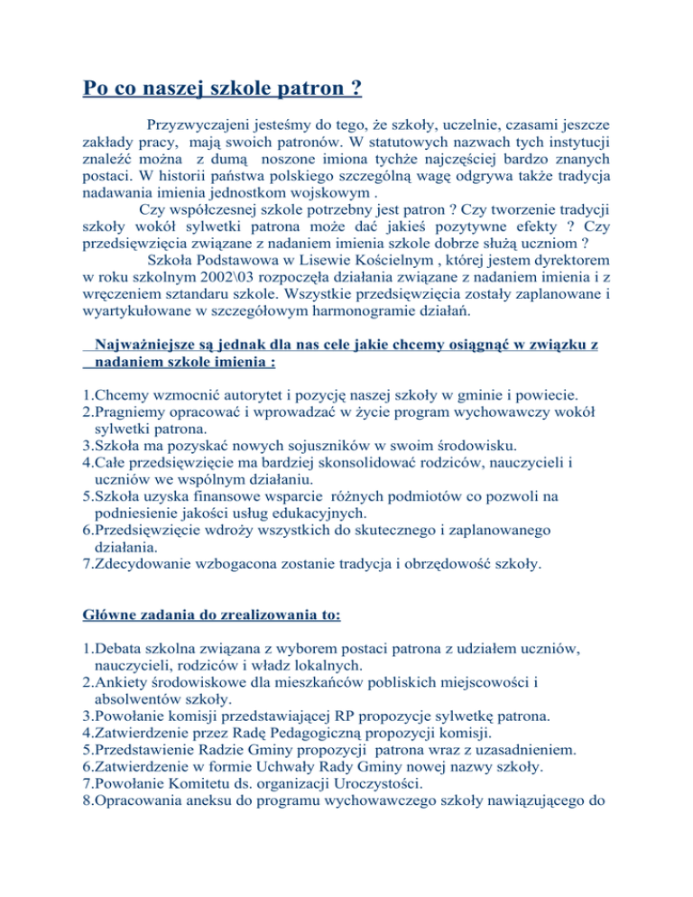Po co naszej szkole patron ? Przyzwyczajeni jesteśmy do tego, że szkoły, uczelnie, czasami jeszcze zakłady pracy, mają swoich patronów. W statutowych nazwach tych instytucji znaleźć można z dumą noszone imiona tychże najczęściej bardzo znanych postaci. W historii państwa polskiego szczególną wagę odgrywa także tradycja nadawania imienia jednostkom wojskowym . Czy współczesnej szkole potrzebny jest patron ? Czy tworzenie tradycji szkoły wokół sylwetki patrona może dać jakieś pozytywne efekty ? Czy przedsięwzięcia związane z nadaniem imienia szkole dobrze służą uczniom ? Szkoła Podstawowa w Lisewie Kościelnym , której jestem dyrektorem w roku szkolnym 2002\03 rozpoczęła działania związane z nadaniem imienia i z wręczeniem sztandaru szkole. Wszystkie przedsięwzięcia zostały zaplanowane i wyartykułowane w szczegółowym harmonogramie działań. Najważniejsze są jednak dla nas cele jakie chcemy osiągnąć w związku z nadaniem szkole imienia : 1.Chcemy wzmocnić autorytet i pozycję naszej szkoły w gminie i powiecie. 2.Pragniemy opracować i wprowadzać w życie program wychowawczy wokół sylwetki patrona. 3.Szkoła ma pozyskać nowych sojuszników w swoim środowisku. 4.Całe przedsięwzięcie ma bardziej skonsolidować rodziców, nauczycieli i uczniów we wspólnym działaniu. 5.Szkoła uzyska finansowe wsparcie różnych podmiotów co pozwoli na podniesienie jakości usług edukacyjnych. 6.Przedsięwzięcie wdroży wszystkich do skutecznego i zaplanowanego działania. 7.Zdecydowanie wzbogacona zostanie tradycja i obrzędowość szkoły. Główne zadania do zrealizowania to: 1.Debata szkolna związana z wyborem postaci patrona z udziałem uczniów, nauczycieli, rodziców i władz lokalnych. 2.Ankiety środowiskowe dla mieszkańców pobliskich miejscowości i absolwentów szkoły. 3.Powołanie komisji przedstawiającej RP propozycje sylwetkę patrona. 4.Zatwierdzenie przez Radę Pedagogiczną propozycji komisji. 5.Przedstawienie Radzie Gminy propozycji patrona wraz z uzasadnieniem. 6.Zatwierdzenie w formie Uchwały Rady Gminy nowej nazwy szkoły. 7.Powołanie Komitetu ds. organizacji Uroczystości. 8.Opracowania aneksu do programu wychowawczego szkoły nawiązującego do sylwetki patrona szkoły. • Zorganizowanie konkursu wiedzy o patronie • Przygotowanie dla środowiska wystawy tematycznie związanej z sylwetką wybranej osoby. • Opracowanie broszury o życiu i dokonaniach osoby wybranej. • Opracowanie działań wychowawczych pielęgnujących wśród młodzieży najcenniejsze cechy charakteru patrona. • Opracowanie cyklu 3 godzin do dyspozycji wychowawcy przybliżających wartości i postawy które reprezentował. 9. Powołanie wśród rodziców i nauczycieli zespołu ds. gromadzenia środków finansowych od sponsorów. 10.Przygotowanie szczegółowego scenariusza uroczystości. 11.Zaproszenie władz oświatowych i samorządowych. 12.Przygotowanie programu kulturalno- rekreacyjno - sportowego dla uczniów w dniu nadania imienia. 13.Analiza realizacji założonych celów. 14.Uwzględnienie roli patrona w strategii rozwoju szkoły. Zagrożenia które mogą wystąpić w realizacji przedsięwzięcia : • Trudności w pozyskiwaniu sojuszników, osób prywatnych, instytucji i władz. • Brak entuzjazmu ze strony nauczycieli, uczniów , rodziców i całego środowiska. • Brak środków finansowych. • Kontrowersje wokół sposobu wyłaniania patrona. • Wybór na patrona osoby kontrowersyjnej. • Spłycenie przedsięwzięcia tylko do zorganizowania samej uroczystości. Szanse, które szkoła przedsięwzięcia : • • • • • może wykorzystać w realizacji Istniejące już tradycje i ciekawa historia szkoły Doświadczenie w przygotowywaniu różnych imprez dla środowiska. Tradycyjnie dobra i bardzo dobra współpraca z Radą Rodziców Istniejący już dobry wizerunek szkoły w środowisku. Wykorzystanie doświadczeń innych szkół naszej gminy w realizacji zadania. Jak widać wybór patrona szkoły nie jest sprawą banalną, co najmniej roczne przygotowania muszą być dobrze przygotowane organizacyjnie, legislacyjnie i przede wszystkim powinny inicjować pracę wychowawczą. Nie możemy zapominać, że najważniejszy w całym przedsięwzięciu jest uczeń, który tak naprawdę nie ma we współczesnym świecie mocnych i trwałych wzorców do naśladowania. My jako szkoła musimy mu tę pustkę wypełnić. Naszym obowiązkiem jest zaprogramować tak nasze działania by odwrócić młodego człowieka od ekranu kinowego czy telewizyjnego i wskazać mu bardziej godne cechy do naśladowania, tak różne od populistycznej „szklanej sieczki”. Czy szkole potrzeba patrona ? Może wystarczy numer lub nazwa miejscowości ? My, nauczyciele z Lisewa Kościelnego postanowiliśmy, że chcemy patrona w nazwie naszej szkoły, historia naszej wsi i szkoły upoważnia nas do tego. Od listopada rozpoczynamy ciężką pracę i wierzę głęboko, że za rok zaprosimy Waszą Redakcję na uroczystość nadania imienia. Za możliwość publikacji dziękuje : Dyr. SP w Lisewie Kościelnym mgr Małgorzata Cybulska
