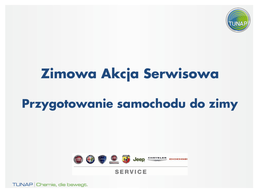 Zimowa Akcja Serwisowa Przygotowanie samochodu do zimy PRZYGOTOWANIE SAMOCHODU DO ZIMY - PALIWO Układy paliwowe w nowoczesnych silnikach są szczególnie wrażliwe na zmienna jakość paliwa i wymagają maksymalnej ochrony! W niskich temperaturach często występuje zjawisko wytrącania się kryształków parafiny z oleju napędowego, co prowadzi: Do przerwania przepływu paliwa oraz Do unieruchomienia silnika Niezmiernie istotnym w okresie zimowym elementem jest zabezpieczenie paliwa przed zamarzaniem. Oferujemy Państwu specjalnie do tego celu stworzony preparat poprawiający płynność oleju napędowego Micrologic® PREMIUM 187 następca sprawdzonego preparatu TUNAP 331 Nr kat. 59110654 2 PRZYGOTOWANIE SAMOCHODU DO ZIMY - ZAKRES USŁUGI • Smarowanie zawiasów drzwiowych oraz zamka maski silnika i bagażnika • Zabezpieczenie bębenków zamków drzwiowych • Zabezpieczenie uszczelek drzwiowych • Zabezpieczenie klem akumulatora 3 PRZYGOTOWANIE SAMOCHODU DO ZIMY - PRODUKTY MP 101 – Syntetyczny smar w aerozolu Właściwości: Znakomite właściwości smarujące Stabilny w zakresie temperatur od -400C do +1500C Bardzo dobra ochrona antykorozyjna Brak właściwości lepnych i czepnych Niezmienna skuteczność działania niezależnie od warunków atmosferycznych Znacząco redukuje tarcie i ścieranie Posiada przyjemny zapach Nr kat. 59110147 4 PRZYGOTOWANIE SAMOCHODU DO ZIMY - PRODUKTY MP 104 – Preparat do pielęgnacji wnętrz Plus Właściwości: Czyści i zabezpiecza przed ponownym zabrudzeniem oraz osadzaniem się kurzu Dzięki ochronie przed promieniowaniem UV zabezpiecza elementy przed przebarwieniami i odbarwieniami Regeneruje porysowane elementy z tworzyw sztucznych Pielęgnuje gumę i tworzywa sztuczne Odporny na przemarzanie do -400C Niweluje i zapobiega powstawaniu nieprzyjemnych odgłosów trzeszczenia, zgrzytania Znacznie zmniejsza tarcie dzięki beztłuszczowej, ochronnej powłoce poślizgowej Nr kat. 59110150 5 PRZYGOTOWANIE SAMOCHODU DO ZIMY - PRODUKTY TUNAP 377 – Preparat zabezpieczający klemy akumulatora Właściwości: Neutralne pH Odporny na kwas Znakomita ochrona antykorozyjna Odporny w zakresie temperatur od -40°C do +120°C Doskonale tolerowany przez wszystkie materiały używane w obszarze akumulatora i klem Nr kat. 59110172 6 PRZYGOTOWANIE SAMOCHODU DO ZIMY - ZAKRES USŁUGI Pełna usługa przygotowania samochodu do zimy obejmuje: Smarowanie uszczelek drzwiowych – nr kat. 59110150 Smarowanie zamków oraz zawiasów – nr kat. 59110147 Zabezpieczenie klem akumulatora – nr kat. 59110172 7