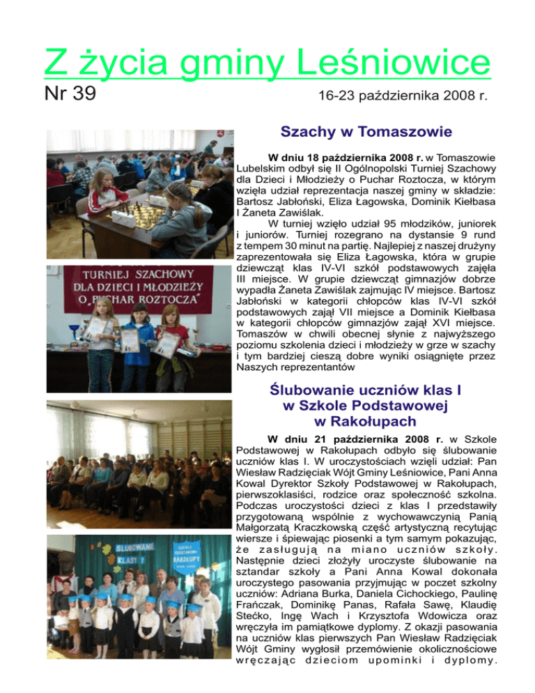 Z ¿ycia gminy Leœniowice Nr 39 16-23 paŸdziernika 2008 r. Szachy w Tomaszowie W dniu 18 paŸdziernika 2008 r. w Tomaszowie Lubelskim odby³ siê II Ogólnopolski Turniej Szachowy dla Dzieci i M³odzie¿y o Puchar Roztocza, w którym wziê³a udzia³ reprezentacja naszej gminy w sk³adzie: Bartosz Jab³oñski, Eliza £agowska, Dominik Kie³basa I ¯aneta Zawiœlak. W turniej wziê³o udzia³ 95 m³odzików, juniorek i juniorów. Turniej rozegrano na dystansie 9 rund z tempem 30 minut na partiê. Najlepiej z naszej dru¿yny zaprezentowa³a siê Eliza £agowska, która w grupie dziewcz¹t klas IV-VI szkó³ podstawowych zajê³a III miejsce. W grupie dziewcz¹t gimnazjów dobrze wypad³a ¯aneta Zawiœlak zajmuj¹c IV miejsce. Bartosz Jab³oñski w kategorii ch³opców klas IV-VI szkó³ podstawowych zaj¹³ VII miejsce a Dominik Kie³basa w kategorii ch³opców gimnazjów zaj¹³ XVI miejsce. Tomaszów w chwili obecnej s³ynie z najwy¿szego poziomu szkolenia dzieci i m³odzie¿y w grze w szachy i tym bardziej ciesz¹ dobre wyniki osi¹gniête przez Naszych reprezentantów Œlubowanie uczniów klas I w Szkole Podstawowej w Rako³upach W dniu 21 paŸdziernika 2008 r. w Szkole Podstawowej w Rako³upach odby³o siê œlubowanie uczniów klas I. W uroczystoœciach wziêli udzia³: Pan Wies³aw Radziêciak Wójt Gminy Leœniowice, Pani Anna Kowal Dyrektor Szko³y Podstawowej w Rako³upach, pierwszoklasiœci, rodzice oraz spo³ecznoœæ szkolna. Podczas uroczystoœci dzieci z klas I przedstawi³y przygotowan¹ wspólnie z wychowawczyni¹ Pani¹ Ma³gorzat¹ Kraczkowsk¹ czêœæ artystyczn¹ recytuj¹c wiersze i œpiewaj¹c piosenki a tym samym pokazuj¹c, ¿e zas³uguj¹ na miano uczniów szko³y. Nastêpnie dzieci z³o¿y³y uroczyste œlubowanie na sztandar szko³y a Pani Anna Kowal dokona³a uroczystego pasowania przyjmuj¹c w poczet szkolny uczniów: Adriana Burka, Daniela Cichockiego, Paulinê Frañczak, Dominikê Panas, Rafa³a Sawê, Klaudiê Steæko, Ingê Wach i Krzysztofa Wdowicza oraz wrêczy³a im pami¹tkowe dyplomy. Z okazji pasowania na uczniów klas pierwszych Pan Wies³aw Radziêciak Wójt Gminy wyg³osi³ przemówienie okolicznoœciowe wrêczaj¹c dzieciom upominki i dyplomy. Posiedzenie kierownictwa Urzêdu Gminy Leœniowice W dniu 22 paŸdziernika br. odby³o siê posiedzenie kierownictwa Urzêdu Gminy Leœniowice, podczas którego zosta³a rozpatrzona informacja dotycz¹ca prac nad zmianami w „Gminnej Strategii Rozwi¹zywania Problemów Spo³ecznych Gminy Lesniowice na lata 2008 2015”, oraz informacja z realizacji „Programu Funkcjonowania Oœwiaty w Gminie Leœniowice na lata 2004 2009”. Ponadto omawiany by³ projekt uchwa³y w sprawie zatwierdzania taryf za zbiorowe zaopatrzenie w wodê i zbiorowe odprowadzanie œcieków na 2009 rok oraz organizacja uroczystoœci Gminnych Obchodów 90 Rocznicy Odzyskania Niepodleg³oœci przez Polskê. Omówione zosta³y równie¿ bie¿¹ce sprawy funkcjonowania Urzêdu. Œlubowanie uczniów klas I w Szkole Podstawowej w Sielcu W dniu 22 paŸdziernika 2008 r. w Szkole Podstawowej w Sielcu odby³o siê œlubowanie uczniów klas I. W uroczystoœciach wziêli udzia³: Pan Wies³aw Radziêciak Wójt Gminy Leœniowice, Ksi¹dz Jacek Pyter Proboszcz Parafii Rzymskokatolickiej w Kumowie, Pani El¿bieta G³uszek Dyrektor Szko³y Podstawowej w Sielcu, tegoroczni uczniowie pierwszych klas, rodzice oraz spo³ecznoœæ szkolna. Podczas uroczystoœci dzieci z klasy I przedstawi³y przygotowan¹ wspólnie z wychowawczyni¹ Pani¹ El¿biet¹ Iwaniszczuk czêœæ artystyczn¹. Recytuj¹c wiersze, œpiewaj¹c piosenki oraz zdaj¹c krótki ustny test udowodni³y, ¿e zas³uguj¹ na przyjêcie ich w poczet uczniów szko³y. Po czêœci artystycznej dzieci z³o¿y³y uroczyste œlubowanie na sztandar flagowy a Pani El¿bieta G³uszek z³o¿y³a dzieciom ¿yczenia wielu szkolnych sukcesów a rodzicom radoœci z ich pociech. Nastêpnie dokona³a uroczystego pasowania przyjmuj¹c w poczet szko³y nastêpuj¹cych uczniów: Daniela Adamka, Karolinê Banachewicz, Justynê Bielak, Nataliê Bielak, Patryka Chy³ê, Nataliê Dargiel, Piotra Gajewskiego, Sebastiana Godlewskiego, Marcina Ha³aja, Ernesta Jonaszka, Karolinê Malinowsk¹, Dawida Lewkowicza, Paw³a Miazgê, Weronikê Nastaj, Miko³aja Pawliczuka, Krystiana Platê, Klaudiê Skowron, Sebastiana Staniuka, £ukasza Tarasiuka, Sebastiana To³ysza, Weronikê Wazelin, Jakuba Wolanina, Bartosza Wójcika i Kornela Zawadzkiego oraz wrêczy³a im pami¹tkowe akty.Z okazji pasowania na uczniów klas pierwszych Pan Wies³aw Radziêciak Wójt Gminy wyg³osi³ przemówienie okolicznoœciowe o wspólnie z Ks. Jackiem Pyterem wrêczyli dzieciom upominki i dyplomy ¿ycz¹c wielu sukcesów.