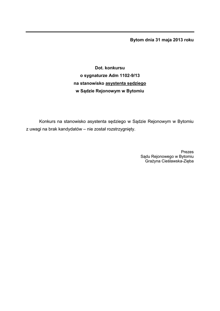 Bytom dnia 31 maja 2013 roku Dot. konkursu o sygnaturze Adm 1102-9/13 na stanowisko asystenta sędziego w Sądzie Rejonowym w Bytomiu Konkurs na stanowisko asystenta sędziego w Sądzie Rejonowym w Bytomiu z uwagi na brak kandydatów – nie został rozstrzygnięty. Prezes Sądu Rejonowego w Bytomiu Grażyna Cieślawska-Zięba