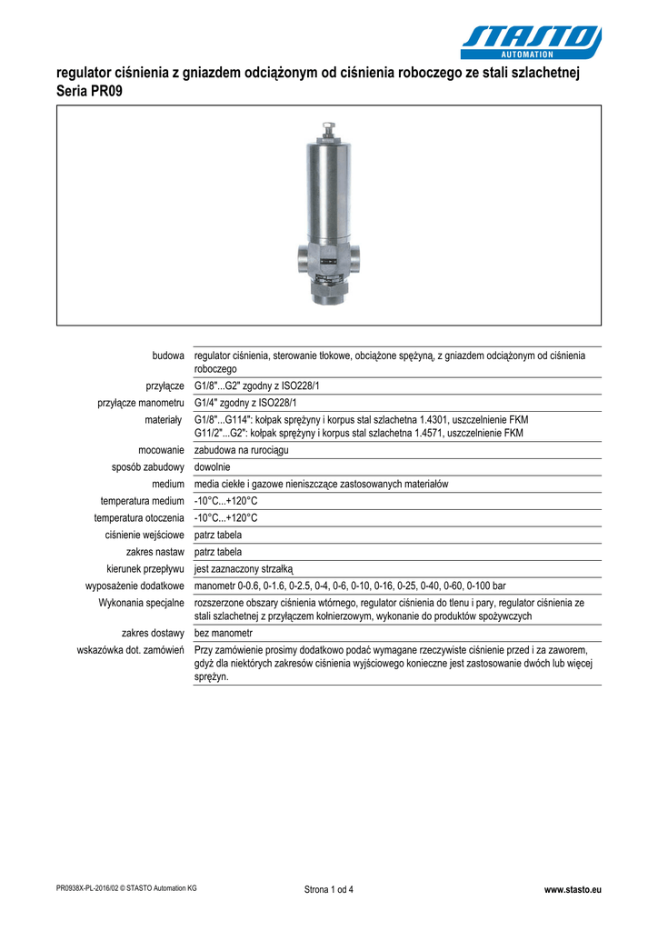 regulator ciśnienia z gniazdem odciążonym od ciśnienia roboczego ze stali szlachetnej Seria PR09 budowa regulator ciśnienia, sterowanie tłokowe, obciążone spężyną, z gniazdem odciążonym od ciśnienia roboczego przyłącze G1/8"...G2" zgodny z ISO228/1 przyłącze manometru G1/4" zgodny z ISO228/1 materiały G1/8"...G114": kołpak sprężyny i korpus stal szlachetna 1.4301, uszczelnienie FKM G11/2"...G2": kołpak sprężyny i korpus stal szlachetna 1.4571, uszczelnienie FKM mocowanie zabudowa na rurociągu sposób zabudowy dowolnie medium media ciekłe i gazowe nieniszczące zastosowanych materiałów temperatura medium -10°C...+120°C temperatura otoczenia -10°C...+120°C ciśnienie wejściowe patrz tabela zakres nastaw patrz tabela kierunek przepływu jest zaznaczony strzałką wyposażenie dodatkowe manometr 0-0.6, 0-1.6, 0-2.5, 0-4, 0-6, 0-10, 0-16, 0-25, 0-40, 0-60, 0-100 bar Wykonania specjalne rozszerzone obszary ciśnienia wtórnego, regulator ciśnienia do tlenu i pary, regulator ciśnienia ze stali szlachetnej z przyłączem kołnierzowym, wykonanie do produktów spożywczych zakres dostawy bez manometr wskazówka dot. zamówień Przy zamówienie prosimy dodatkowo podać wymagane rzeczywiste ciśnienie przed i za zaworem, gdyż dla niektórych zakresów ciśnienia wyjściowego konieczne jest zastosowanie dwóch lub więcej sprężyn. PR0938X-PL-2016/02 © STASTO Automation KG Strona 1 od 4 www.stasto.eu wymiary max. ciśnienie na wejściu* Hmax h L ciężar [kg] 6 16 149 36 58 1,1 G1/4" 8 16 149 36 58 1,1 G3/8" 10 63 205 48 70 1,8 G1/2" 15 100 275 58 90 3,7 G3/4" 20 63 275 58 90 3,7 G1" 25 63 300 68 105 5,2 G11/4" 32 63 300 68 105 5,2 G11/2" 40 63 325 85 145 9,6 G2" 50 40 325 85 145 9,6 DN G1/8" *Maksymalne dopuszczalne ciśnienie wejściowe jest uzależnione od ciśnienia wyjściowego. Rzeczywiste ciśnienie wejściowe nie może przekraczać 40-krotności rzeczywistego ciśnienia wyjściowego. PR0938X-PL-2016/02 © STASTO Automation KG Strona 2 od 4 www.stasto.eu zakresy regulacji ciśnienia wyjściowego wejście DN6, DN8 DN10 DN15, DN20 DN25, DN32 DN40, DN50 G1/8", G1/4" G3/8" G1/2", G3/4" G1", G11/4" G11/2", G2" - - - - 0,25 - 0,47 - - - - 0,36 - 0,72 - - - - 0,57 - 1,15 - - - - 1,00 - 2,00 - - - 0,25 - 0,50 0,80 - 1,60 - - - 0,40 - 0,83 1,40 - 2,80 - - - 0,65 - 1,30 1,60 - 3,20 - - - 1,00 - 2,00 - - - - 1,40 - 2,80 - - 0,35 - 0,6 0,35 - 0,54 1,70 - 3,50 1,40 - 2,80 - 0,40 - 0,90 0,50 - 0,94 2,40 - 4,80 2,40 - 4,80 - 0,60 - 1,30 0,70 - 1,50 3,00 - 6,10 2,70 - 5,70 - 0,80 - 1,70 1,00 - 2,40 - 3,50 - 6,90 - 1,00 - 2,20 1,80 - 3,80 - - - - 2,60 - 5,30 - - - 1,20 - 2,40 3,30 - 6,70 3,00 - 6,10 4,20 - 8,50 - 1,50 - 3,10 4,70 - 9,50 4,30 - 8,60 4,80 - 9,60 - 1,90 - 3,90 6,00 - 12,20 5,50 - 11,00 6,50 - 12,30 - - - 7,50 - 14,50 9,50 - 18,80 1,00 - 1,70 1,30 - 2,50 5,40 - 10,70 5,00 - 9,80 - 1,40 - 2,70 1,90 - 3,80 7,50 - 15,00 7,00 - 13,80 - 1,70 - 3,30 2,50 - 5,00 10,00 - 19,50 9,00 - 17,50 - 1,80 - 3,50 3,00 - 6,10 13,00 - 26,00 12,00 - 23,00 - 2,00 - 4,00 - - - - 2,40 - 4,80 - - - - 2,70 - 5,30 - - - - 2,80 - 5,60 - - - - 3,50 - 6,20 - - - - 5,00 - 7,70 - - - - - 2,50 - 5,00 11,00 - 21,00 - - - 3,70 - 7,50 15,00 - 30,00 - - - 5,00 - 9,80 20,00 - 38,00 - - - 6,00 - 12,20 26,00 - 52,00 - - - 7,00 - 14,40 - - - płyta tłoka Ø 99 Ø 84 Ø 64 Ø 48 Ø 38 Ø 27 PR0938X-PL-2016/02 © STASTO Automation KG Strona 3 od 4 www.stasto.eu diagram przepływu oś pionowa: prędkość przepływu w m/s oś pozioma: przepływ w m³/h Dla cieczy prędkość przepływu nie powinna przekraczać 2 m/s. Przy sprężonym powietrzu prędkość przepływu nie powinna przekraczać 20m/s. Przy użyciu diagramu sprężonego powietrza należy za wartość przepływu V wziąć robocze metry sześcienne na godzine. Robocze metry sześcienne oblicza się dzieląc normalne metry sześcienne przez ciśnienie absolutne = ciśnienie robocze + 1 [bar]. rysunki poglądowe Zmiany w konstrukcji, wymiarach i wykonaniu materiałowym zastrzeżone PR0938X-PL-2016/02 © STASTO Automation KG Strona 4 od 4 www.stasto.eu